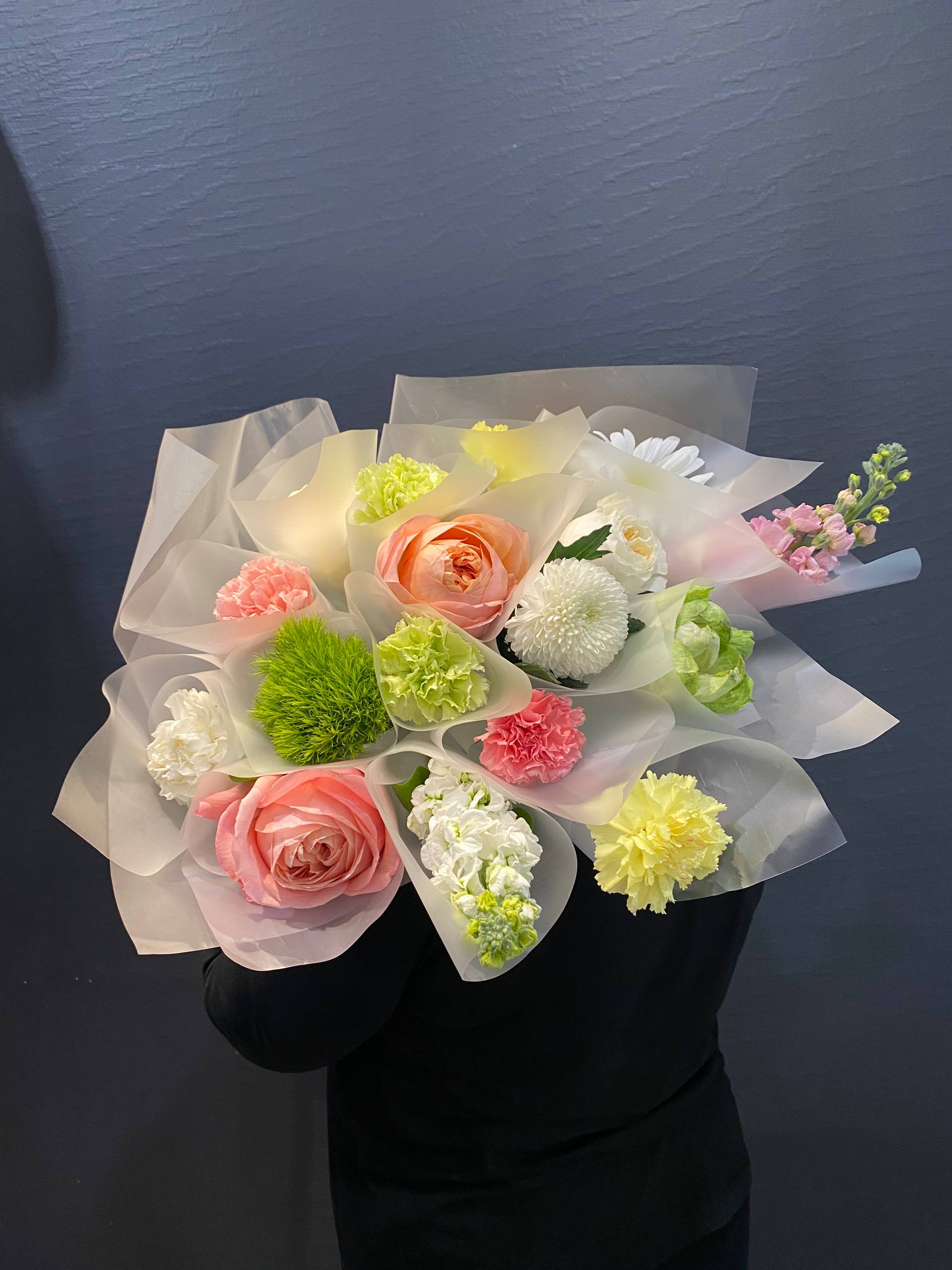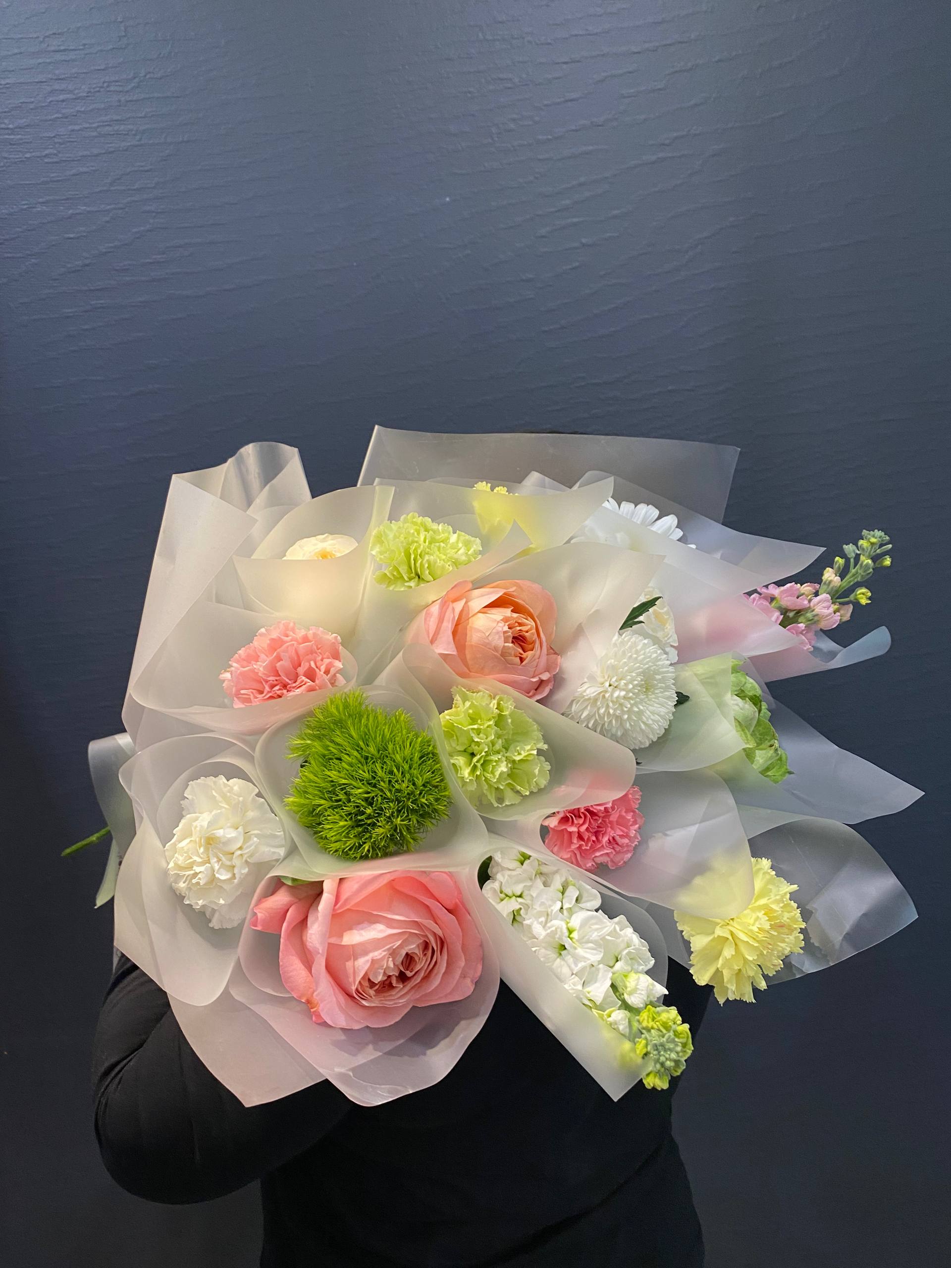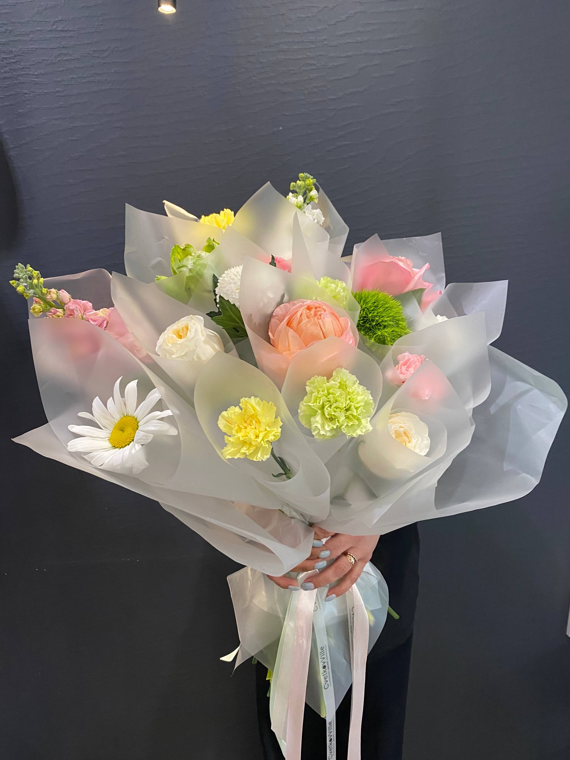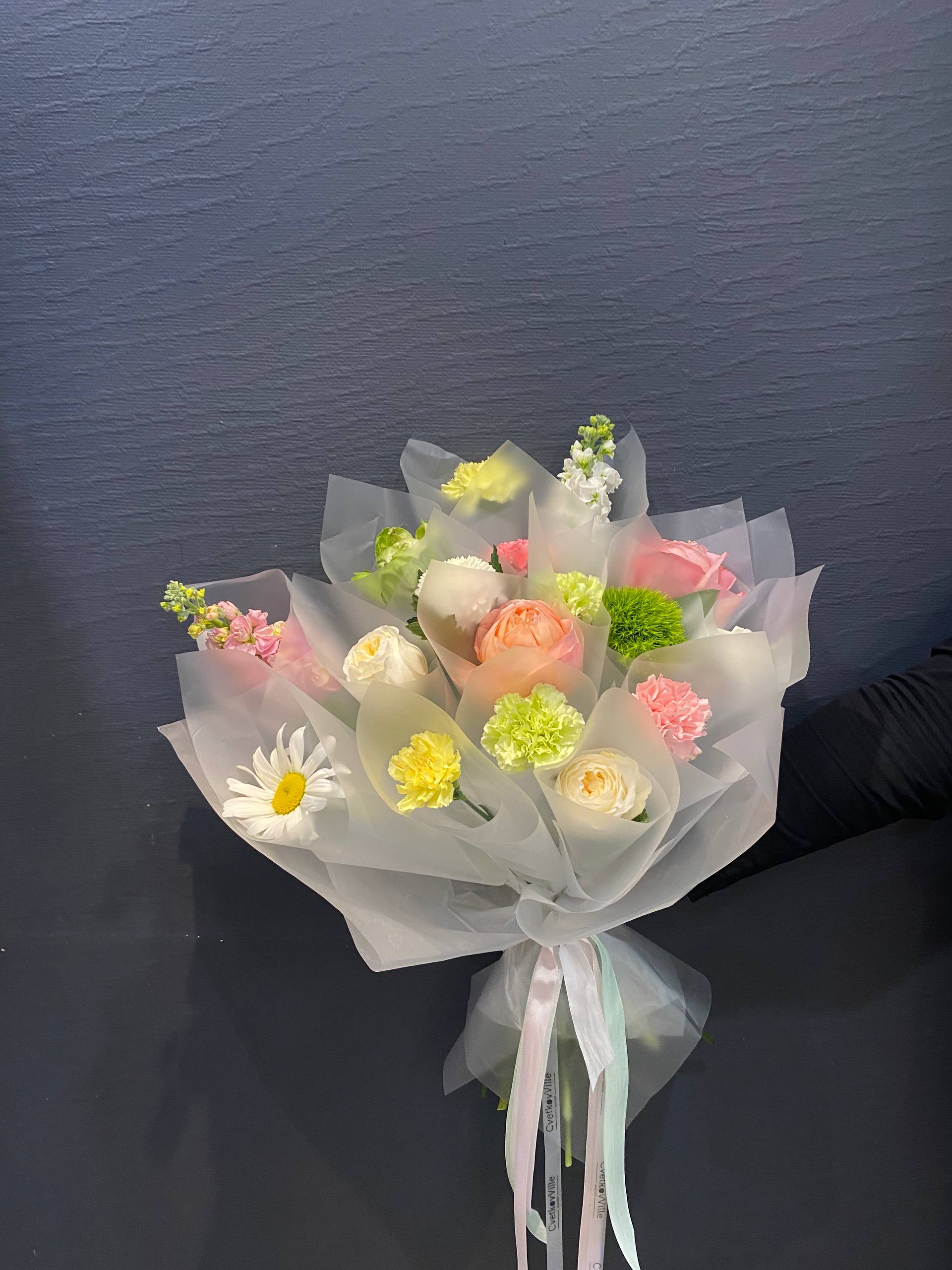Погрузитесь в атмосферу весеннего цветения с нашим эксклюзивным букетом в корейском стиле "Цветущий сад". Этот потрясающий ансамбль из диантусов, пионовидных роз, матиолы, больших садовых ромашек, диантусов Киви и хризантемы Момоко привнесет в ваш дом яркие краски и нежный аромат, создавая настроение радости и уюта.