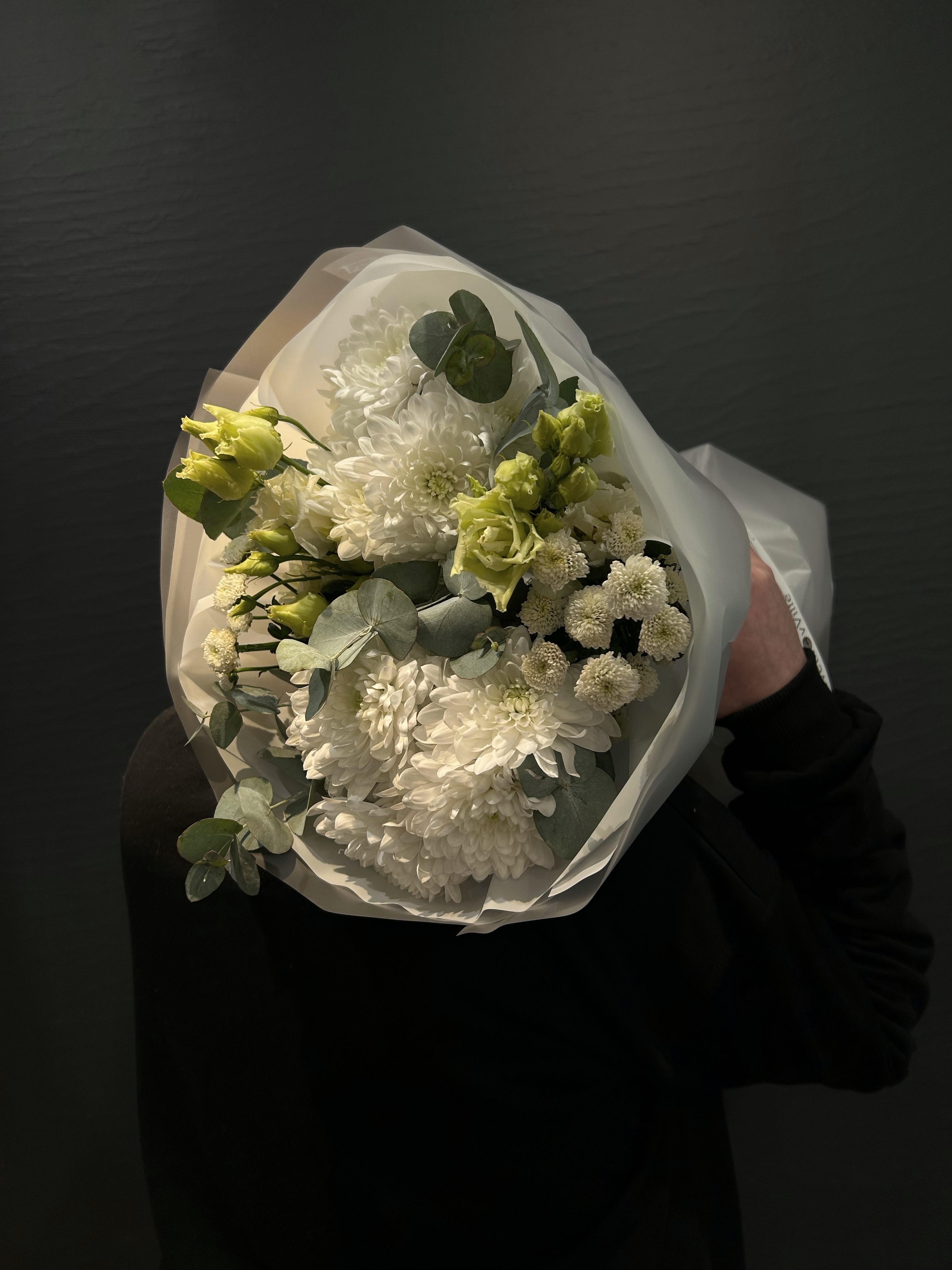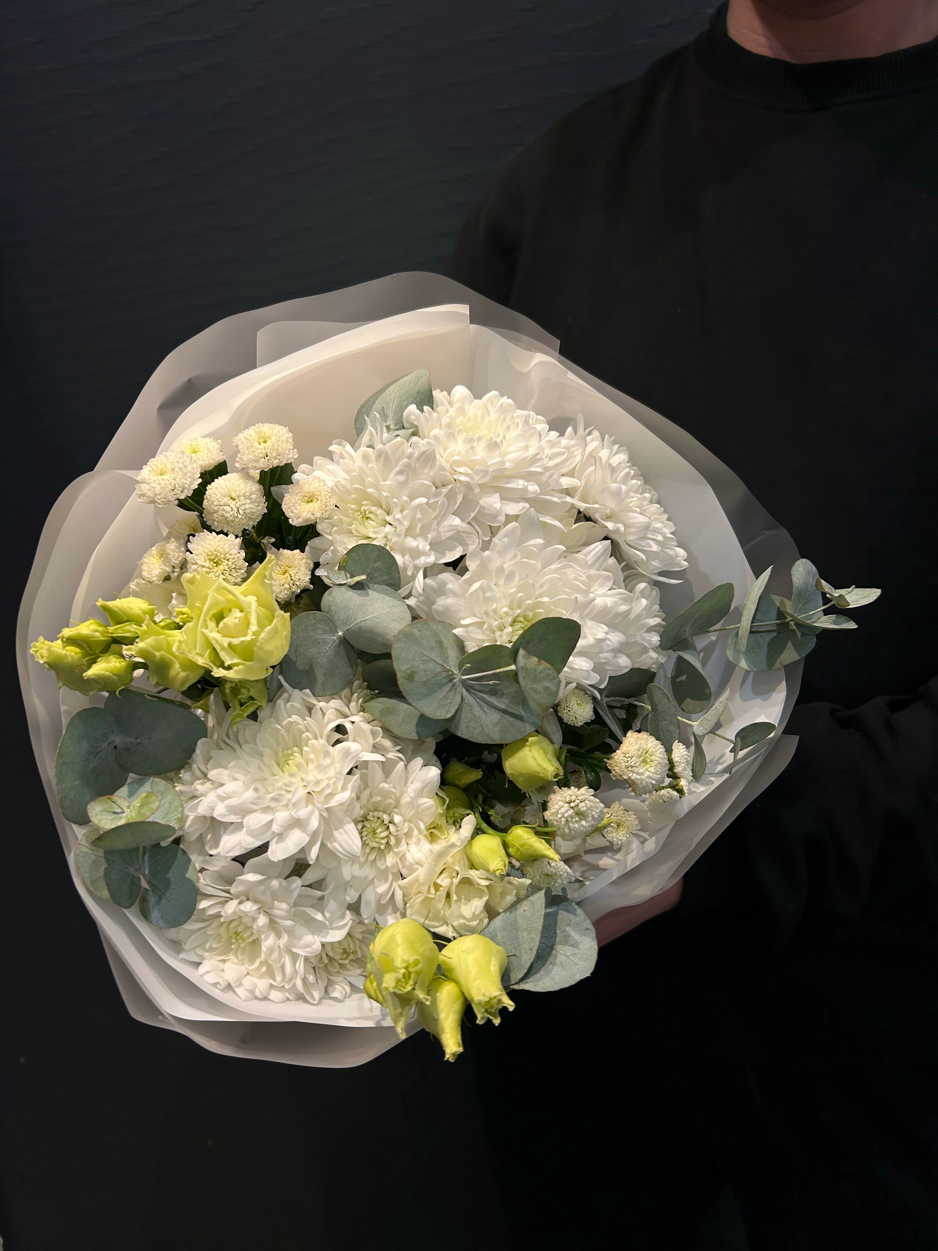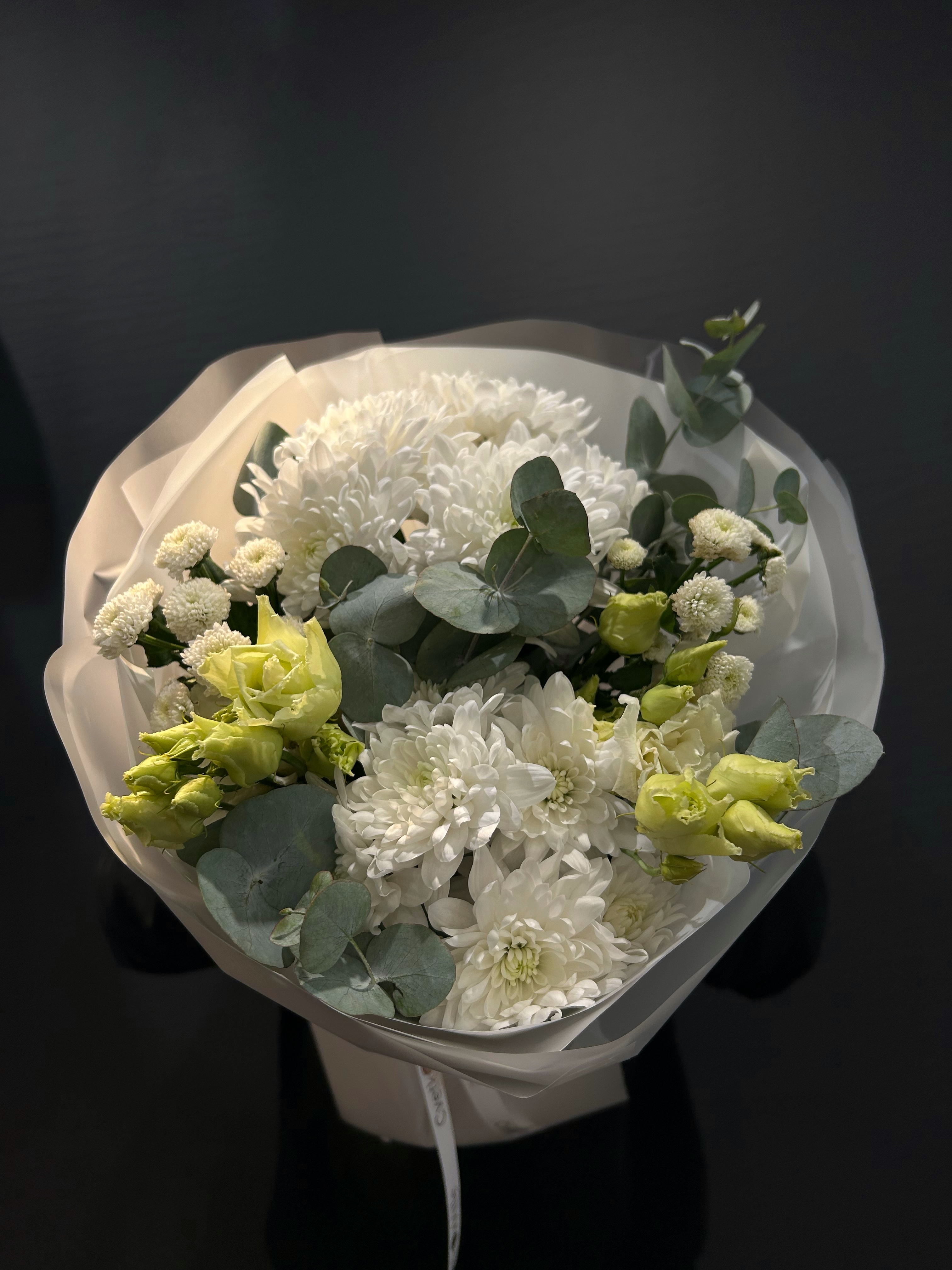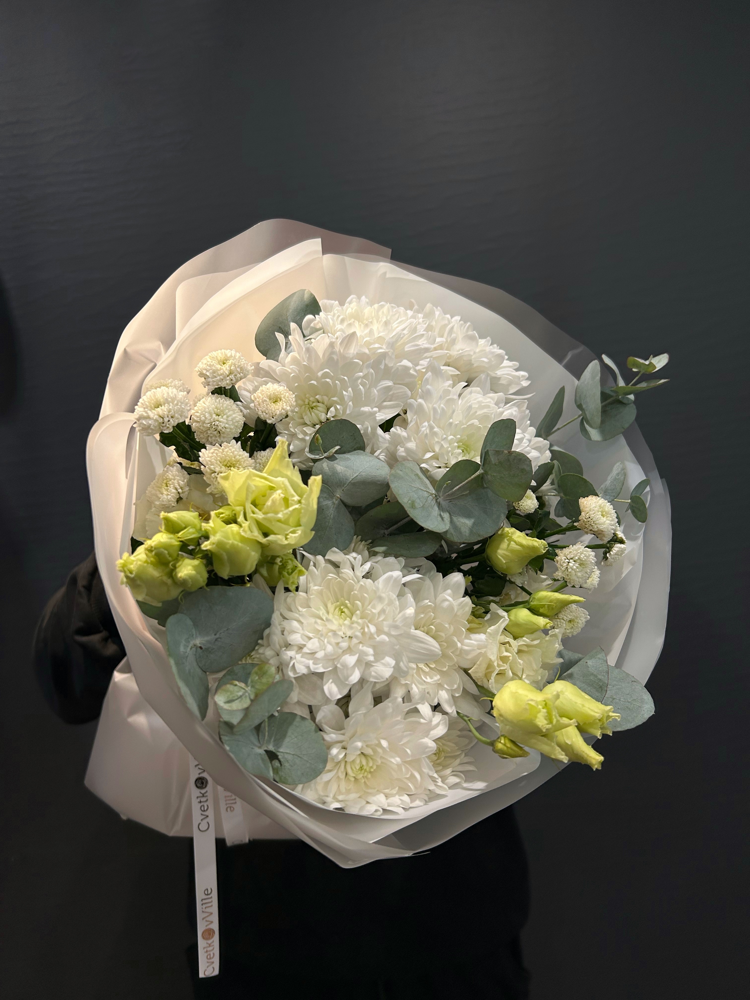 Андромеда" – это не просто букет, это воплощение космической чистоты и изысканной элегантности. Как далёкая галактика, он окутан тайной и нежностью, где каждый цветок словно звезда, взорвавшаяся белоснежным светом в безграничном пространстве ночи. Белые хризантемы – это сердце Андромеды, пульсирующее мягким светом, символизирующее стойкость и верность. Эустома добавляет изящества, её нежные бутоны словно облака, плавно плывущие по небесам, внося в букет лёгкость и воздушность. Хризантемы Сантини, маленькие искорки среди космической пыли, дарят букету игривость и многогранность. А эвкалипт, с его серебристо-зелёными листьями, словно звёздная пыль, окутывает композицию свежестью и ароматом, принося чувство гармонии и покоя. "Андромеда" – это букет, который несёт в себе частицу Вселенной, идеальный подарок для тех, кто ценит красоту в её самом чистом и возвышенном проявлении.