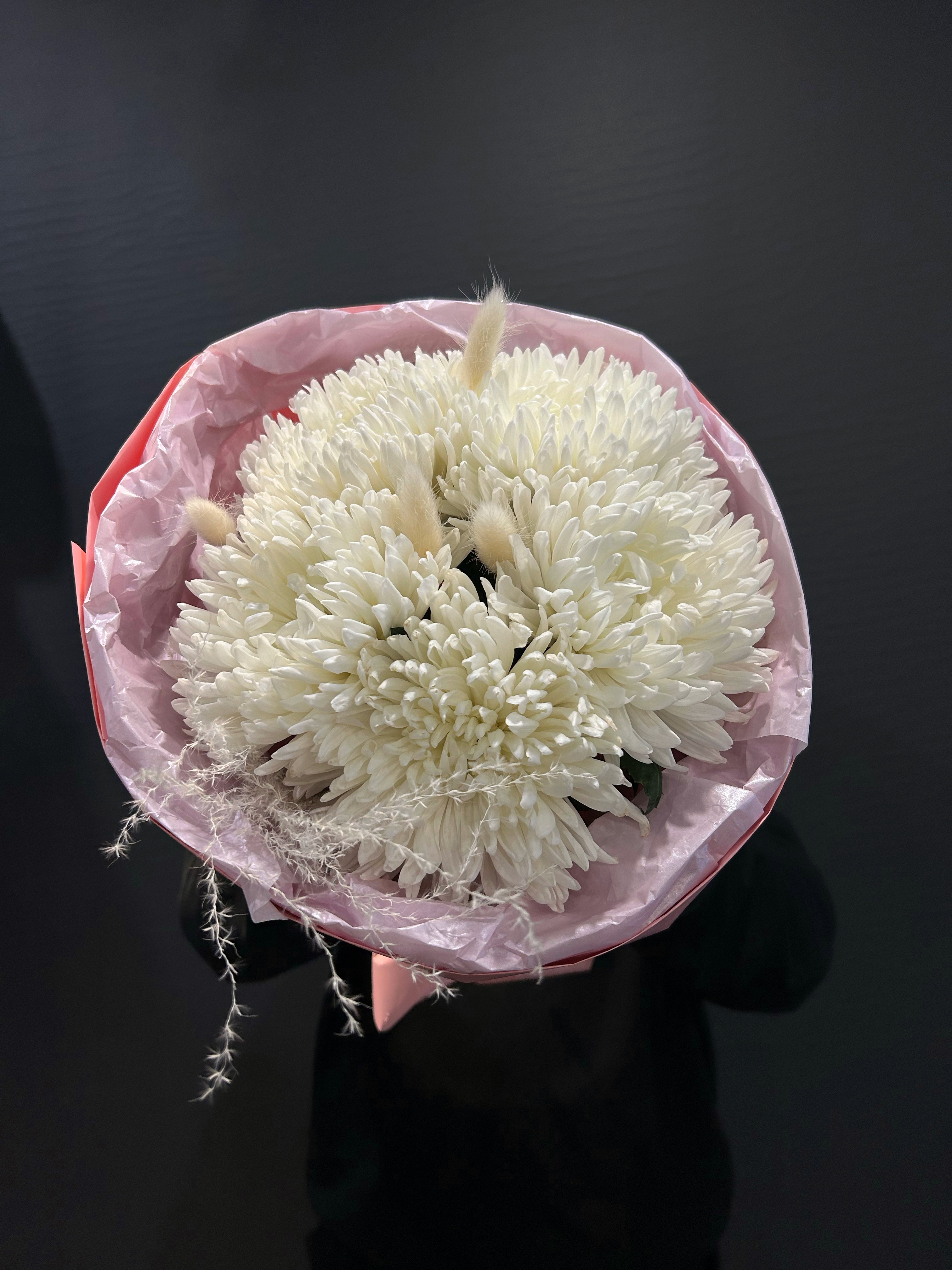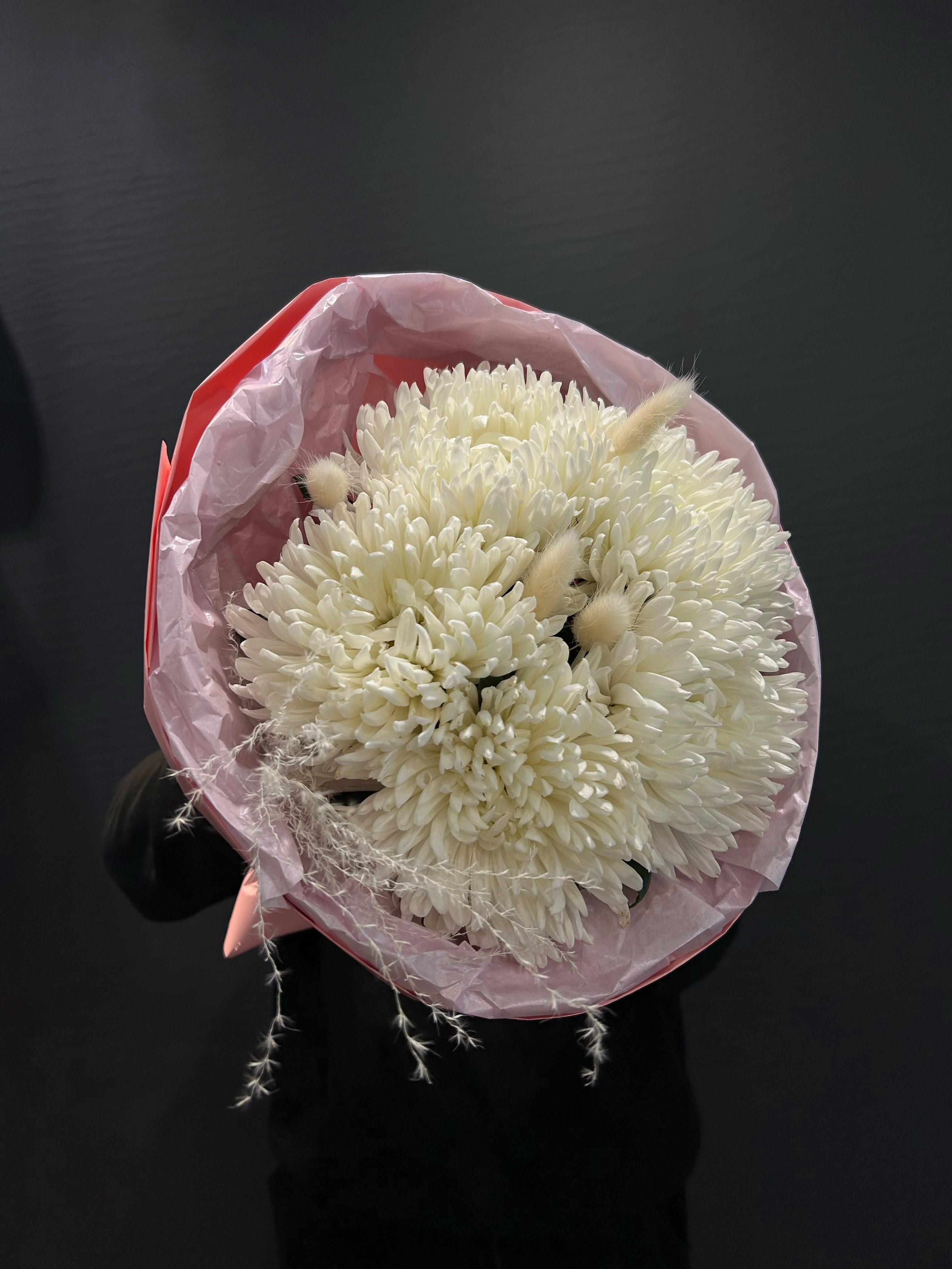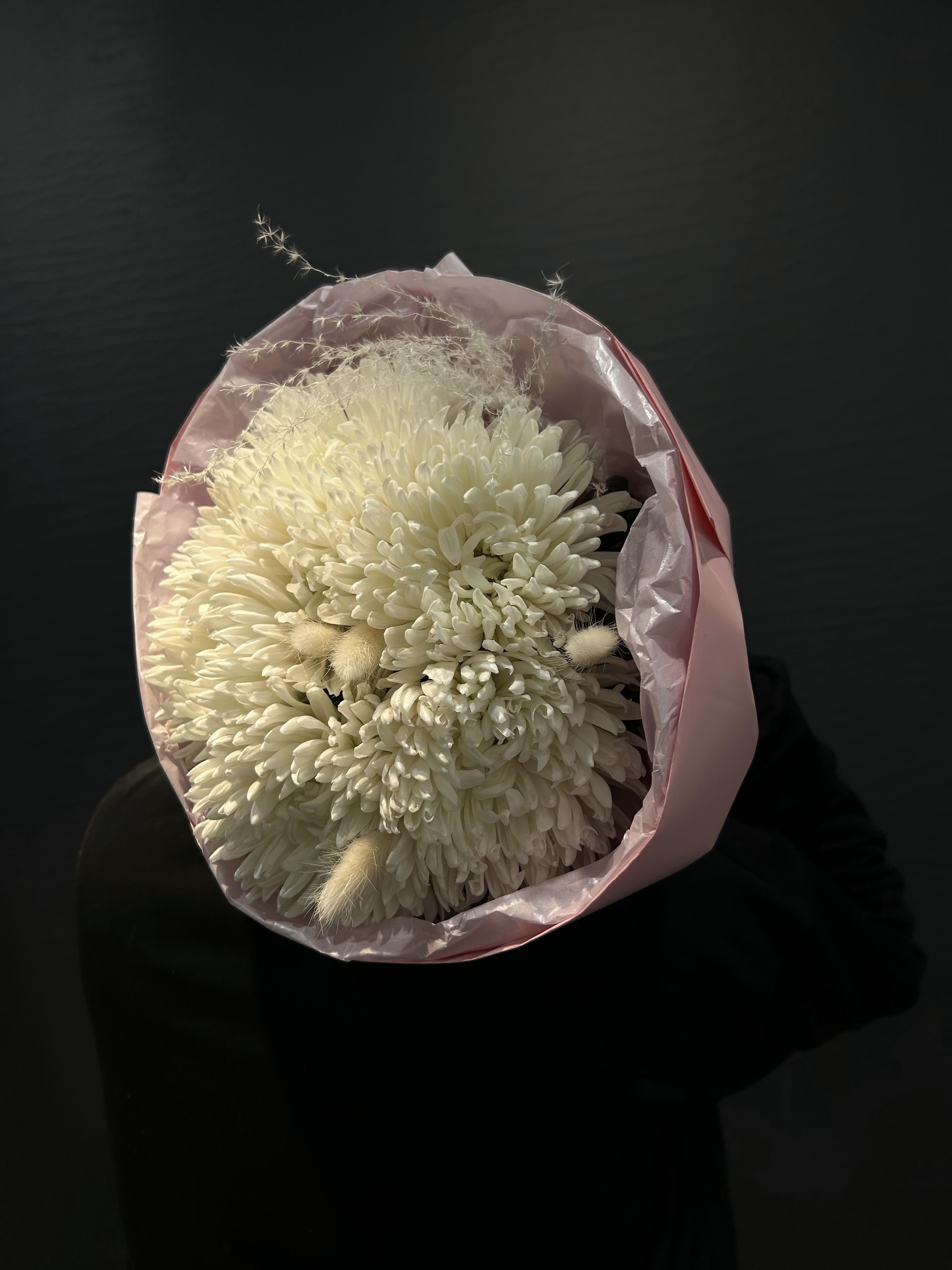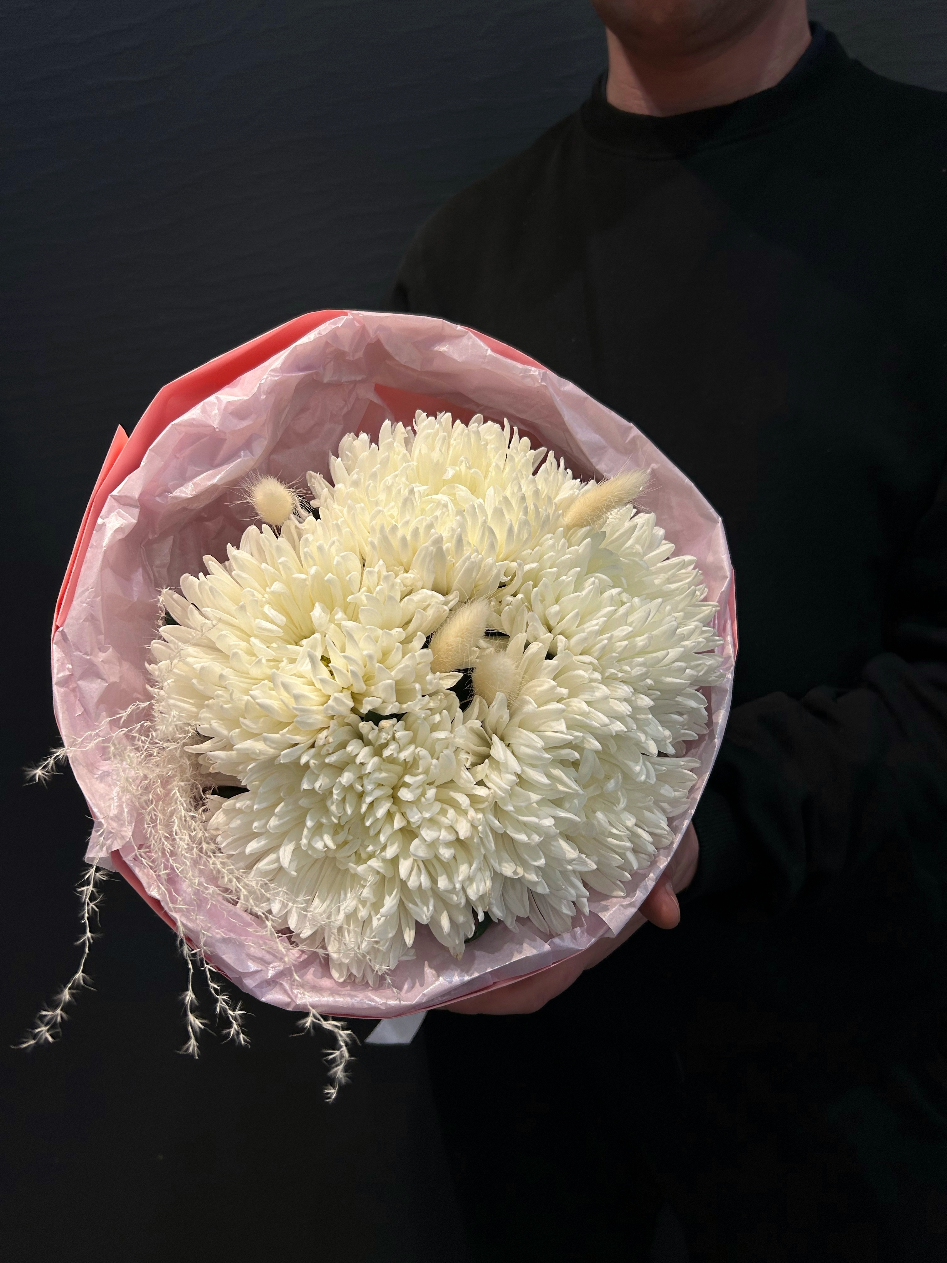 Белоснежные лепестки хризантем Антонов, словно облака на весеннем небе, окружены тонкими веточками сухоцветов, создавая эффект воздушности и легкости. Этот букет – не просто подарок, а послание, перенесенное через время и пространство, где каждый элемент говорит о вечных ценностях и непорочности начала.