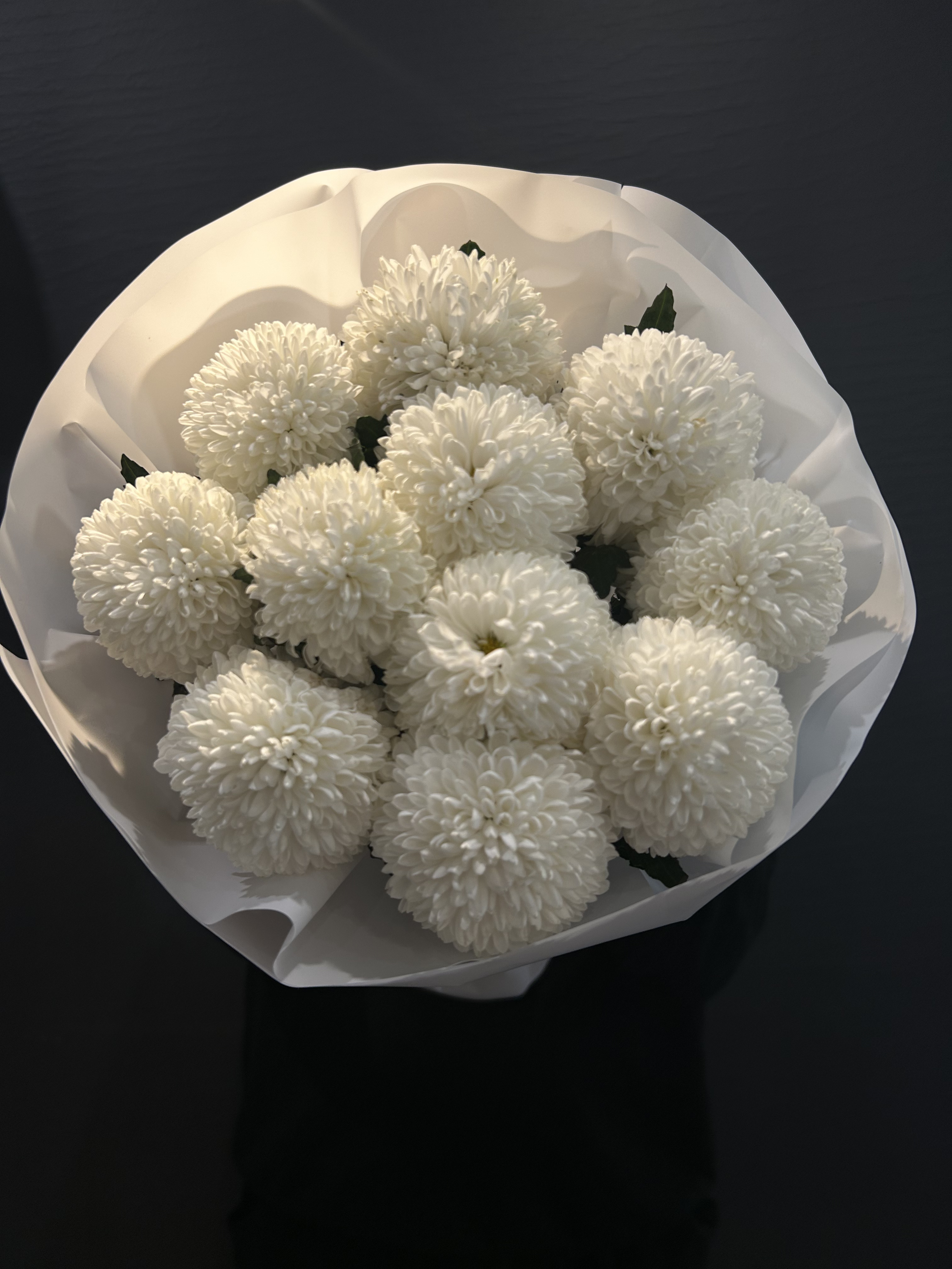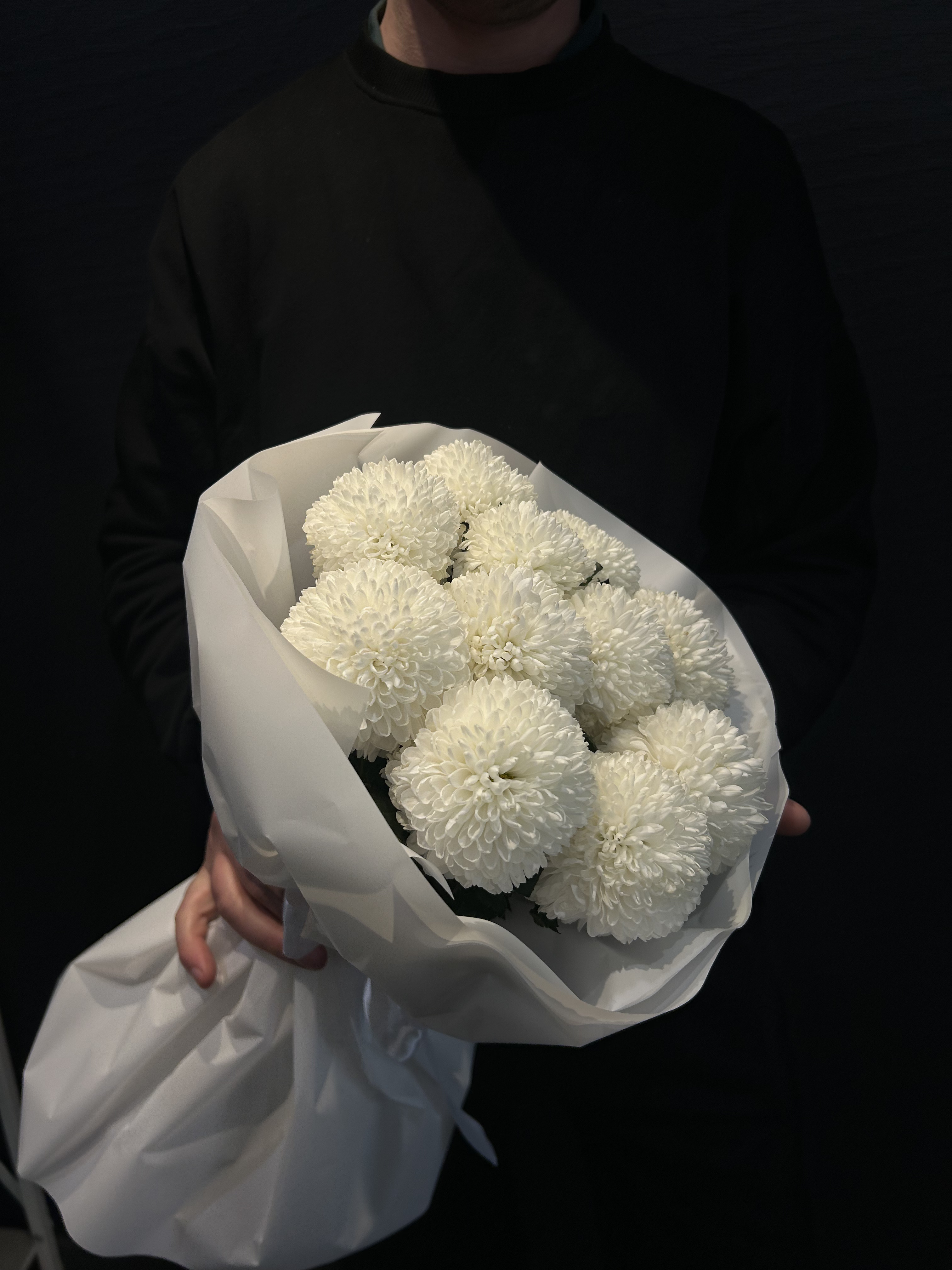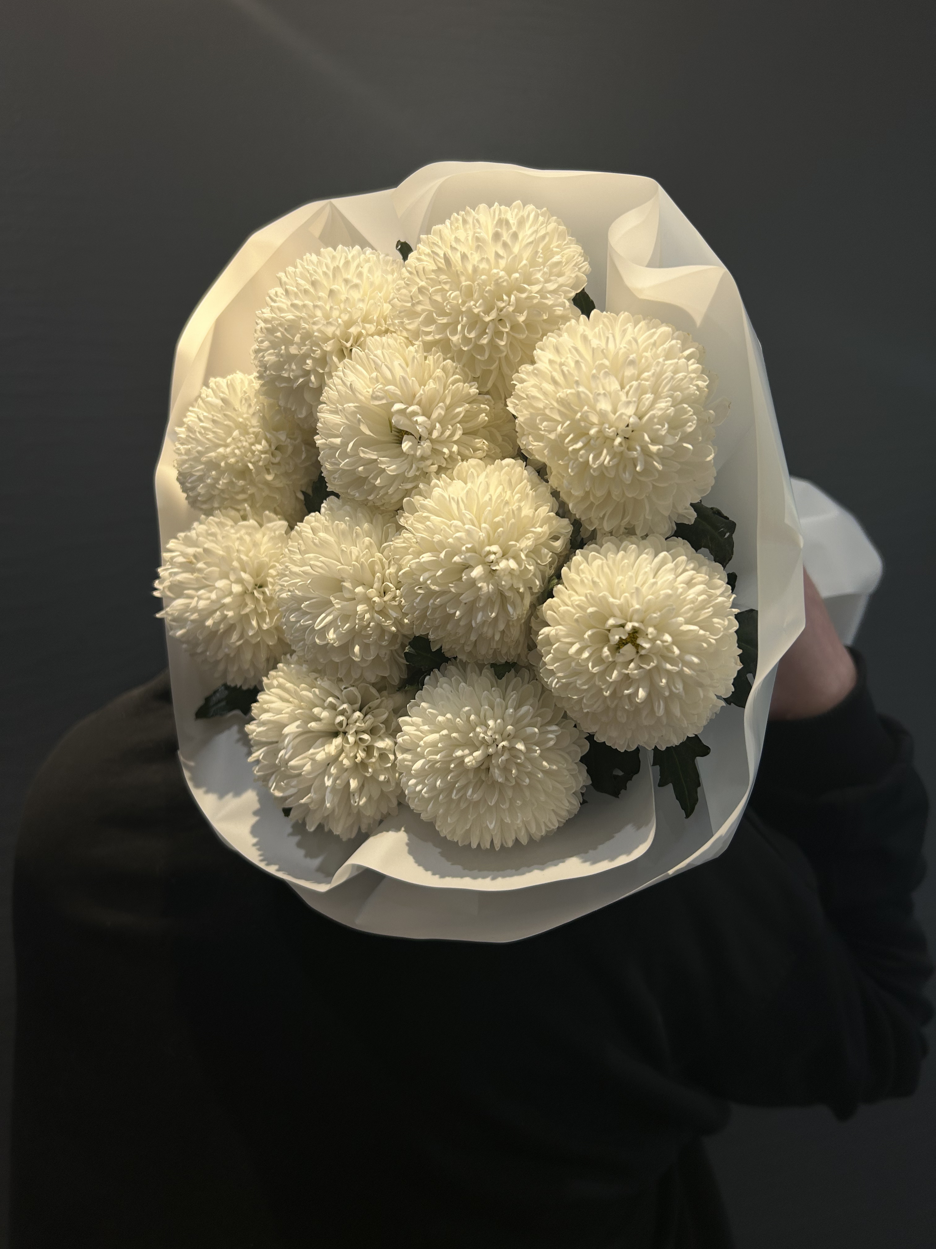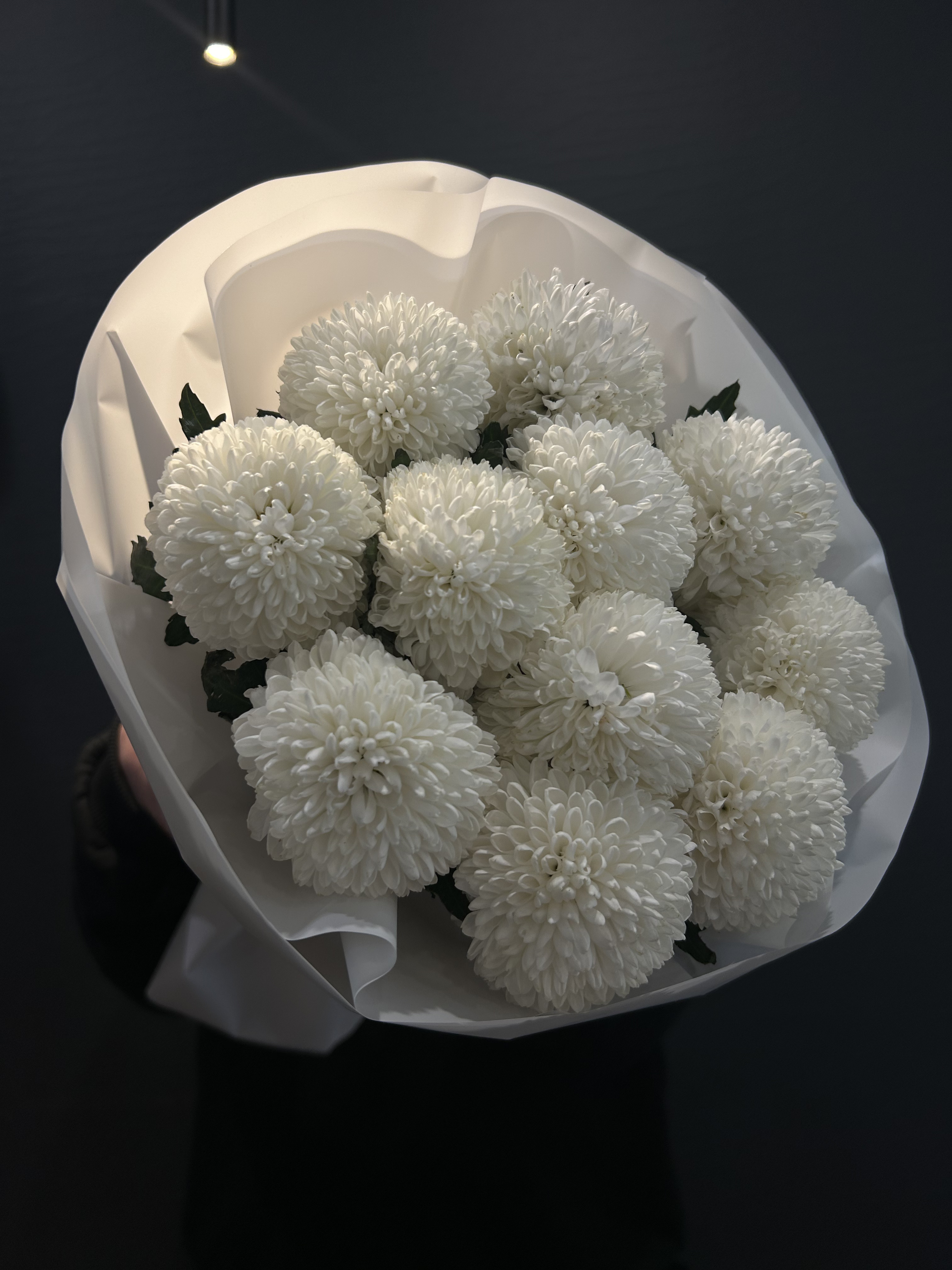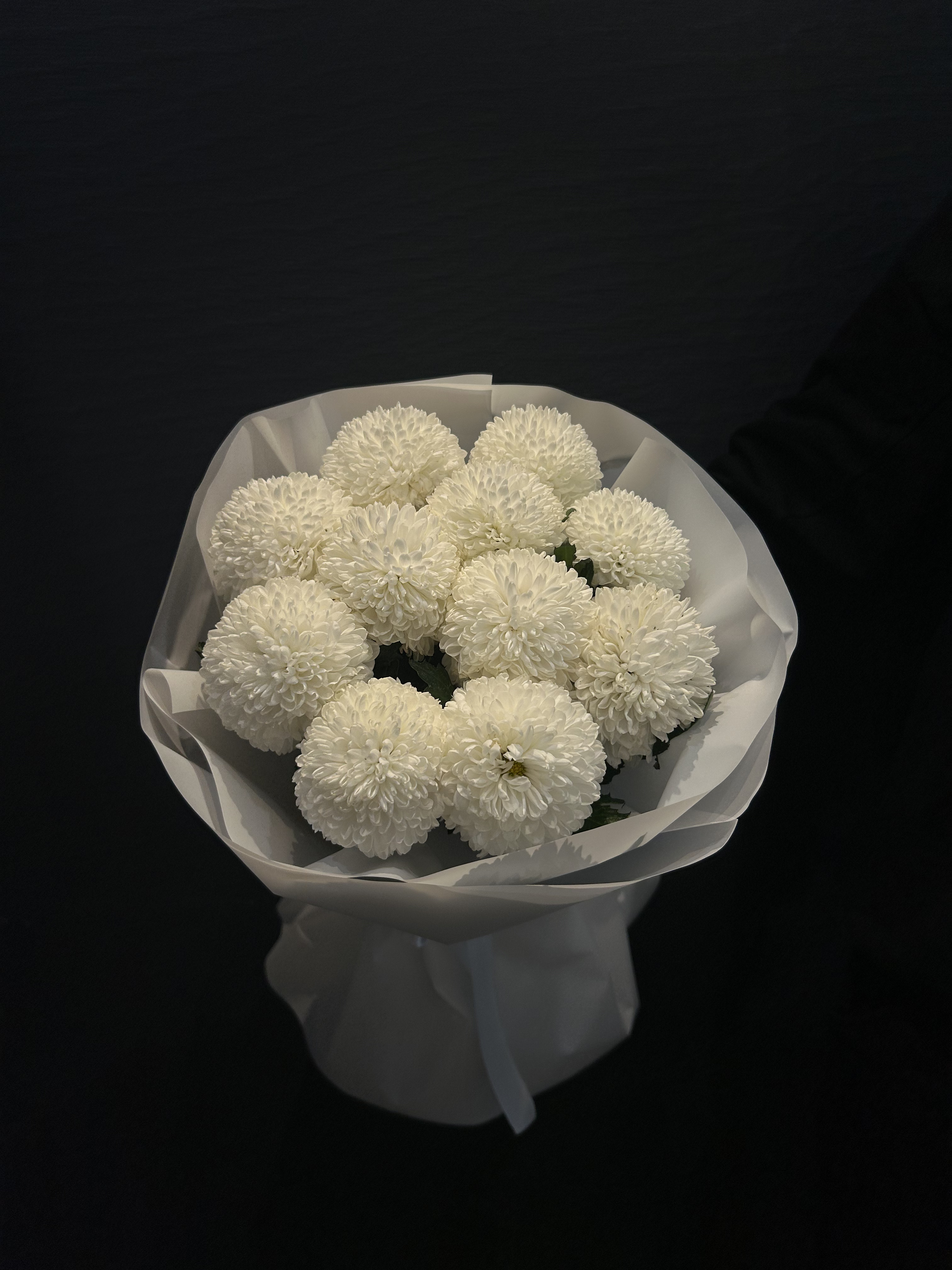 Погрузитесь в мир изысканной простоты и чистоты с букетом "Нежные чувства", где каждая из одиннадцати белоснежных хризантем сорта Момоко является воплощением утонченности и грации. Эти цветы, словно лепестки первого снега, укладываются в идеальную гармонию, создавая ощущение спокойствия и мирной радости.
