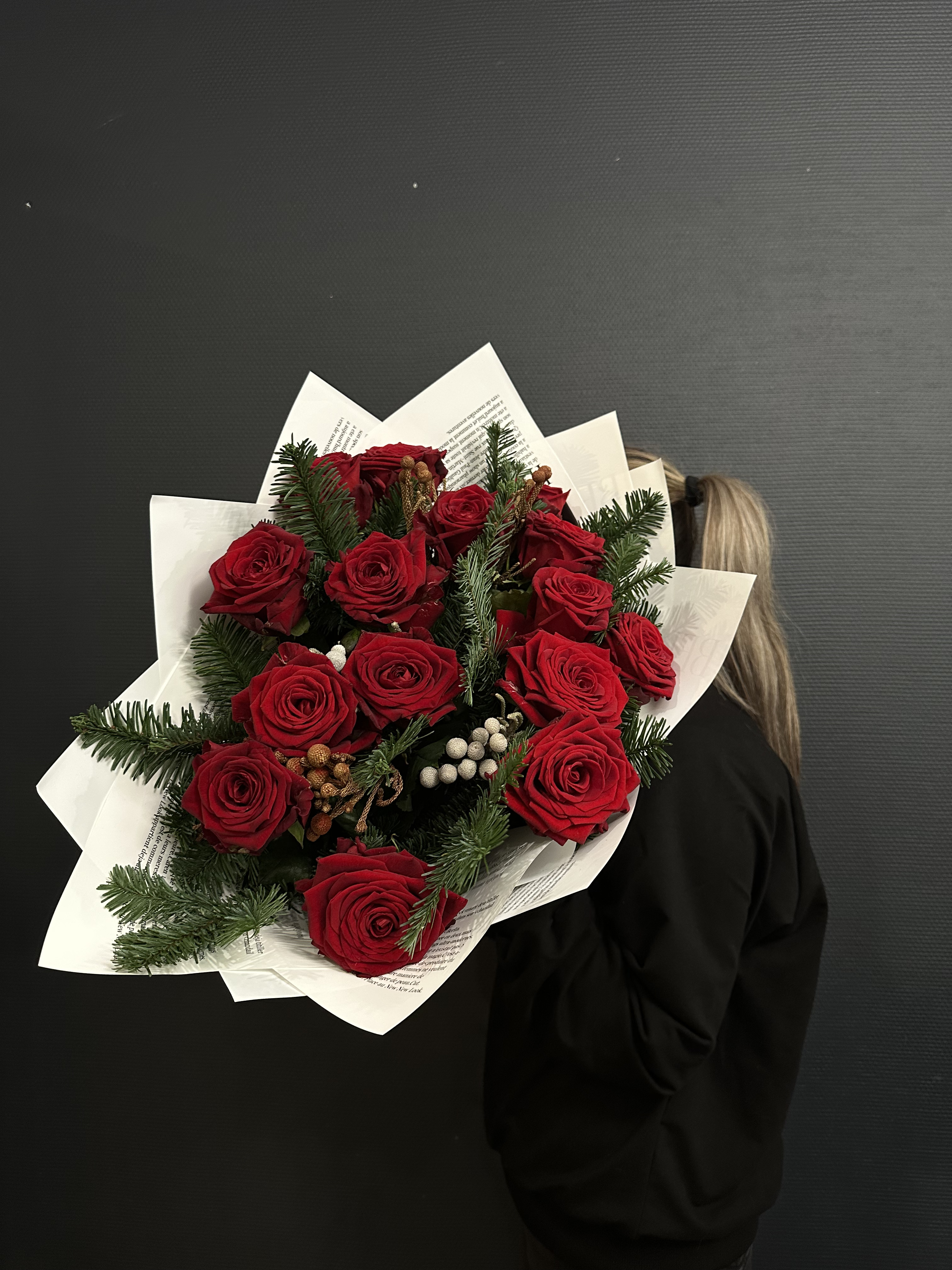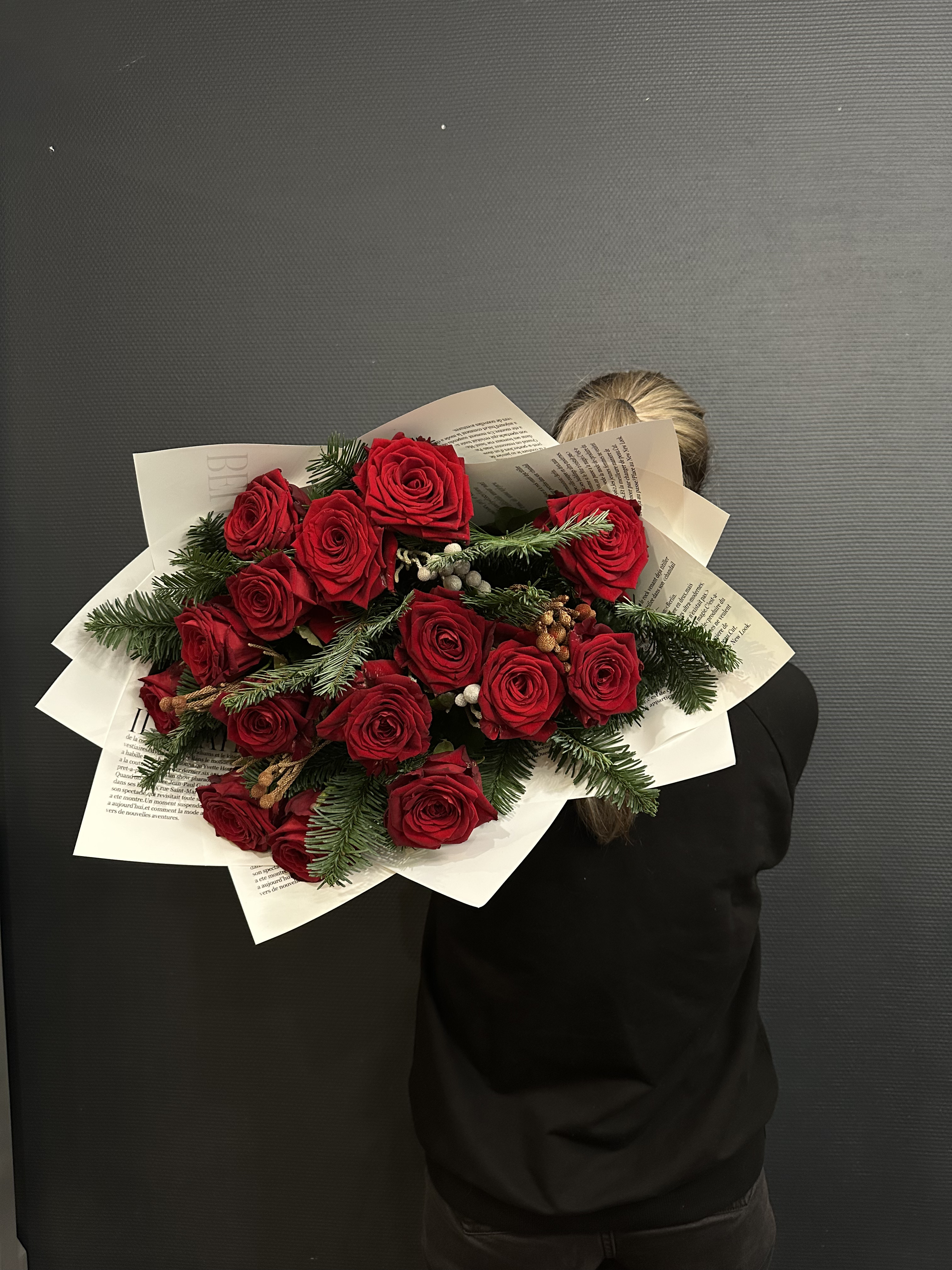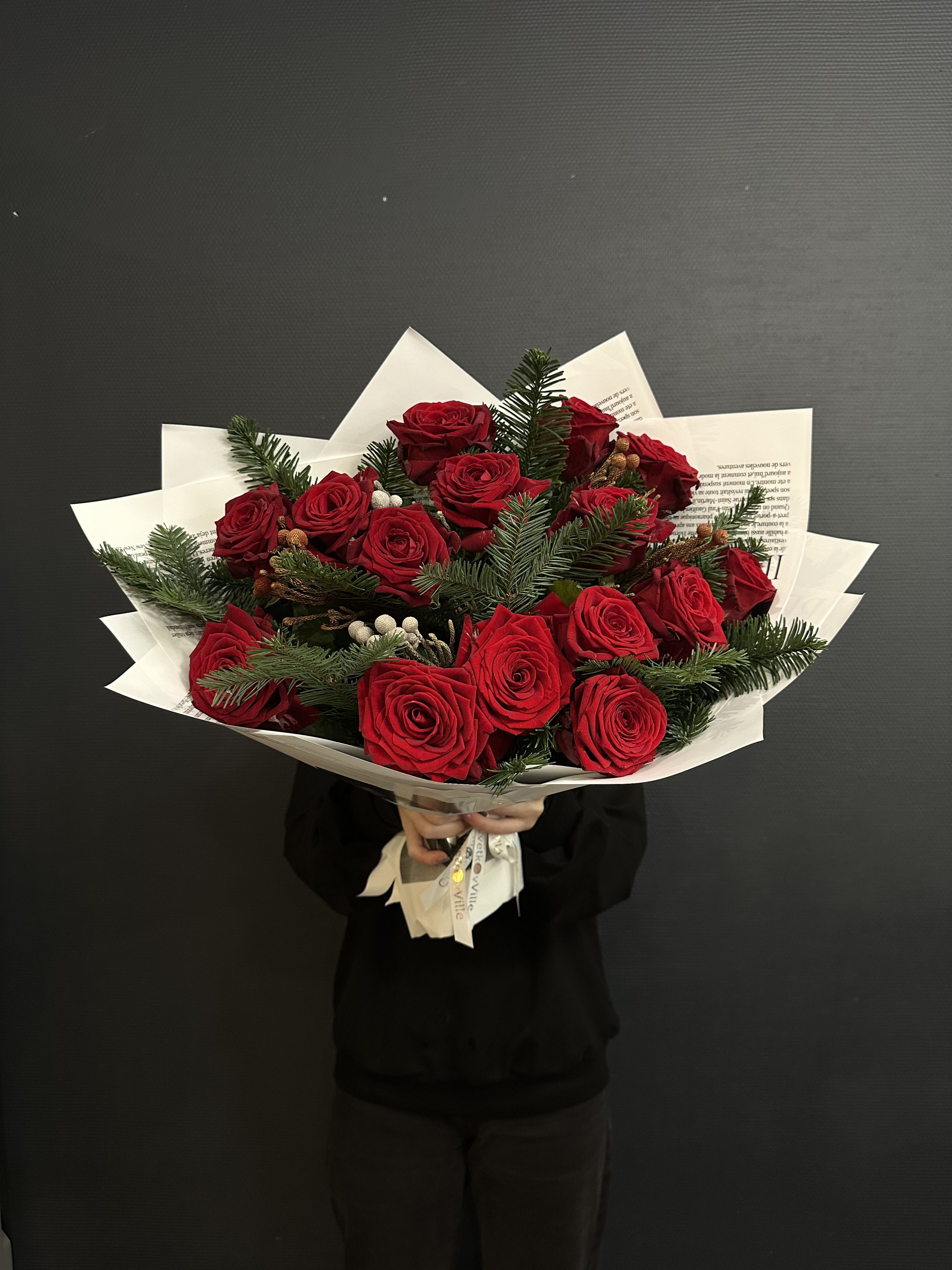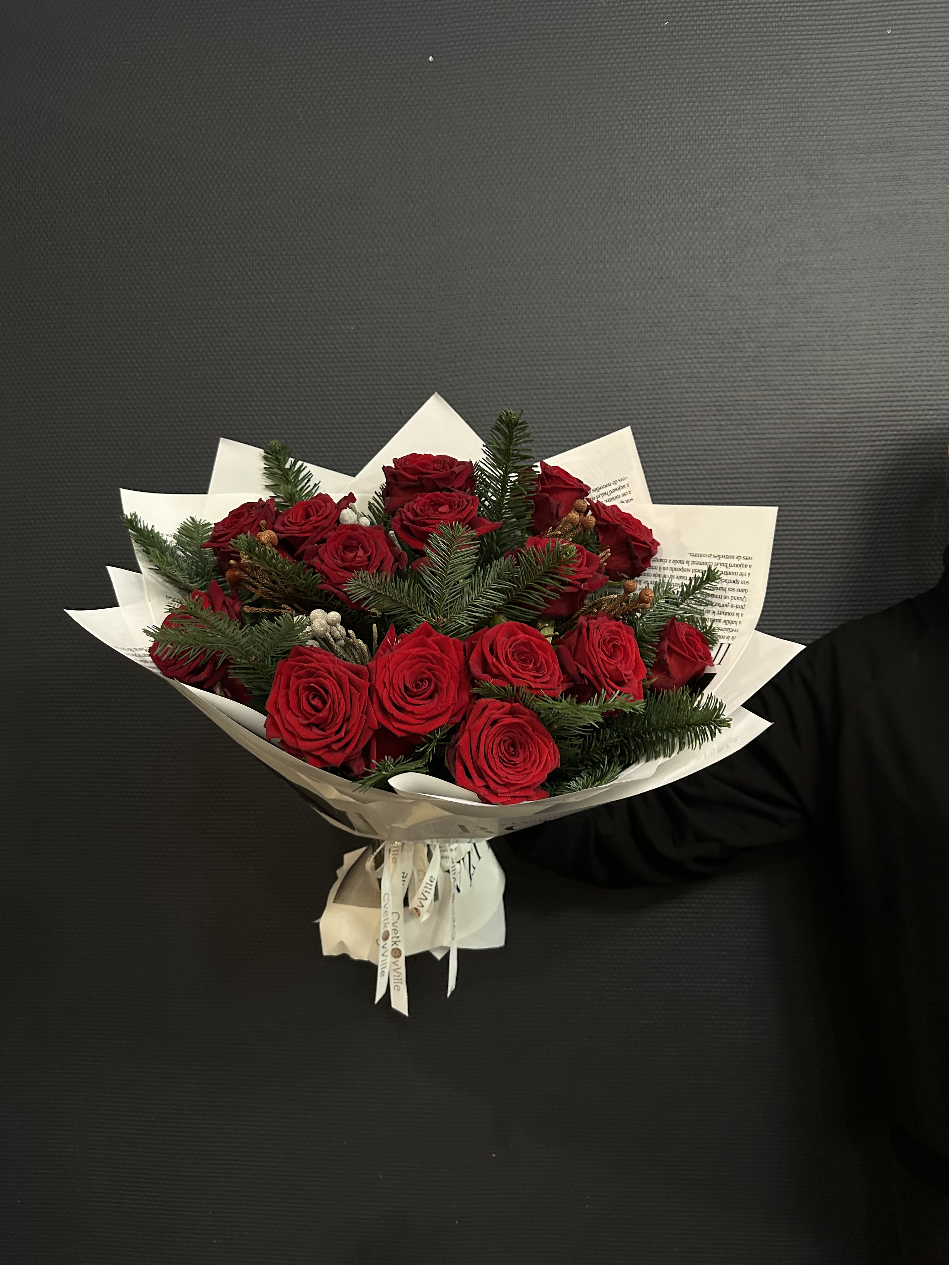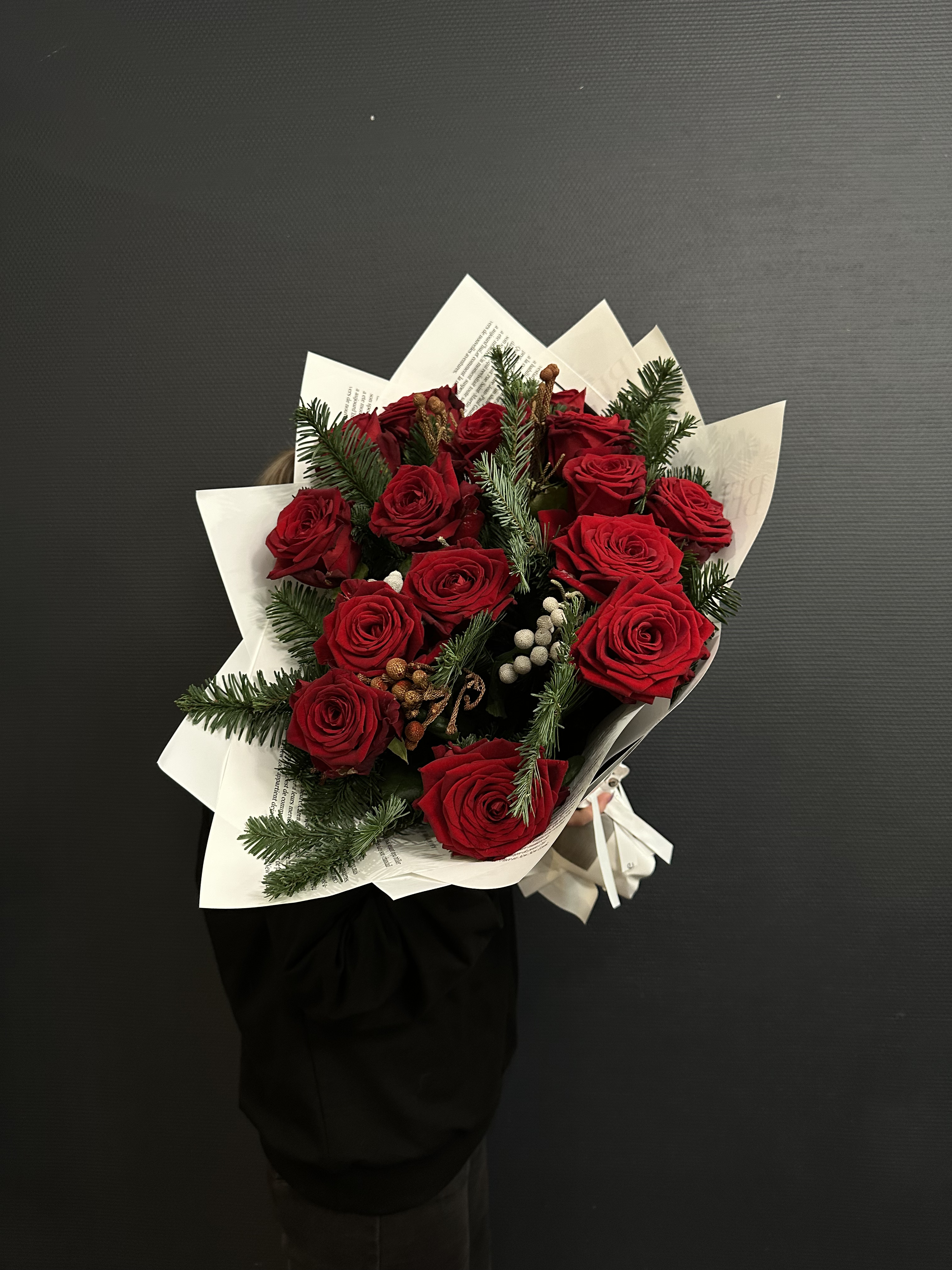 Букет "Иголочка" – это воплощение новогоднего волшебства в каждой изысканной детали. Этот букет как теплый объятие зимнего леса, где величественные ветви нобилиса шепчут сказки под покровом первого снега. Серебристая бруния мерцает среди зелени, словно утренние инеи, покрывшие ветки дремучего леса. Красные розы – это капли роскоши, напоминающие о страстном сердце зимы, они словно яркие огоньки на фоне заснеженных пейзажей.