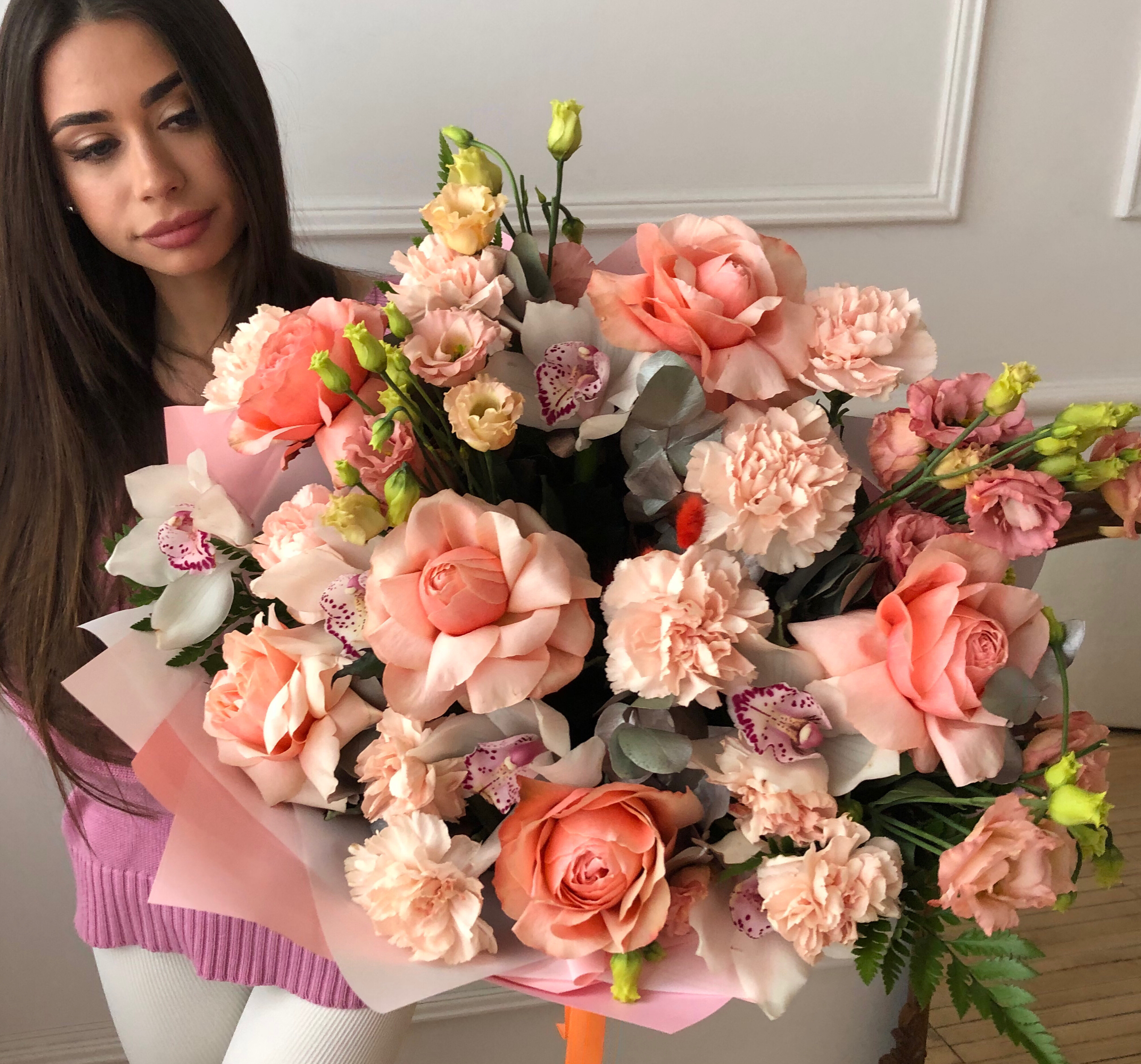 Букет с орхидеями Cymbidium и розами Kahala "Персиковый рай"