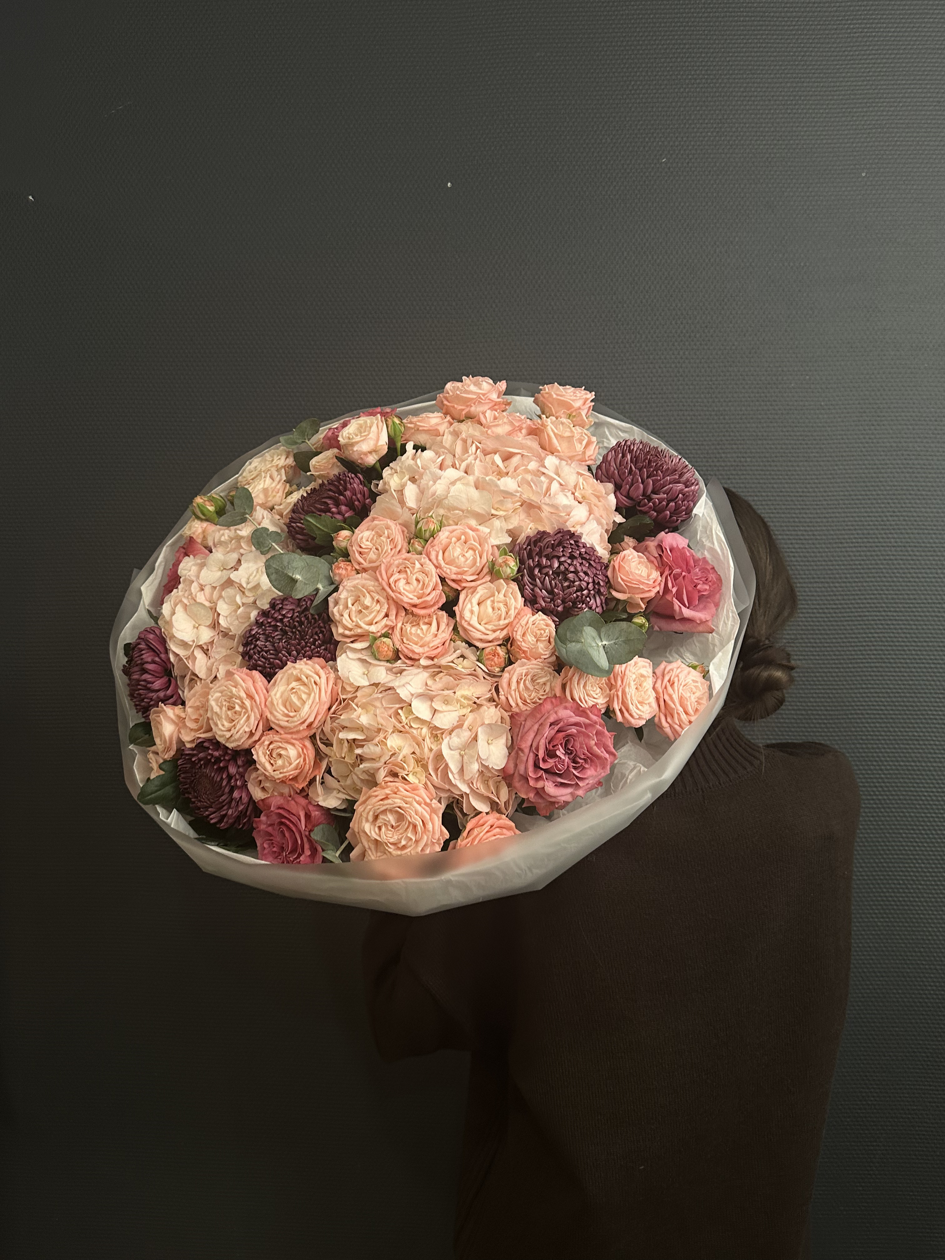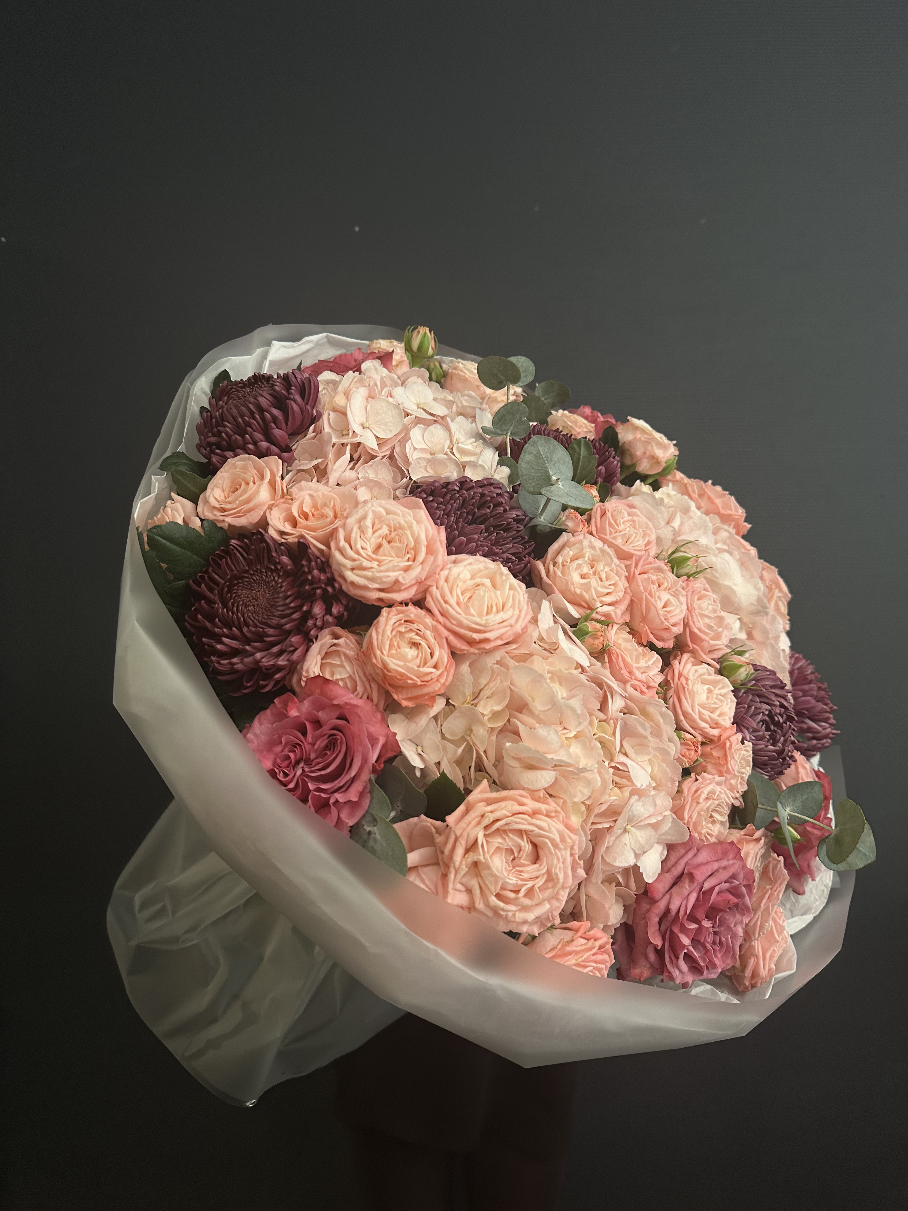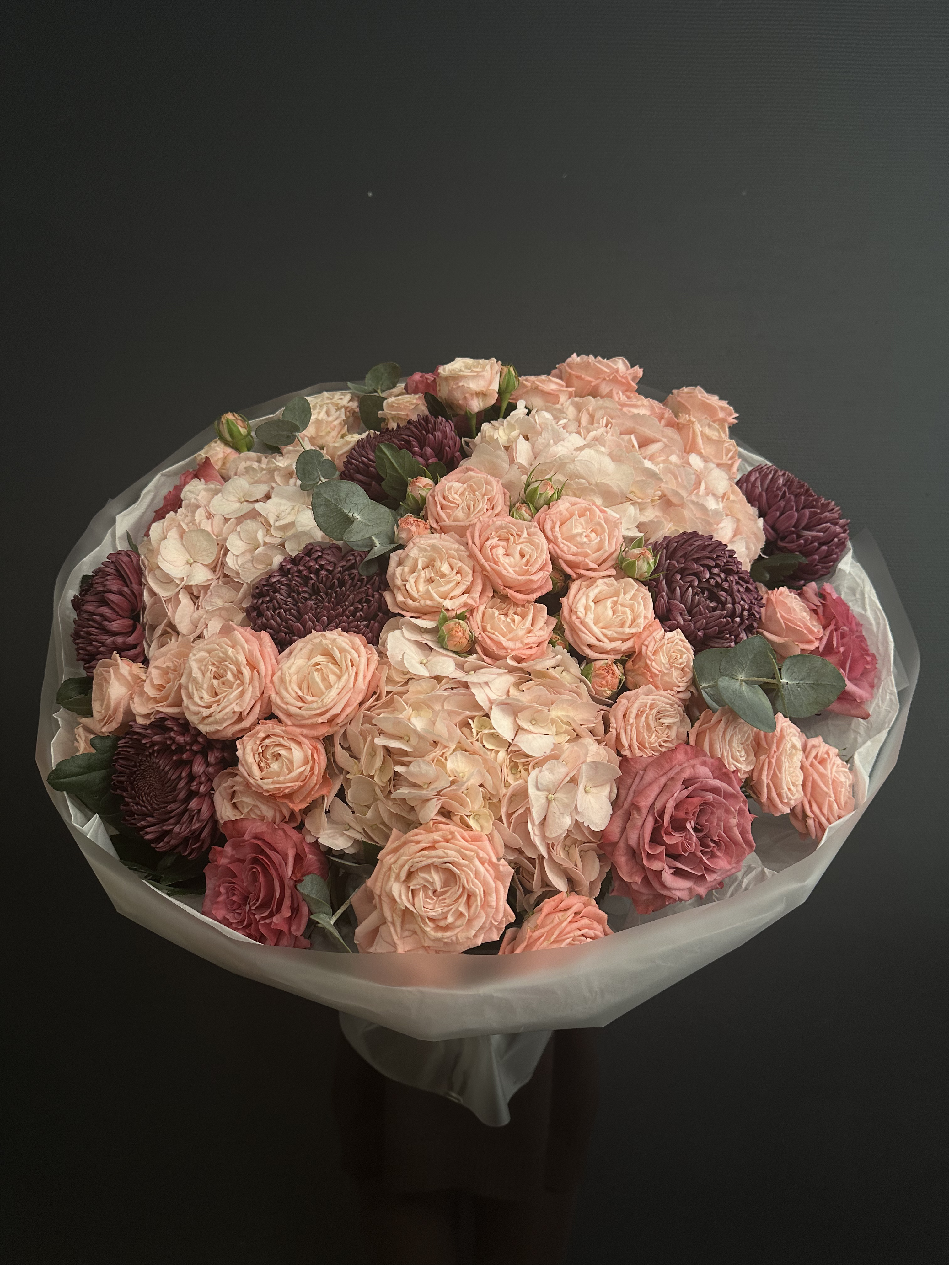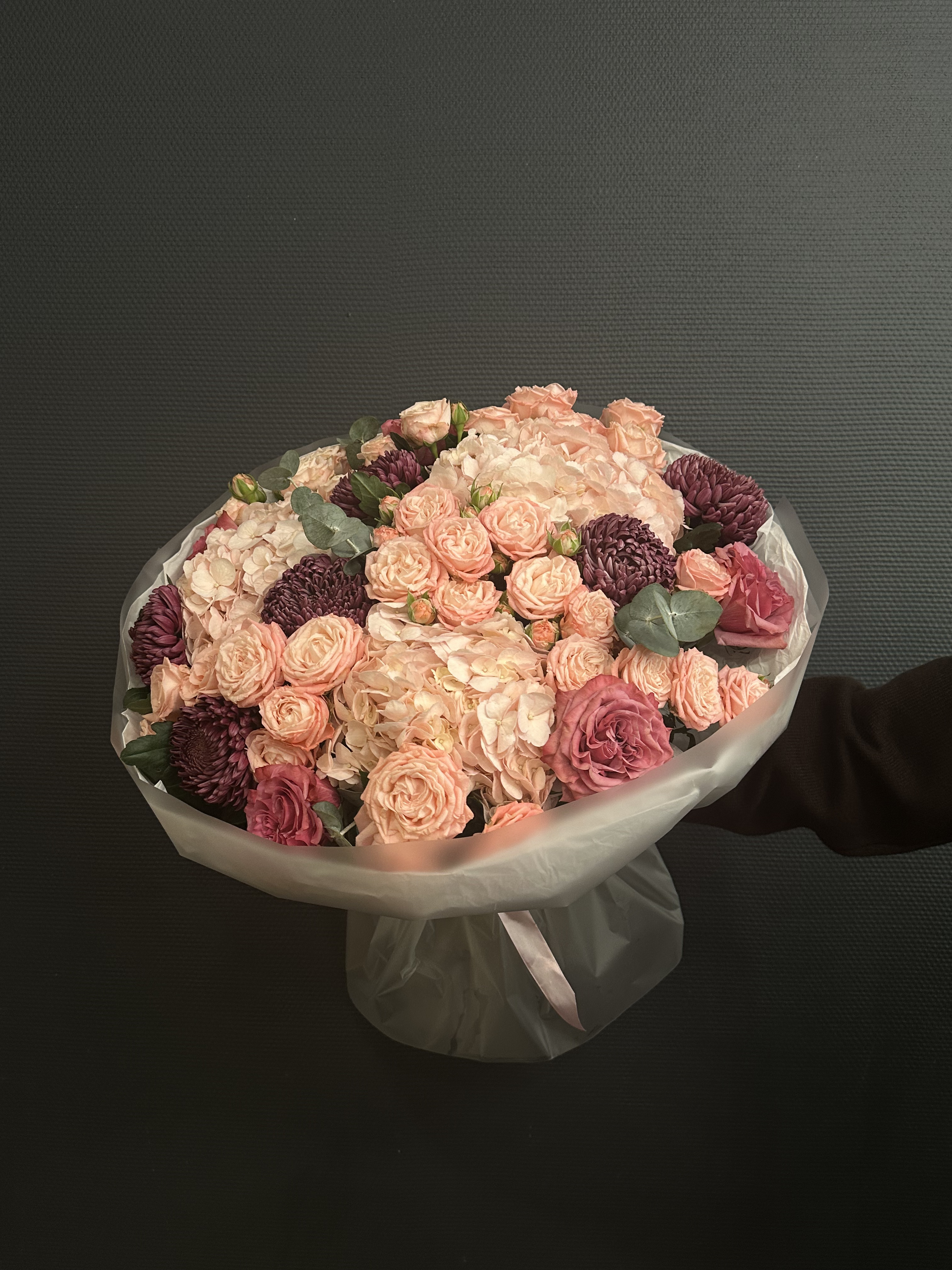 Этот букет – как нежное прикосновение любящего сердца к душе самого дорогого человека. В его утончённом облике переплетаются изящные локоны хризантем Bigoudi, словно витиеватые узоры материнской любви, окутывающие теплом и заботой. Розовая гортензия, пышная и величественная, символизирует бесконечную благодарность за годы терпения и мудрости, которыми она нас одаривала. Кустовые розы, нежные и чистые, словно самые трепетные воспоминания о детстве, окутанные материнским теплом. И, наконец, розы Country Blues, их утончённый оттенок напоминает о той безмятежности и спокойствии, которое только мама может подарить. Каждый цветок в этом букете – это слово любви, высказанное без звуков, но с неизмеримой глубиной чувств. "Любимой Маме" – не просто букет, это послание сердца, воплощённое в цветочной композиции, которая будет напоминать о вашей заботе и признательности с каждым взглядом на эти великолепные цветы.