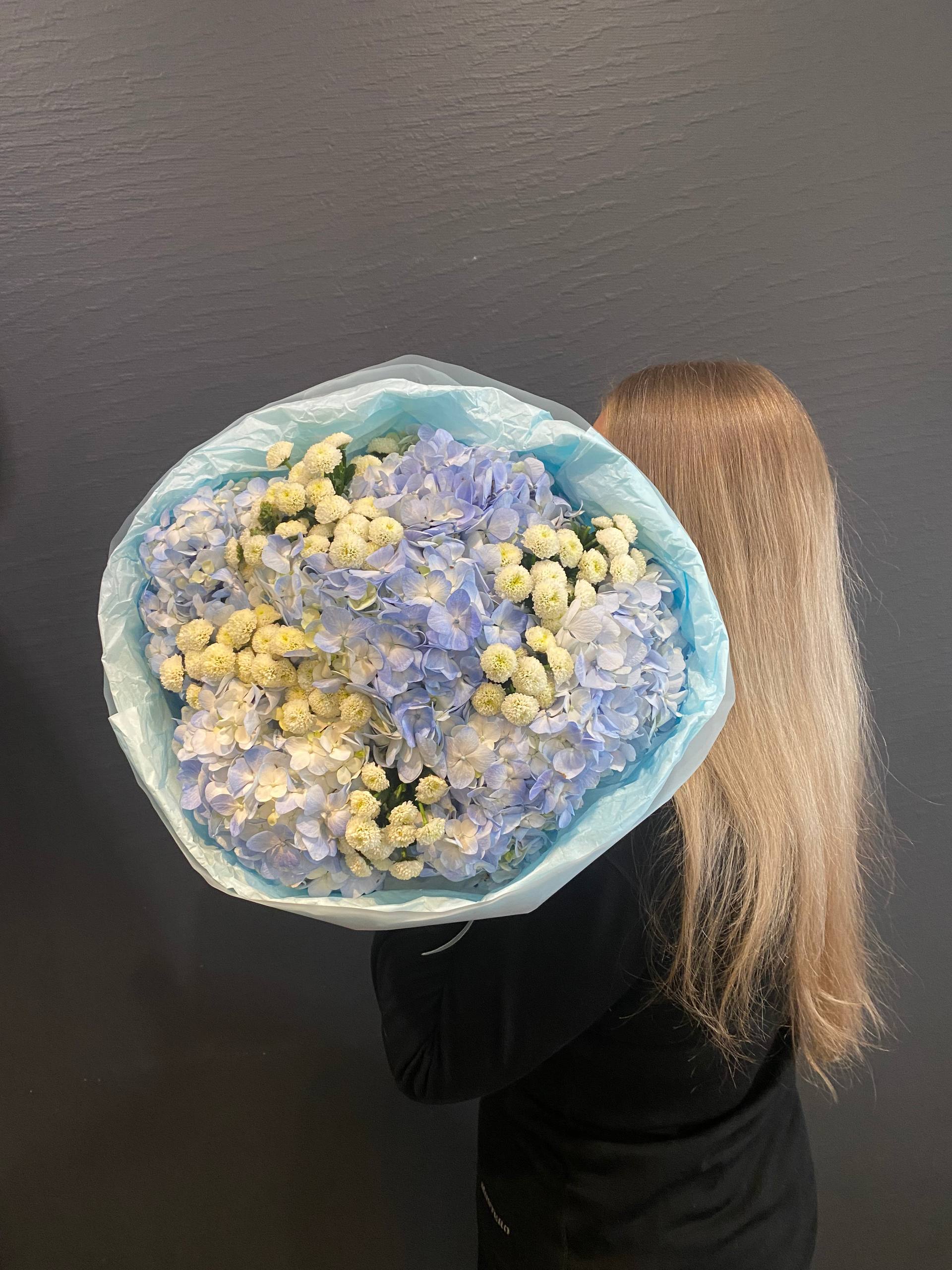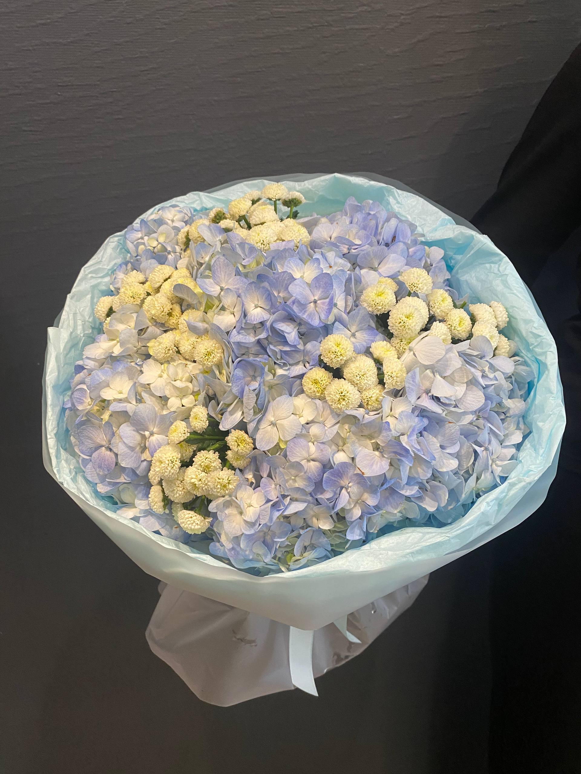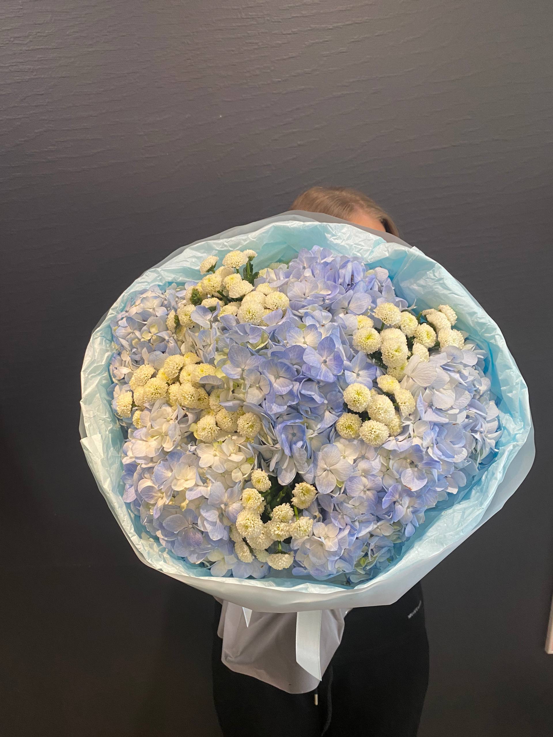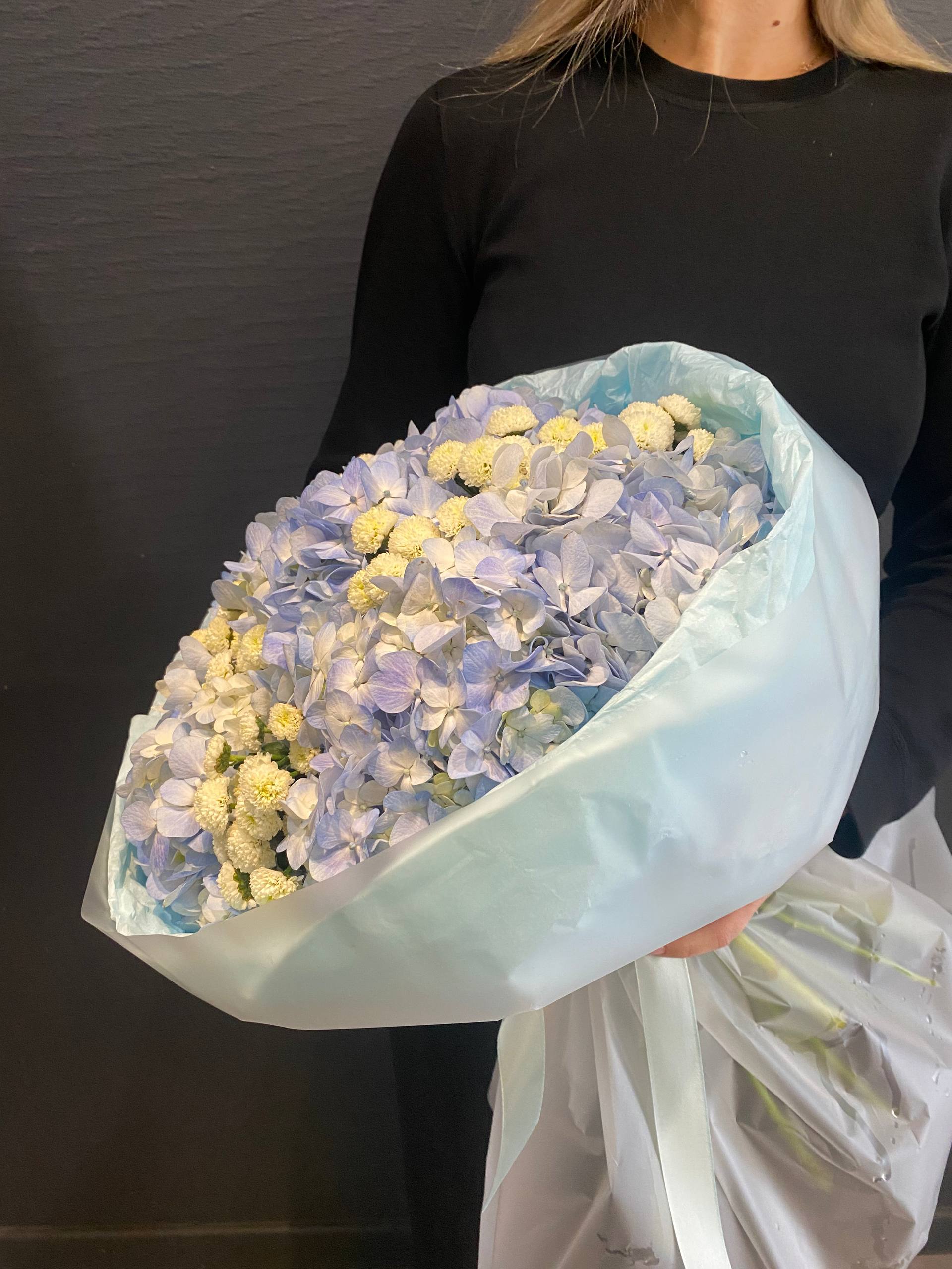 Каждый цветок в "Голубой Нимфе" тщательно отобран, чтобы создать идеальный баланс между цветом и формой. Гортензии, словно облака, окрашенные в цвет морской волны, приносят ощущение прохлады и спокойствия, в то время как хризантемы Сантини, словно первые снежинки, добавляют композиции чистоты и света.