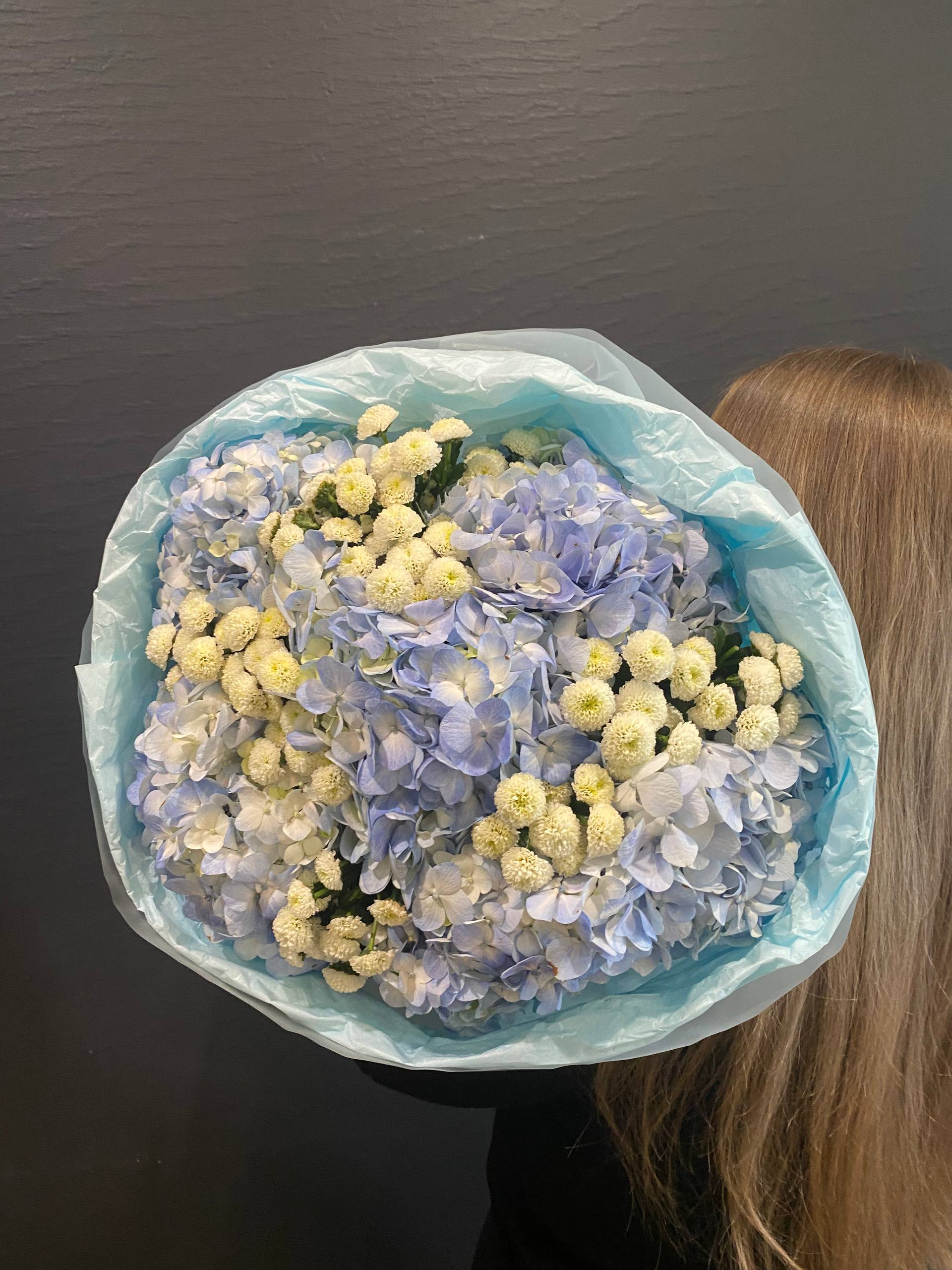 Погрузитесь в мир утонченной красоты с букетом "Голубая Нимфа", где волшебство голубых гортензий переплетается с нежной чистотой белых хризантем сорта Сантини. Это произведение флористического искусства символизирует гармонию и спокойствие, воплощая в себе элегантность и свежесть утреннего неба, отраженного в спокойных водах тихого озера.