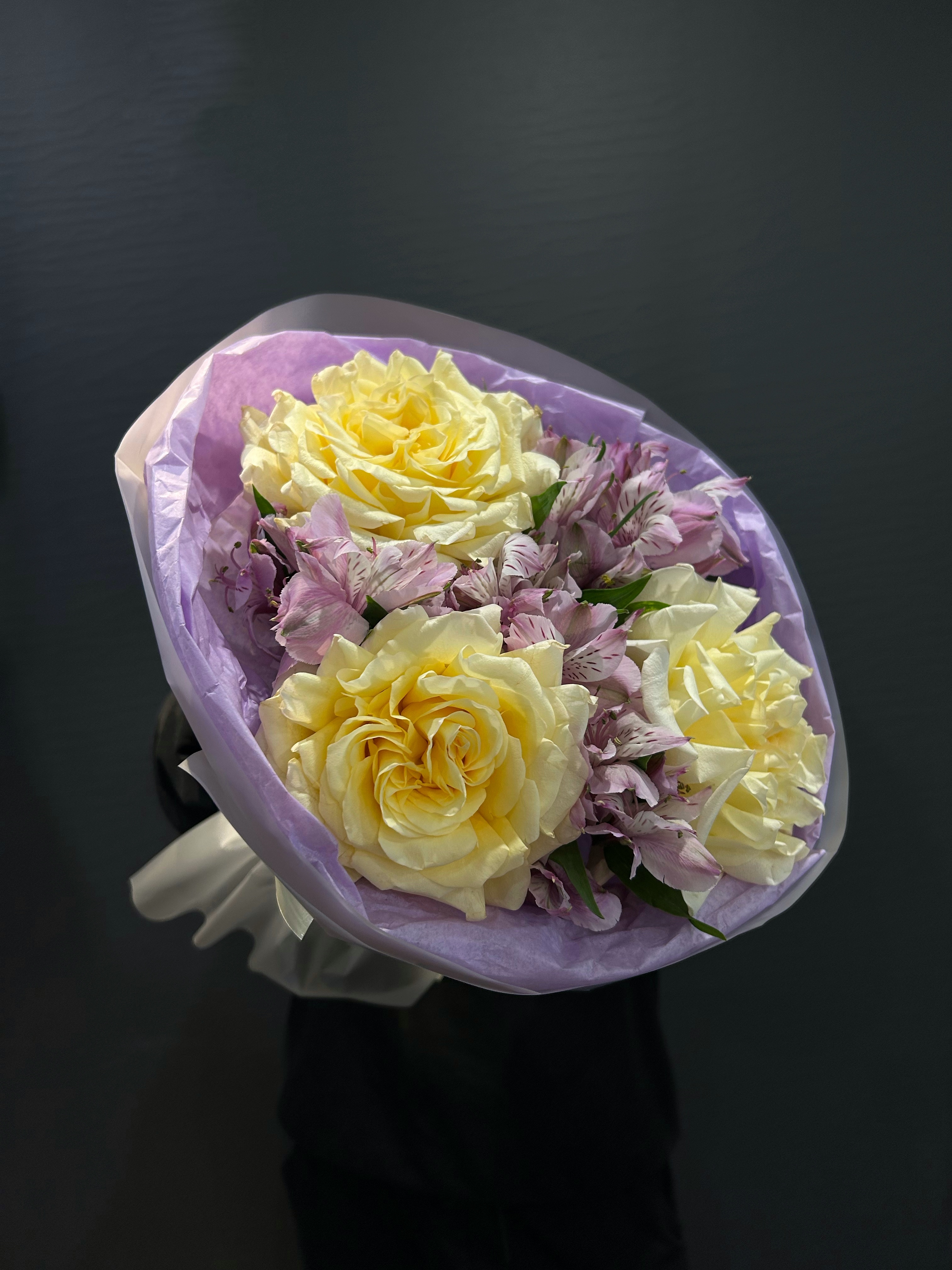 Альстромерии, словно деликатные акценты, добавляют композиции разнообразие и динамику. Их яркие, но при этом утонченные цвета воплощают радость и жизненную энергию, делая букет идеальным посланием для любого повода.