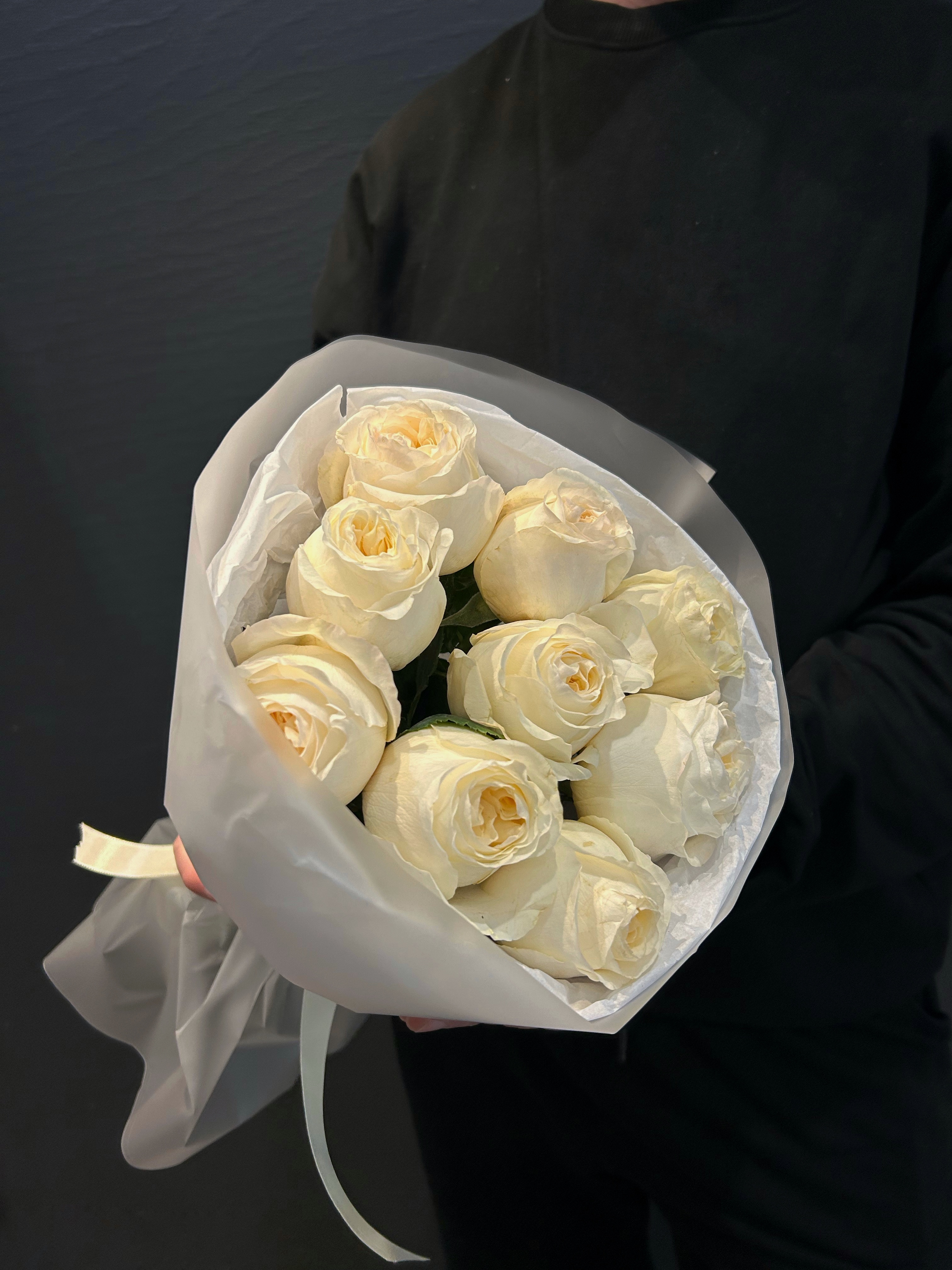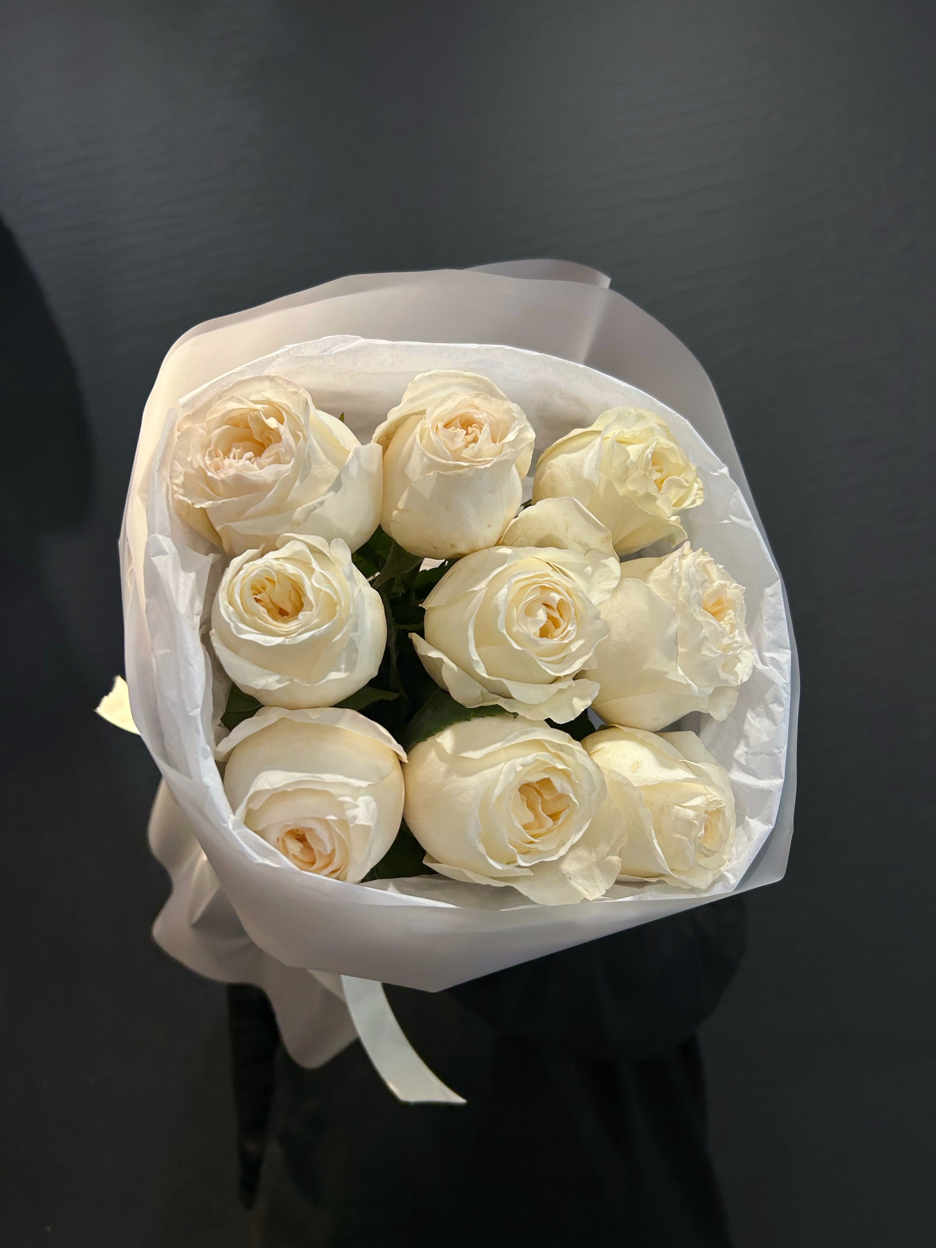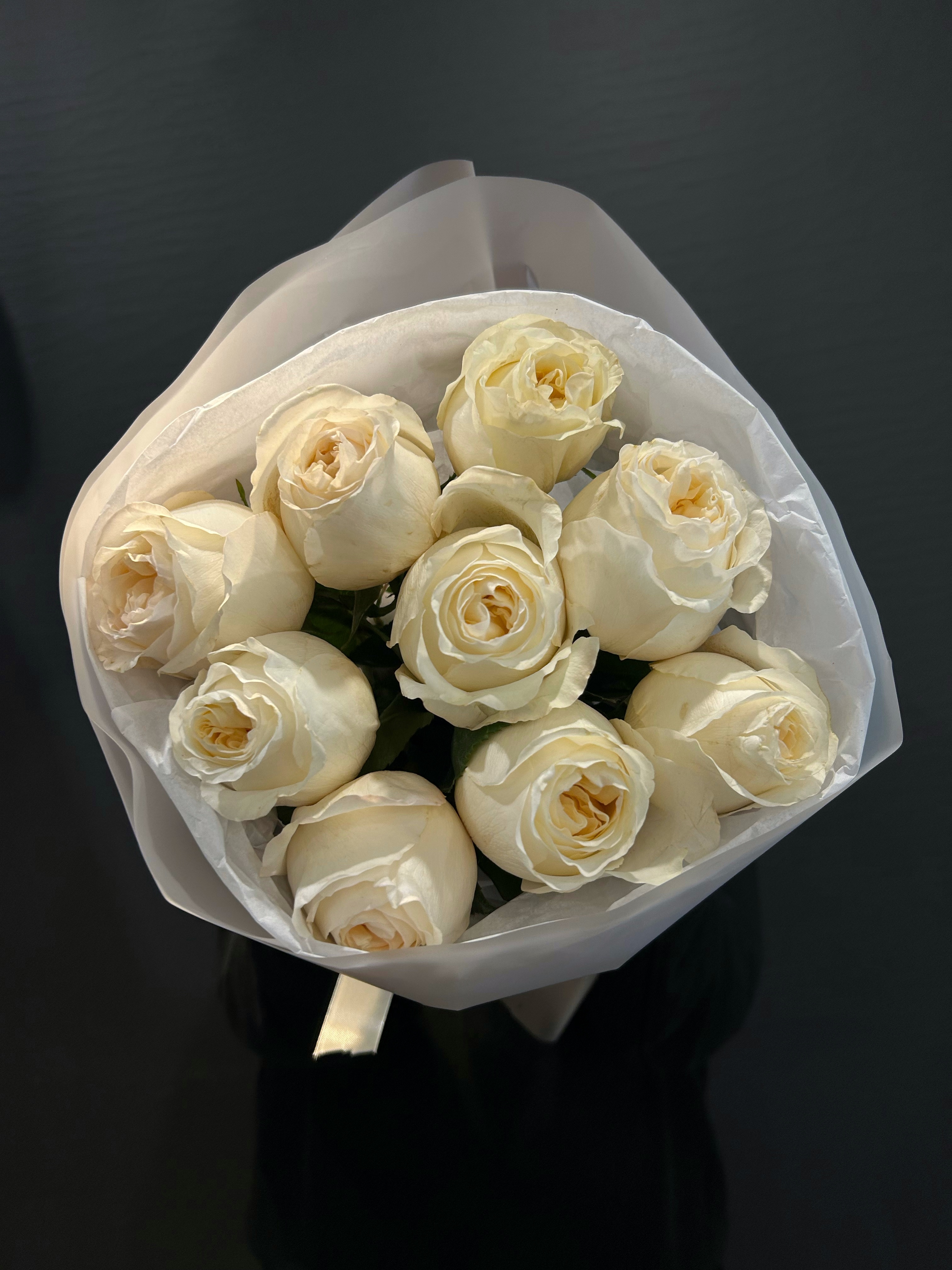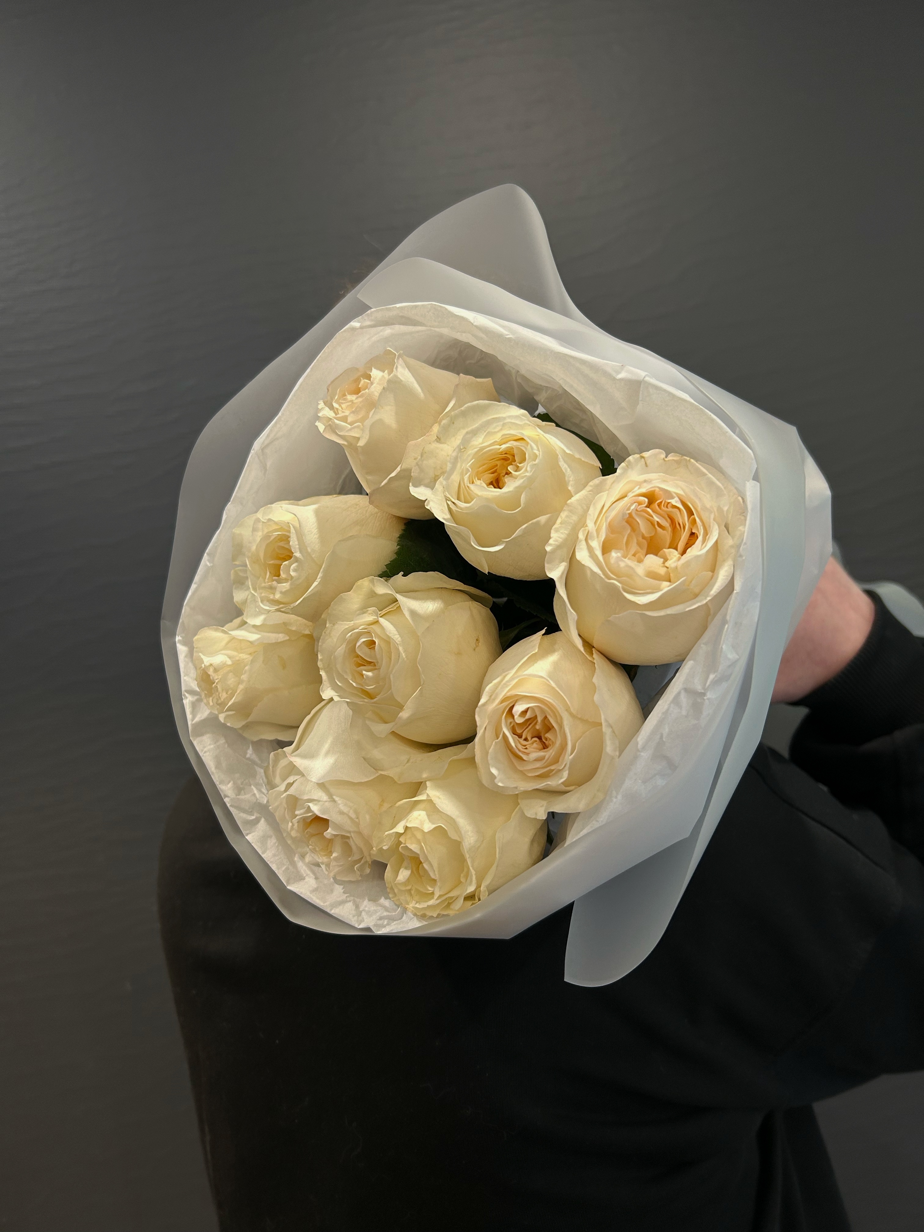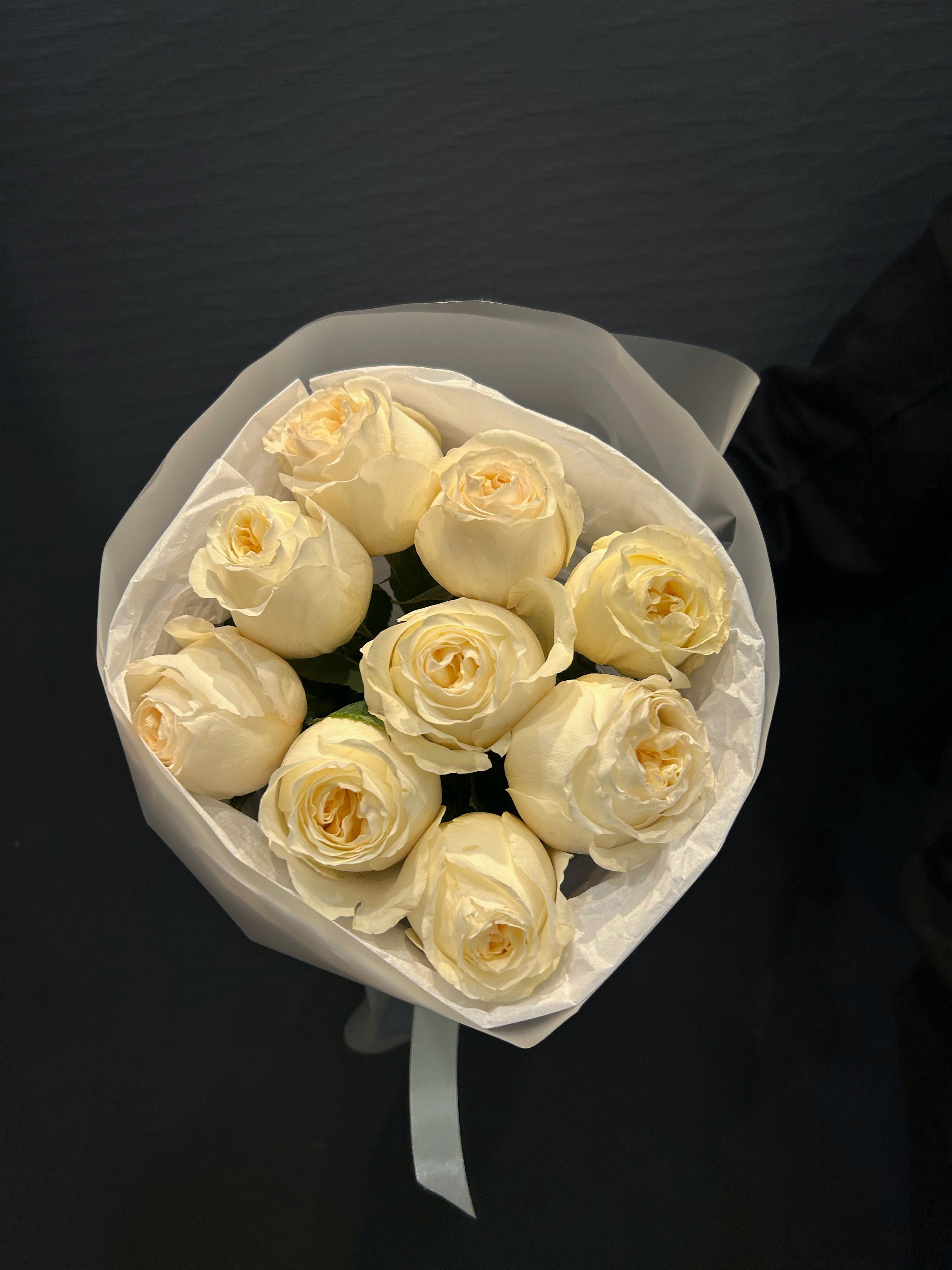 Погрузитесь в мир изысканности и нежности с букетом "Клио" из пионовидных роз Vicky Garden. Это не просто букет, это произведение искусства, в котором каждая из девяти кремовых роз раскрывает свои лепестки подобно пышным пионам, обещая воплотить самые тонкие оттенки чувств. Сорт "Клио" известен своей уникальной пионовидной формой и сливочно-кремовым оттенком, который словно застывшее молоко, украшенное золотым светом утренней зари.