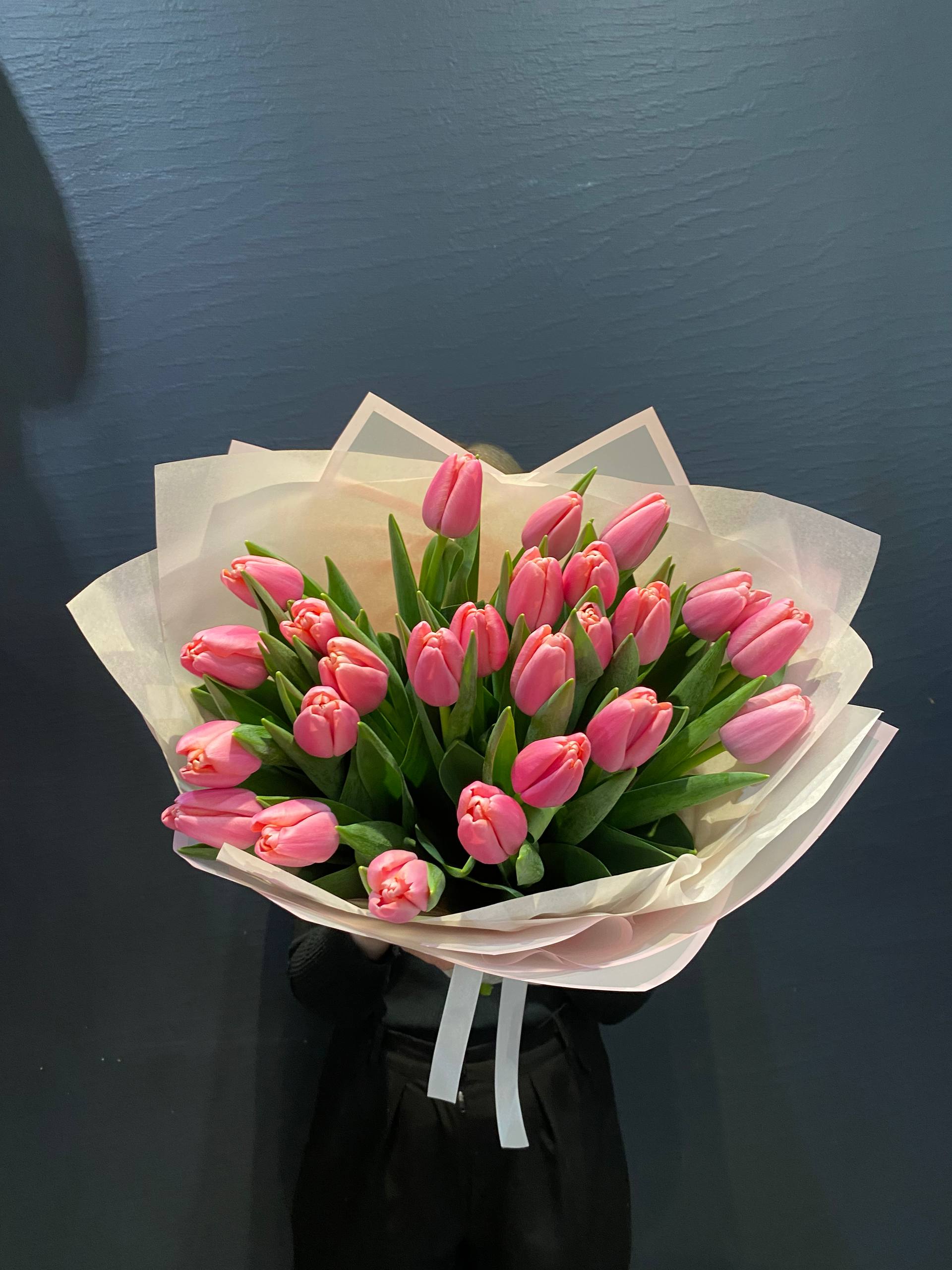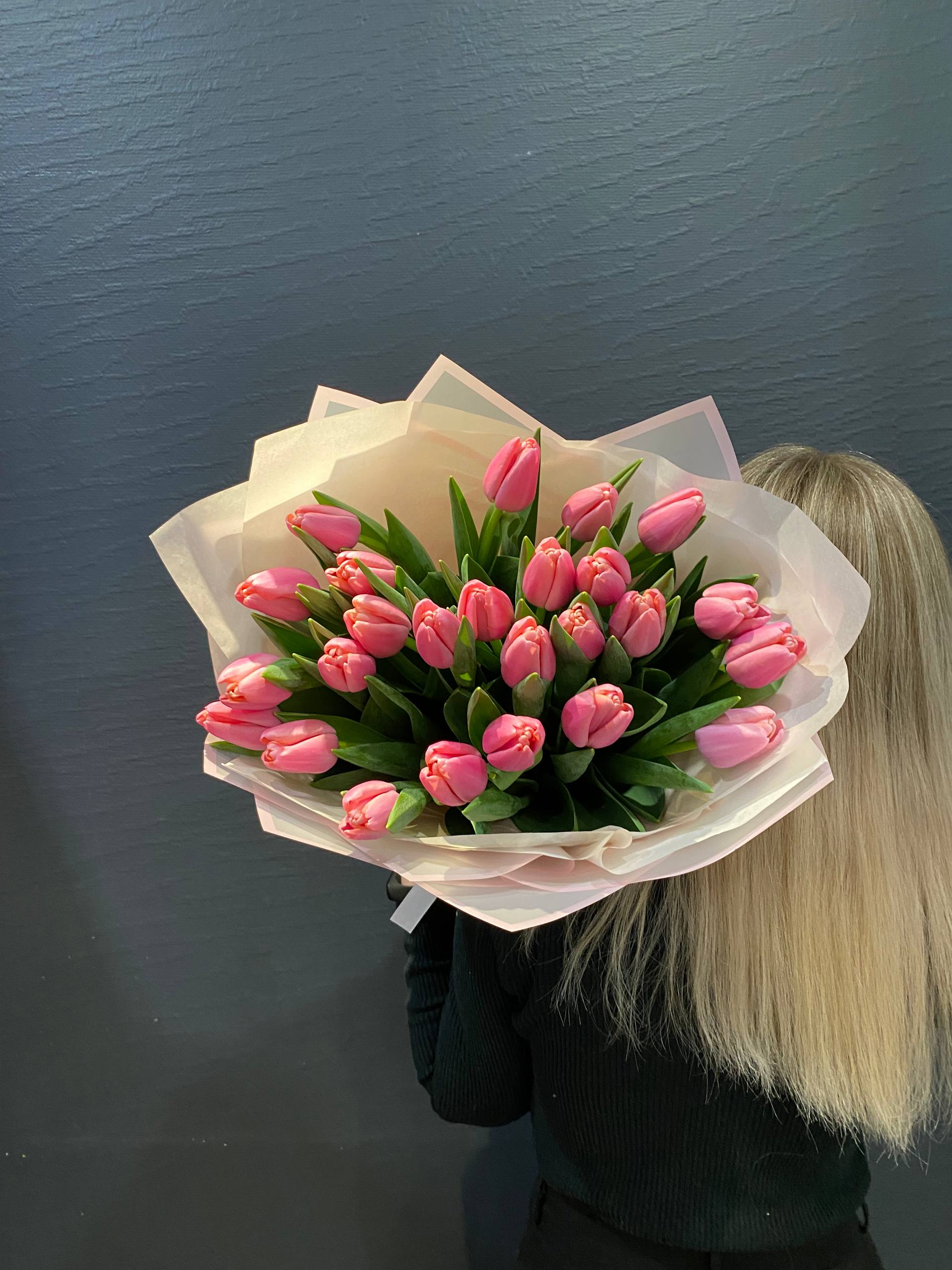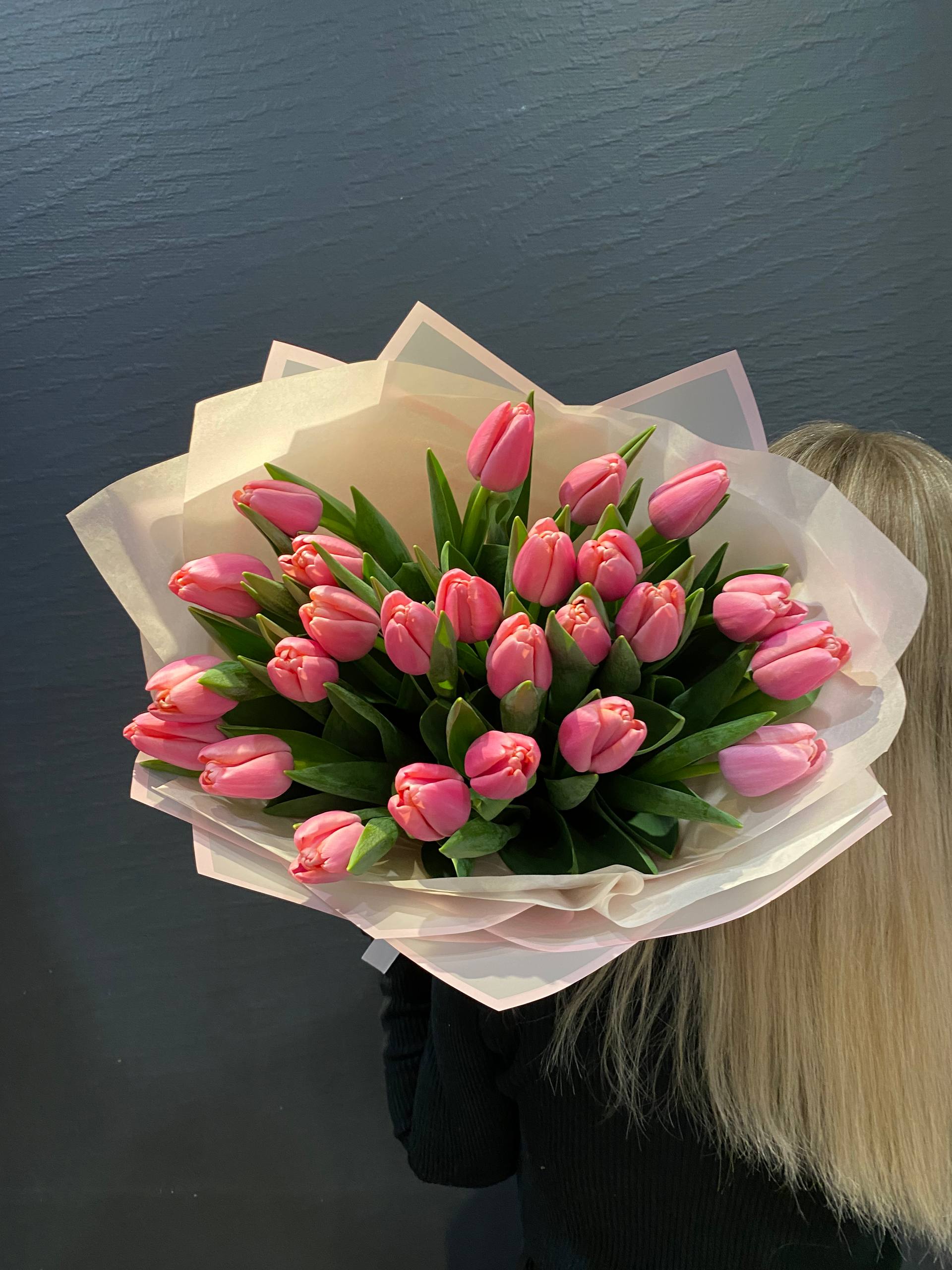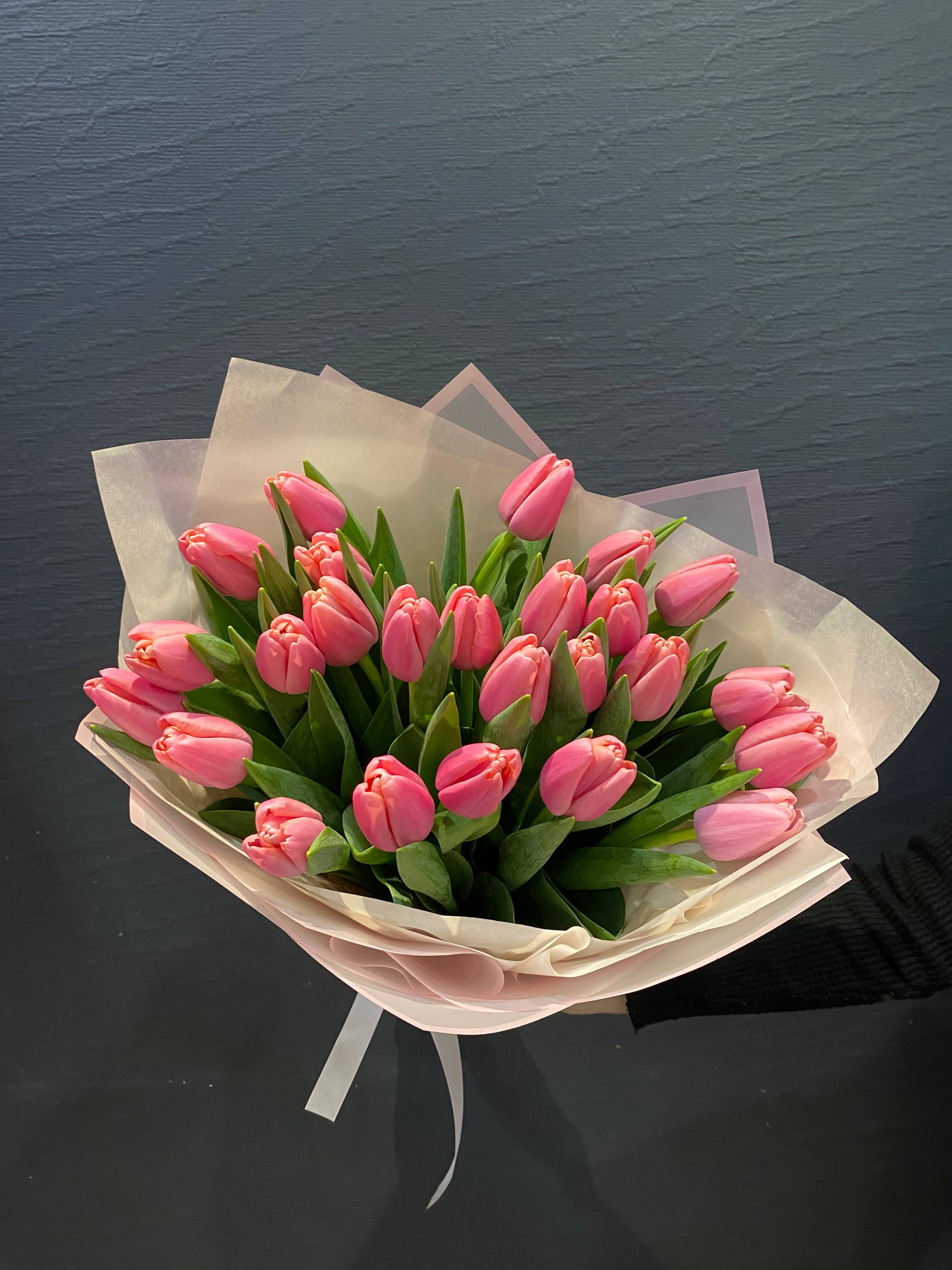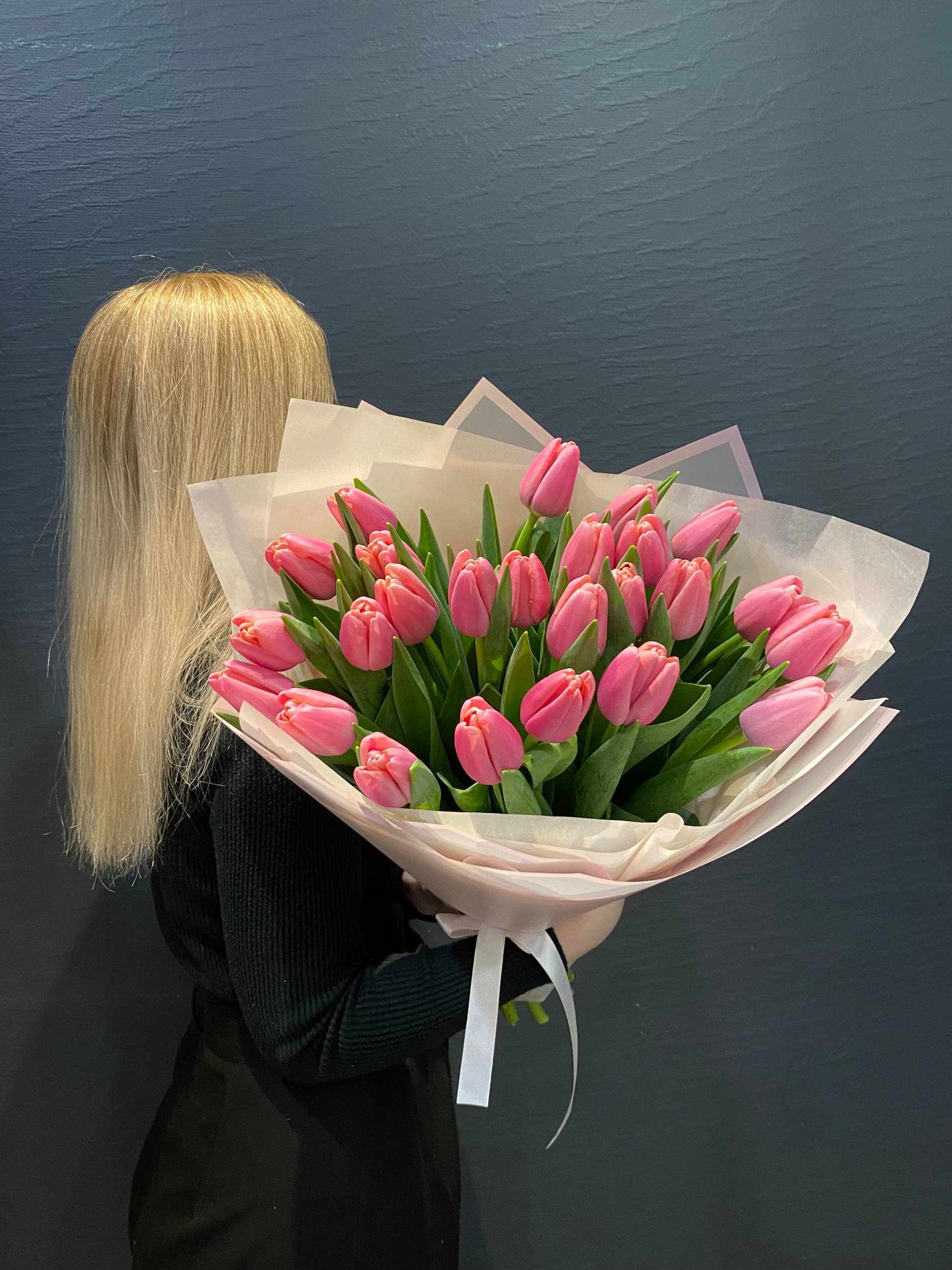 Представляем вам эксклюзивный букет из 25 розовых тюльпанов сорта "Трессор "Утренняя звезда"", воплощение нежности утреннего небосвода, перенесенное в изящные очертания цветочных лепестков. Каждый тюльпан этого букета тщательно отобран, чтобы представить вам идеальное сочетание цвета, формы и свежести.