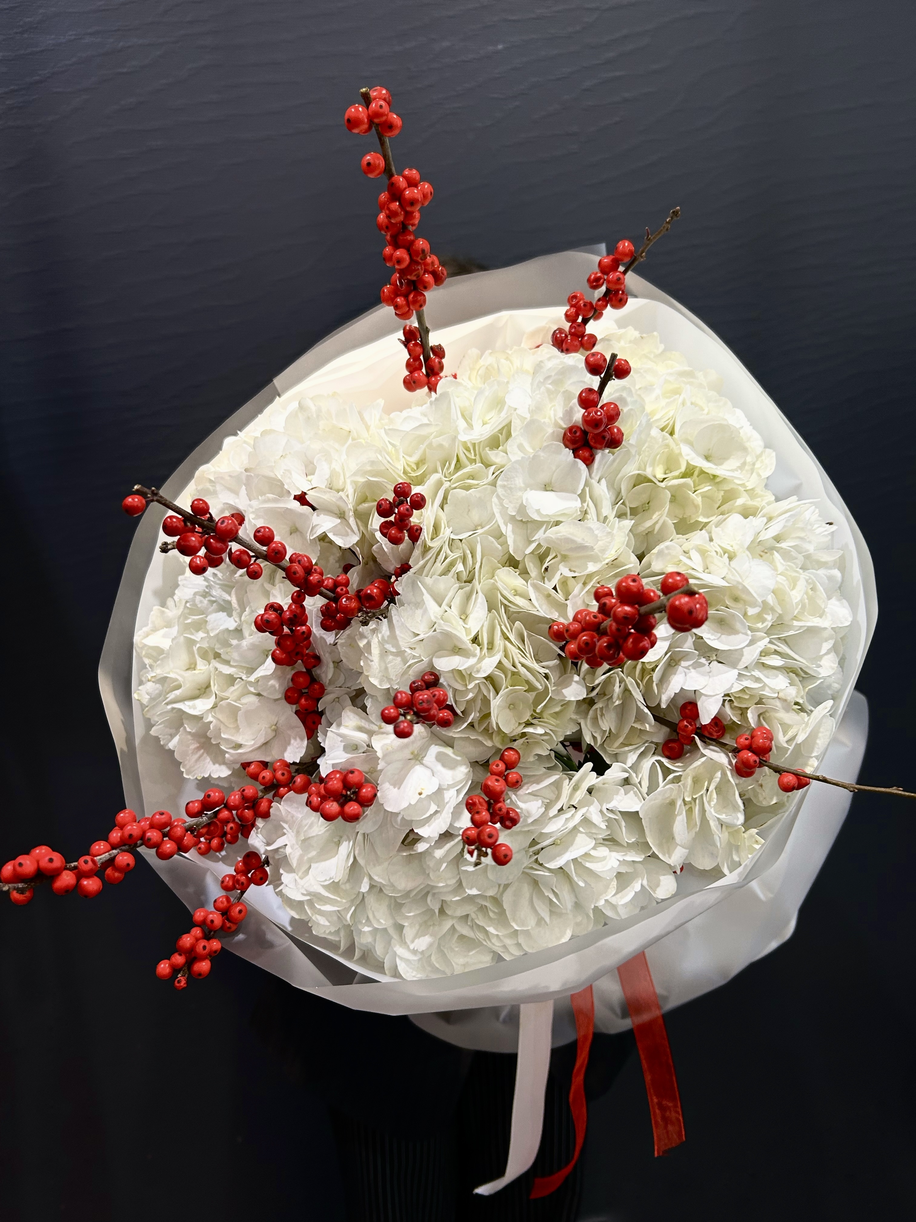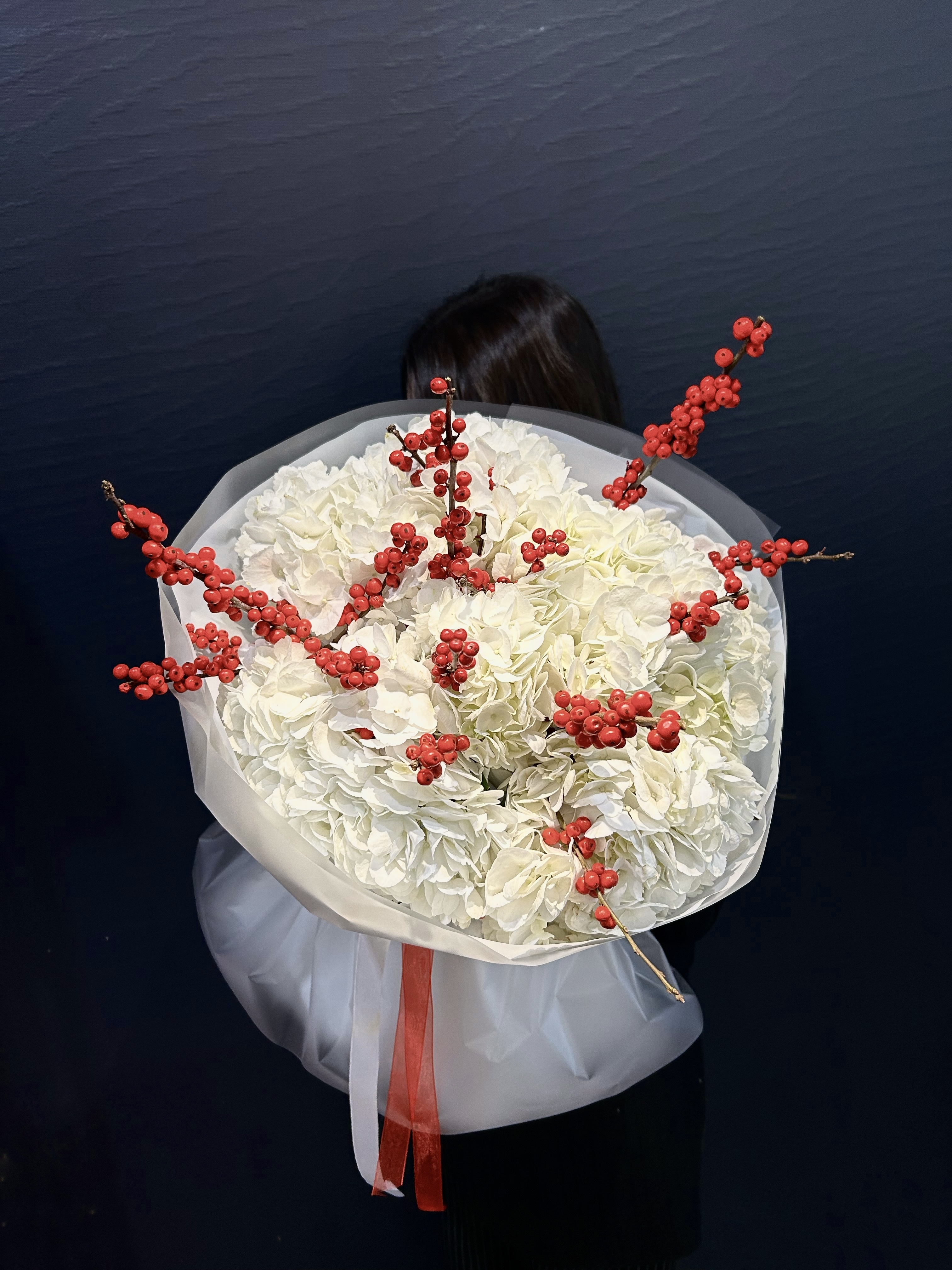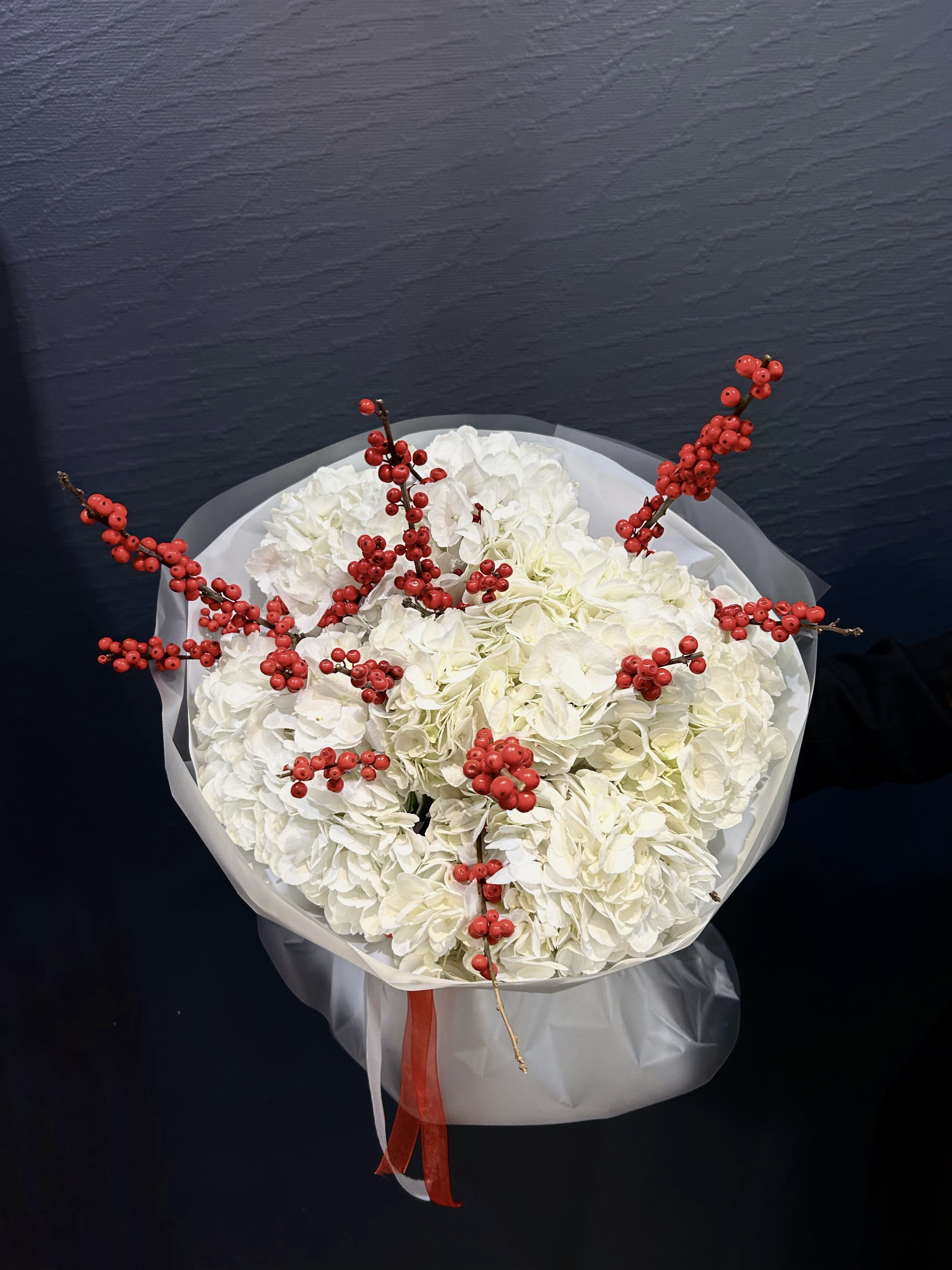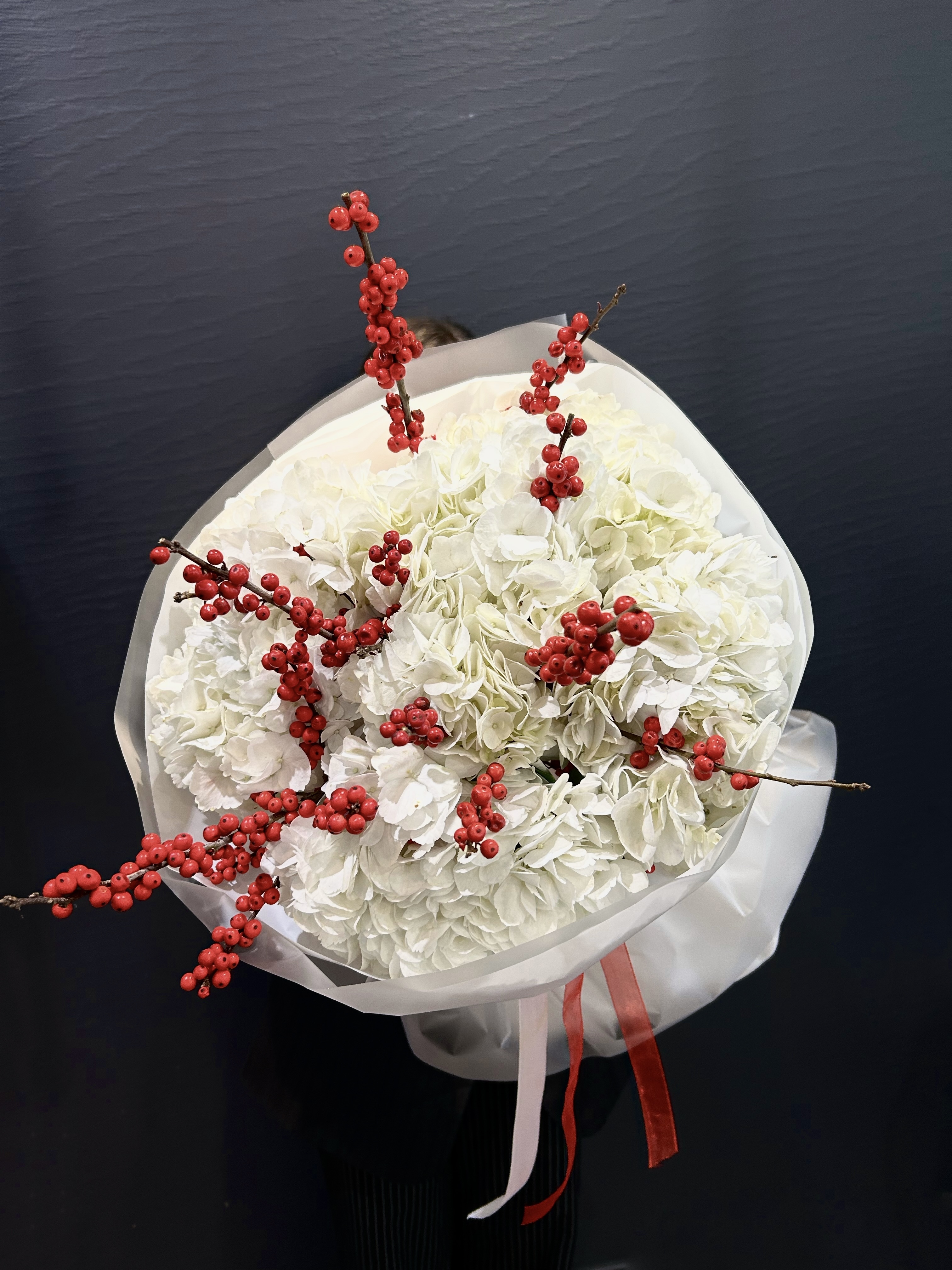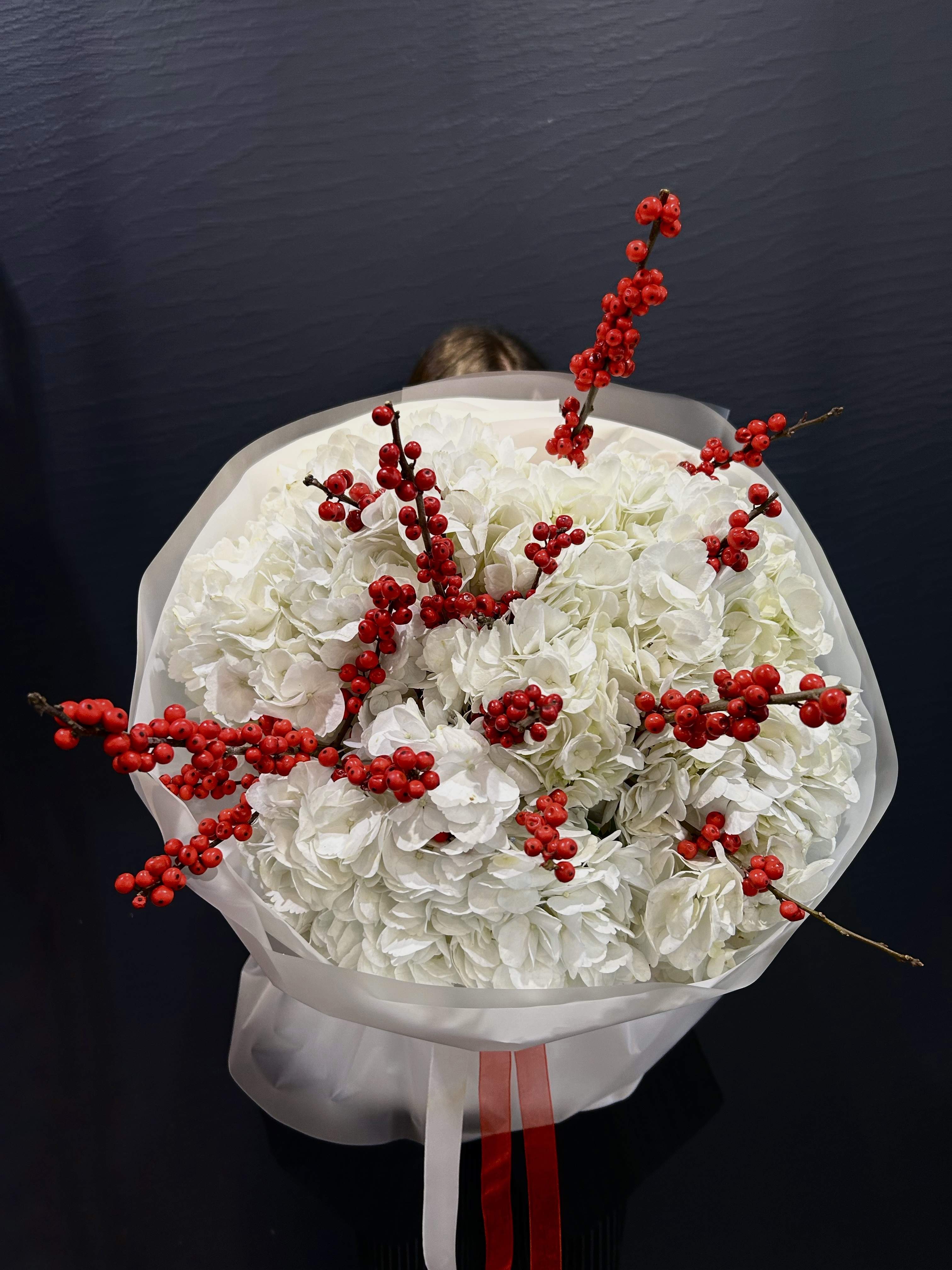 В каждом изящном витке "Лёгкого морозца" замерзает дыхание зимней феерии. Этот букет – как первые инеистые узоры на стекле, предвестник чудес и новогодних надежд. Белоснежные гортензии словно пушистые снежинки, нежно приземлившиеся на красный ковер илекса, создают ощущение свежести и чистоты зимнего утра.