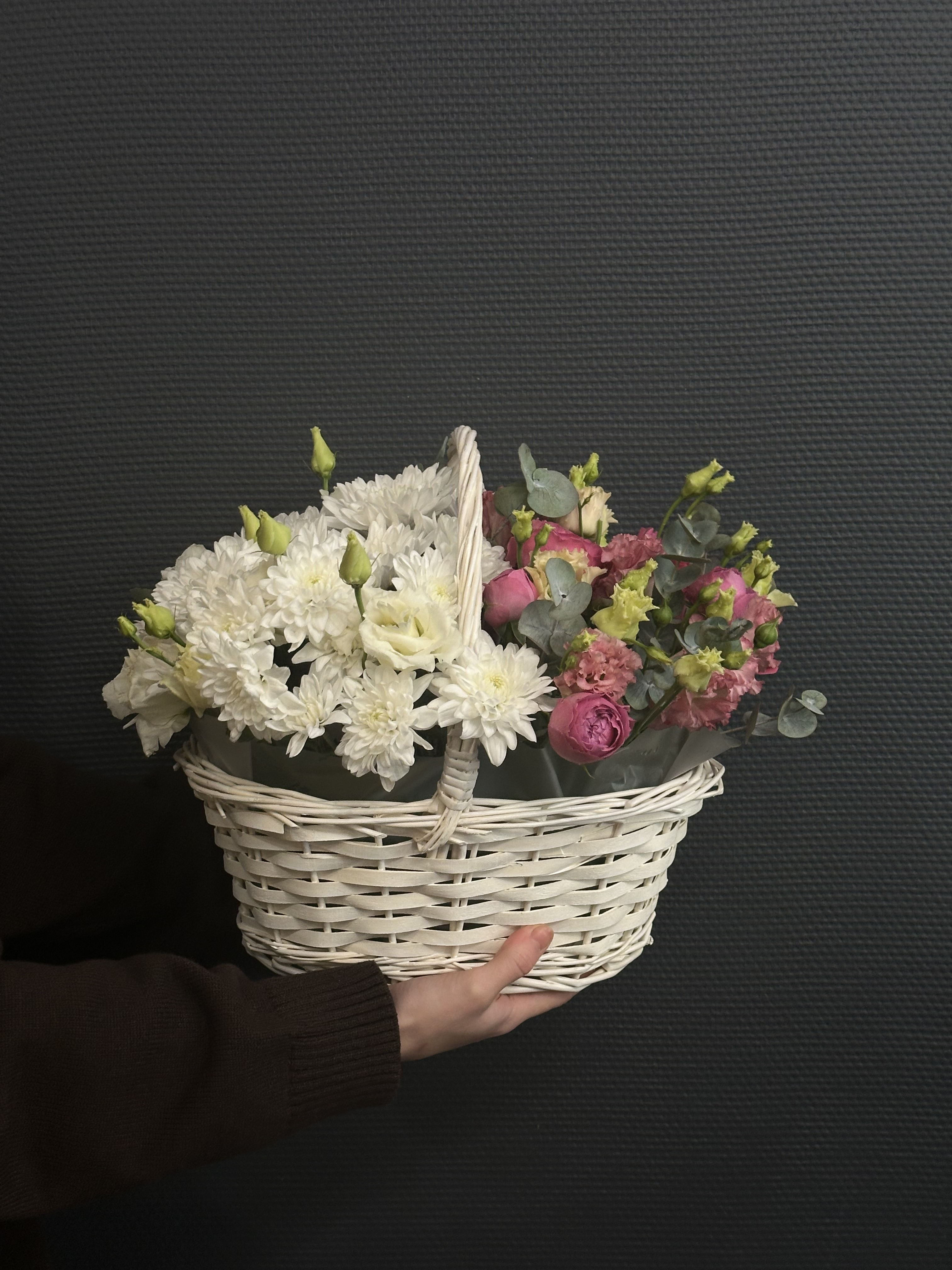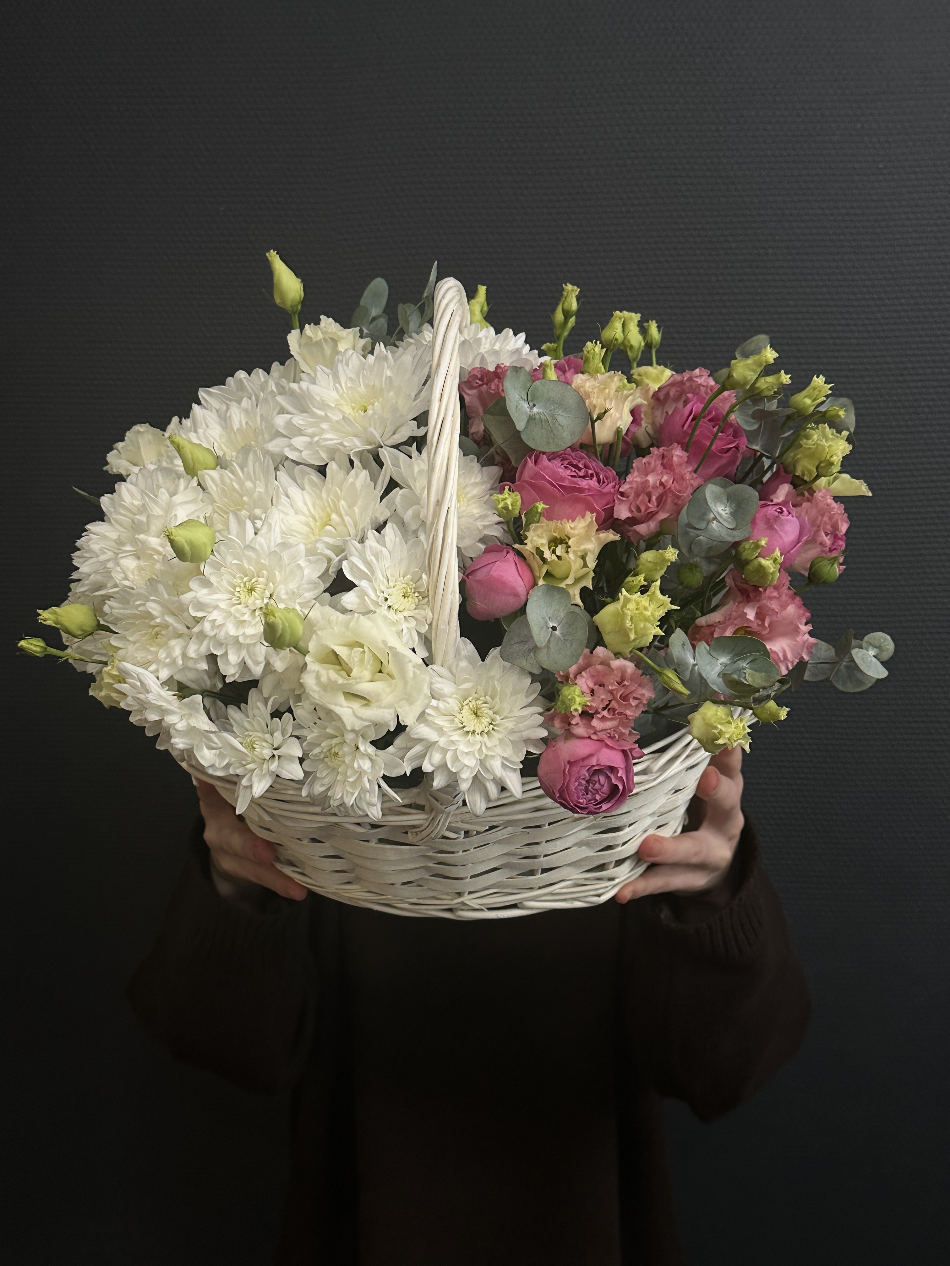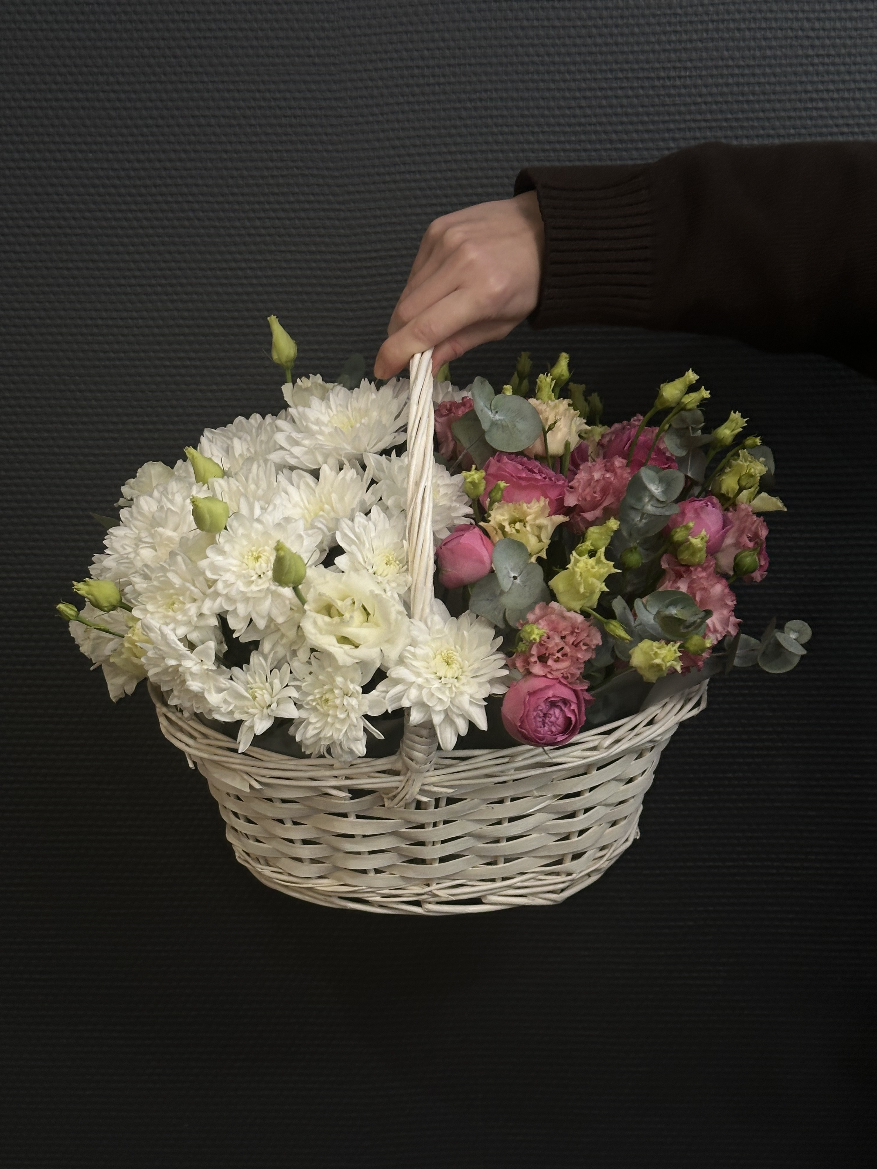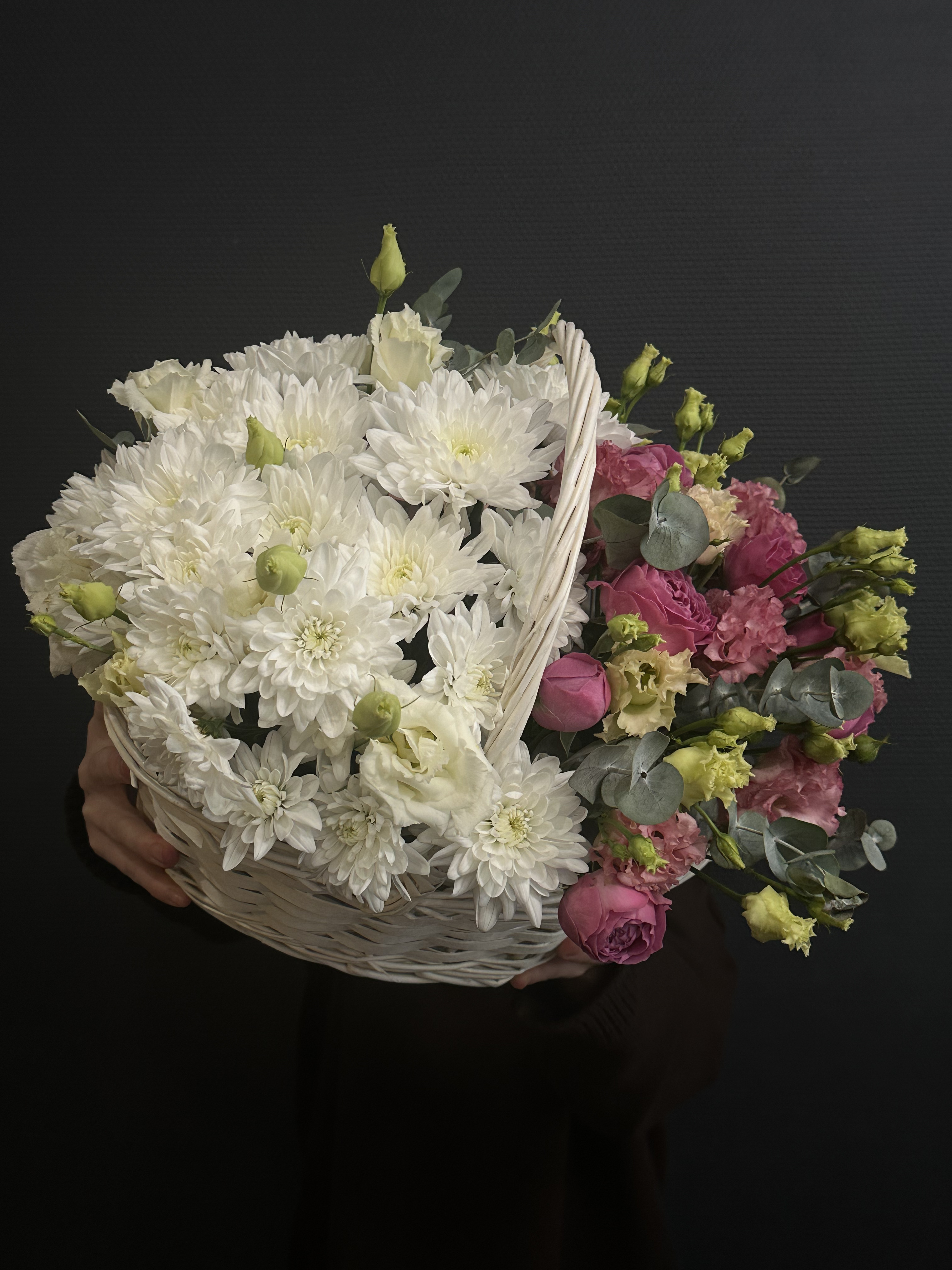 "Корзинка с хризантемой и эустомой "Цветы для мамы"" - это не просто букет, это мелодия воспоминаний, заключенная в лепестках. Каждый цветок в этой корзинке тщательно подобран, чтобы создать гармонию уюта и тепла, которыми окутывает мама.