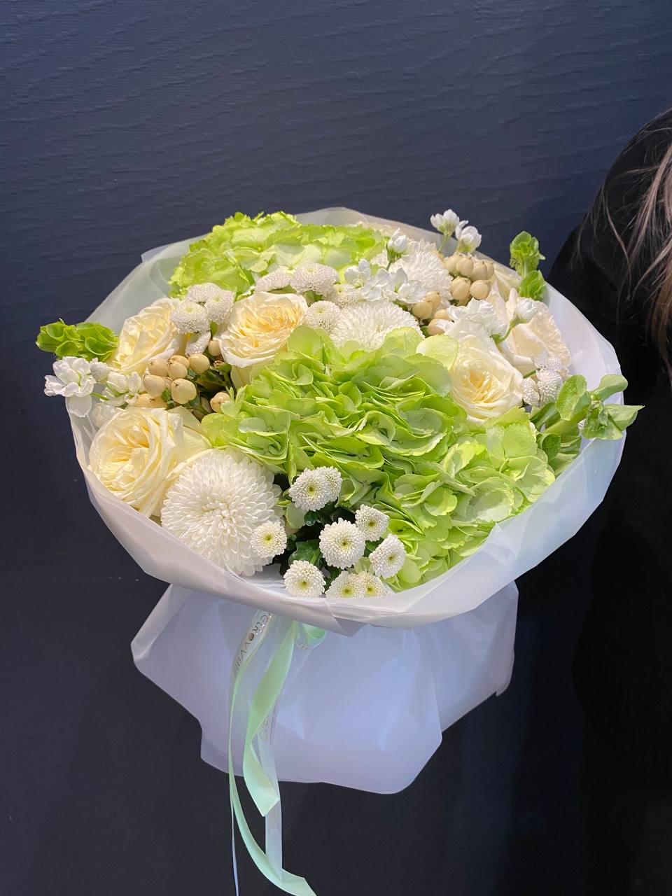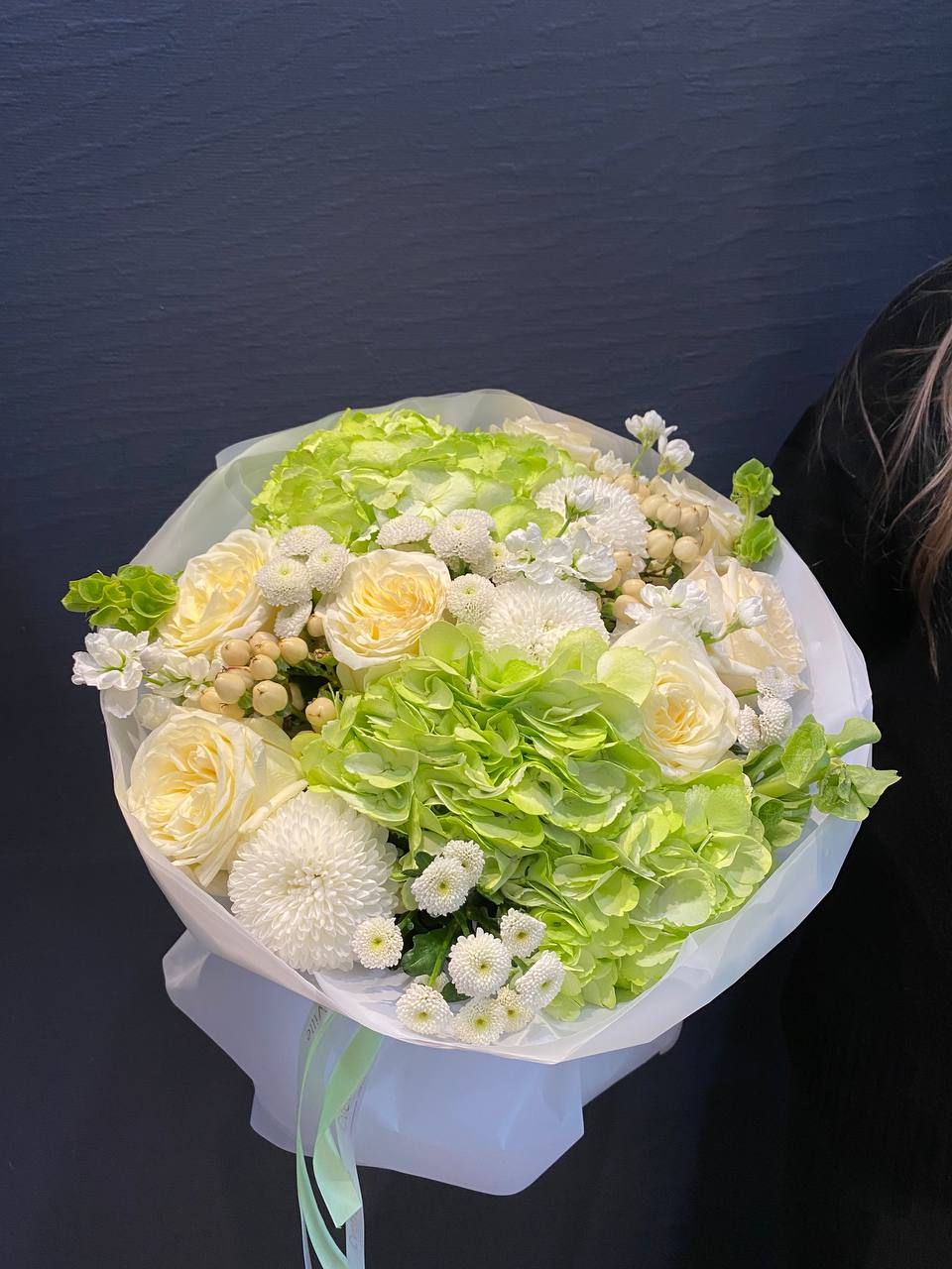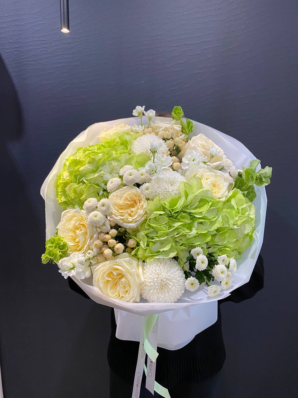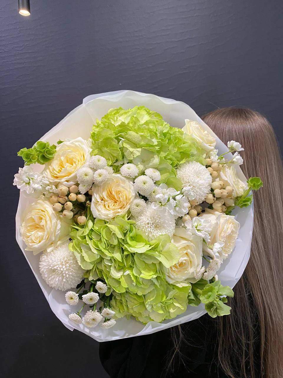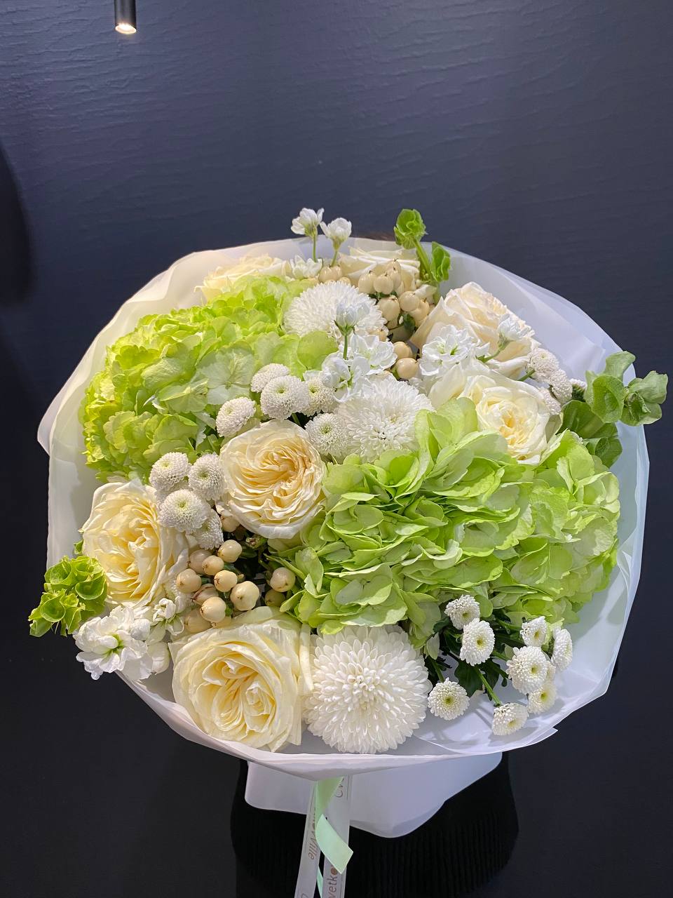 Откройте ворота весны с букетом "Весенний Аромат" — увлекательным комбинированием зеленых гортензий, белых хризантем сорта Сантини и Момоко, гиперикума, молюцеллы и волшебных роз сорта Кэндллайт. Этот букет излучает свежесть и легкость, идеален для тех, кто мечтает о легком дыхании природы в повседневной жизни. Зеленые гортензии, словно молодые листья, придают композиции яркость и жизненную силу, создавая великолепное фоновое полотно для других цветов. Белые хризантемы сорта Сантини и Момоко с их множеством нежных лепестков олицетворяют гармонию и комфорт, привносят в букеты безмятежность весеннего солнца и тишину цветущего сада. Гиперикум добавляет нотки яркости с его ягодами, символизируя радость и богатство жизни, в то время как молюцеллы создают легкость и воздушность, словно утренний туман на свежем воздухе. Розы сорта Кэндллайт, с их теплым светлым оттенком, завершают этот волшебный ансамбль, придавая букету элегантность и романтическое настроение. "Весенний Аромат" — это больше, чем просто букет; это приглашение окунуться в весенние переживания, наполненные счастливыми моментами и новыми начинаниями. Подарите его любимым и дайте возможность весеннему настроению озарить их сердца!