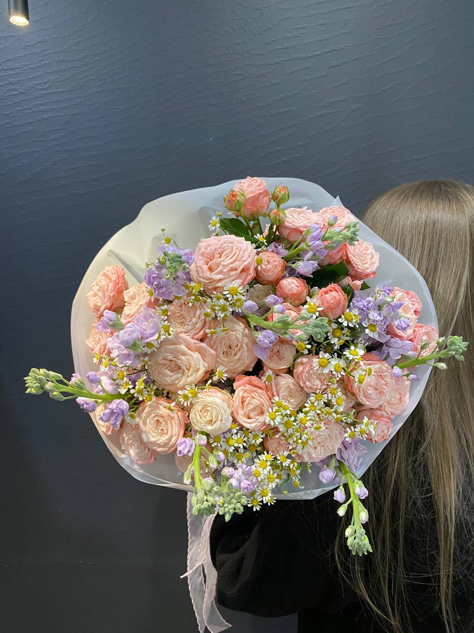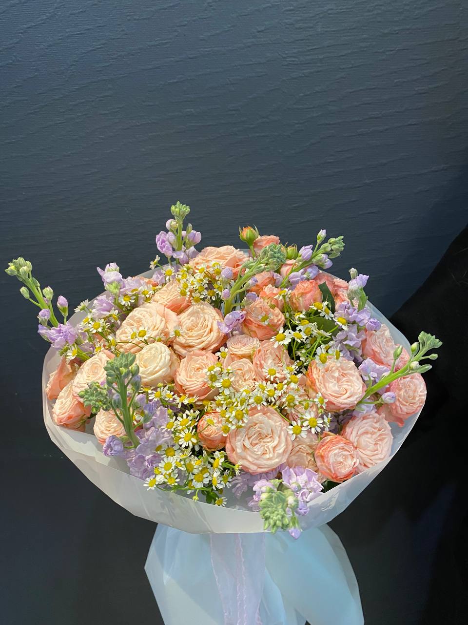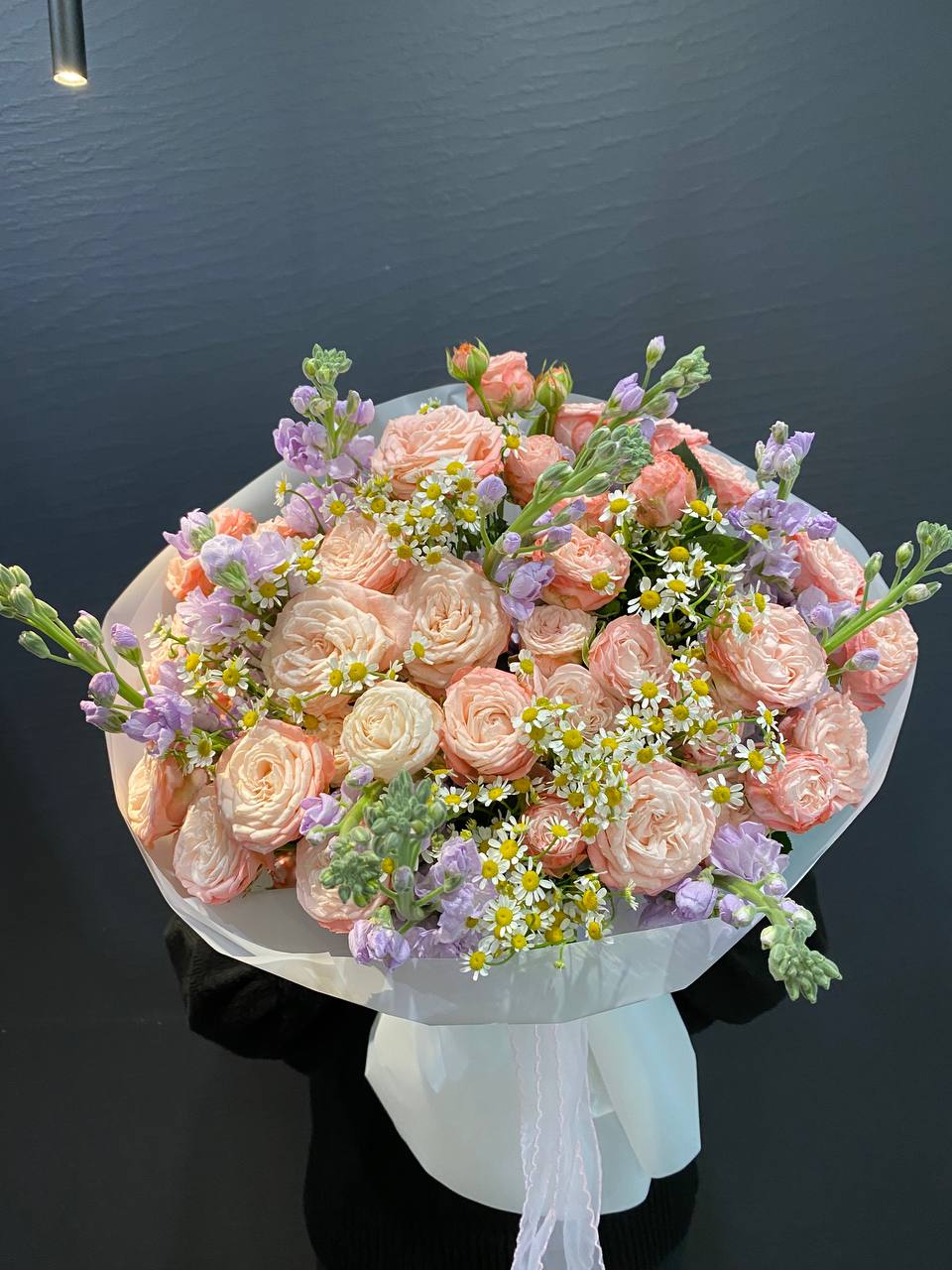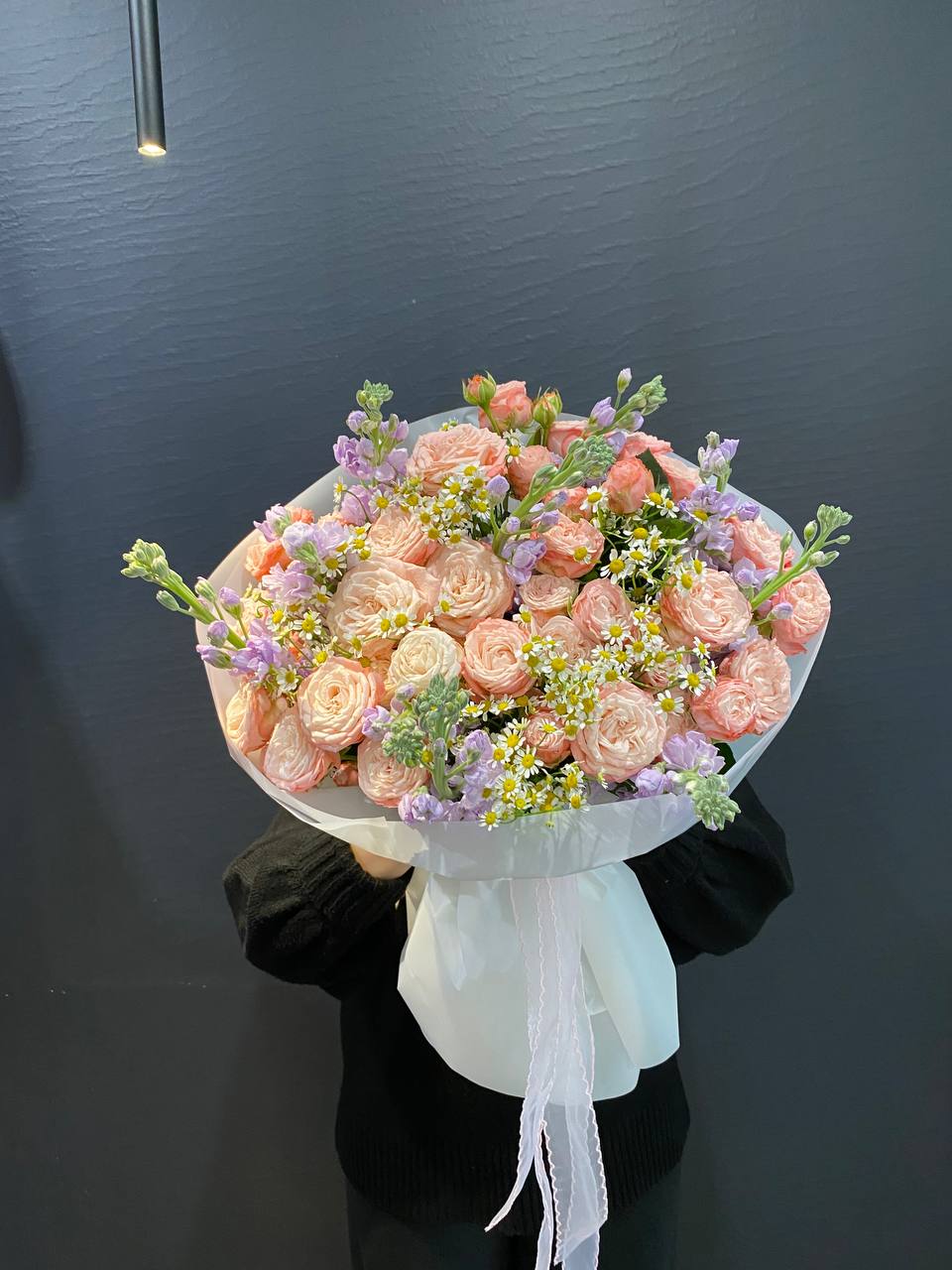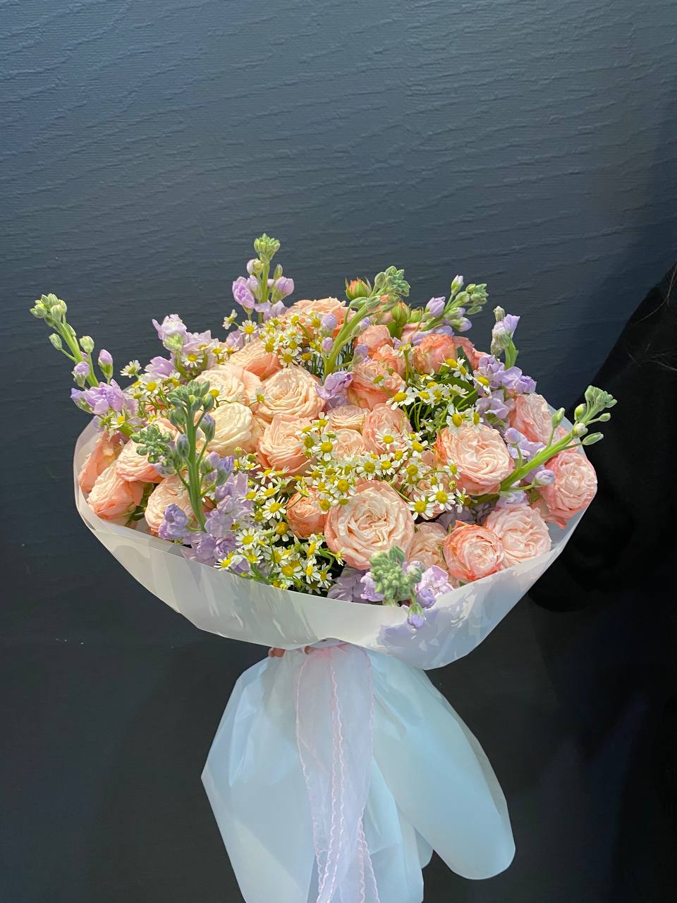 Подарите себе или своим близким атмосферу весеннего пробуждения с букетом "Пробуждение природы" — удивительным сочетанием розовых кустовых роз, полевых ромашек и ароматной маттиолы. Этот букет словно создан для того, чтобы напомнить о том волшебном моменте, когда природа просыпается от зимнего сна, распуская свои нежные лепестки и наполняя воздух свежестью и радостью. Розовые кустовые розы, символизирующие любовь и нежность, создают яркий акцент, даря каждый день особую атмосферу тепла и заботы. Полевая ромашка с её невидимой простотой и естественной красотой привносит в композицию нотки беззаботности и легкости, как будто сама природа улыбается вам. Ароматные маттиолы с их утонченным запахом обвивают букет мягкой вуалью, создавая гармонию и волшебство. "Пробуждение природы" — это не просто букет, а настоящая стихия весеннего настроения, вдохновляющая на новые свершения. Он станет идеальным подарком для любого праздника или просто как знак внимания в обычный день, напоминая о том, как прекрасна жизнь и как важны моменты, наполненные природной красотой. Пусть этот букет станет вашим путеводителем в мир счастья и вдохновения!