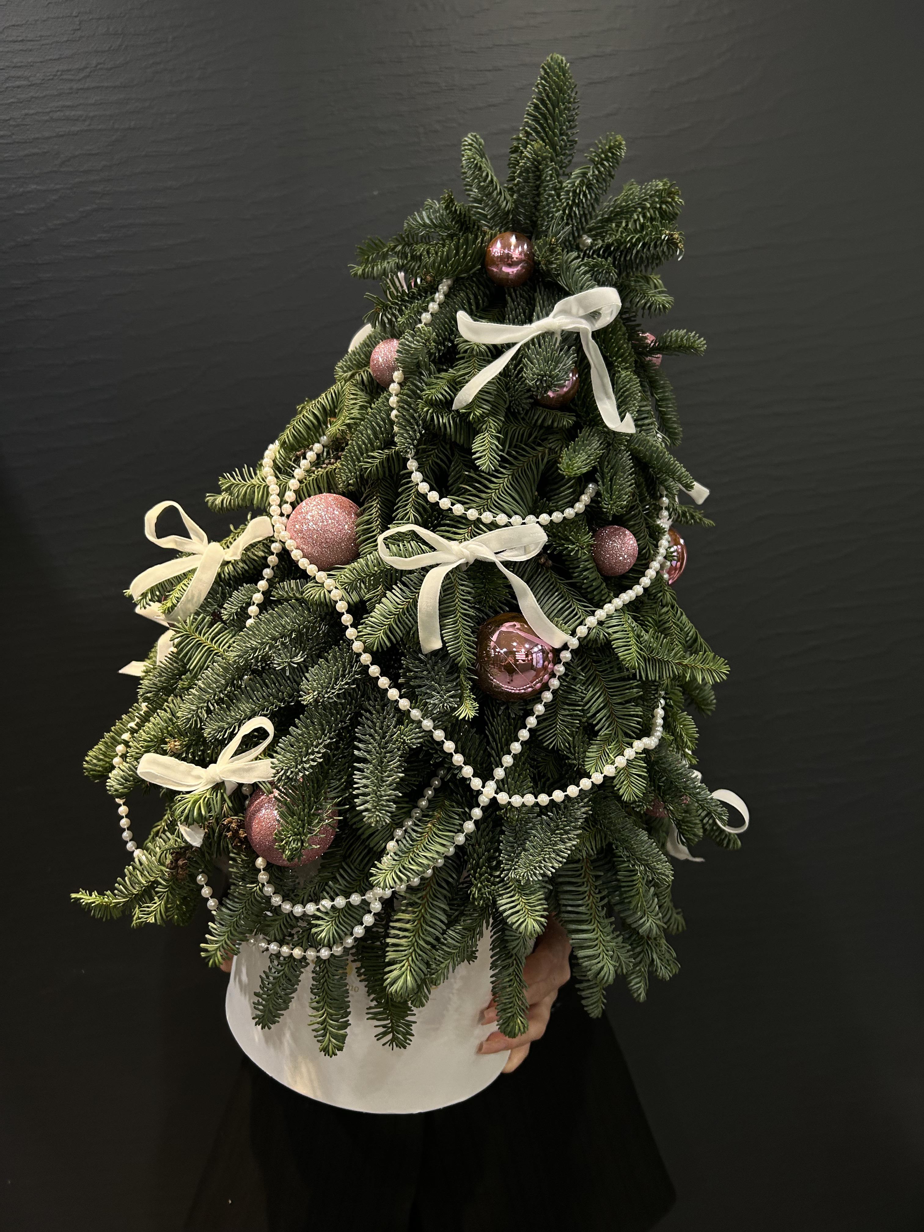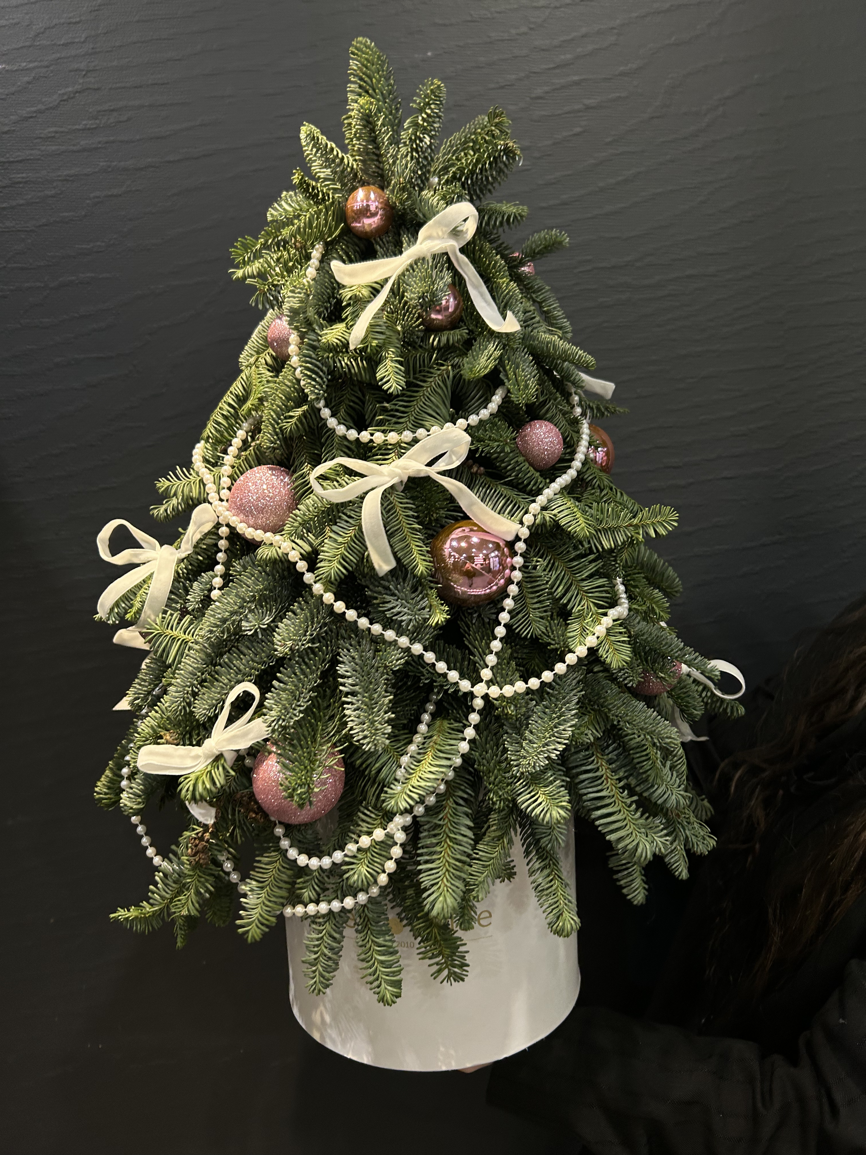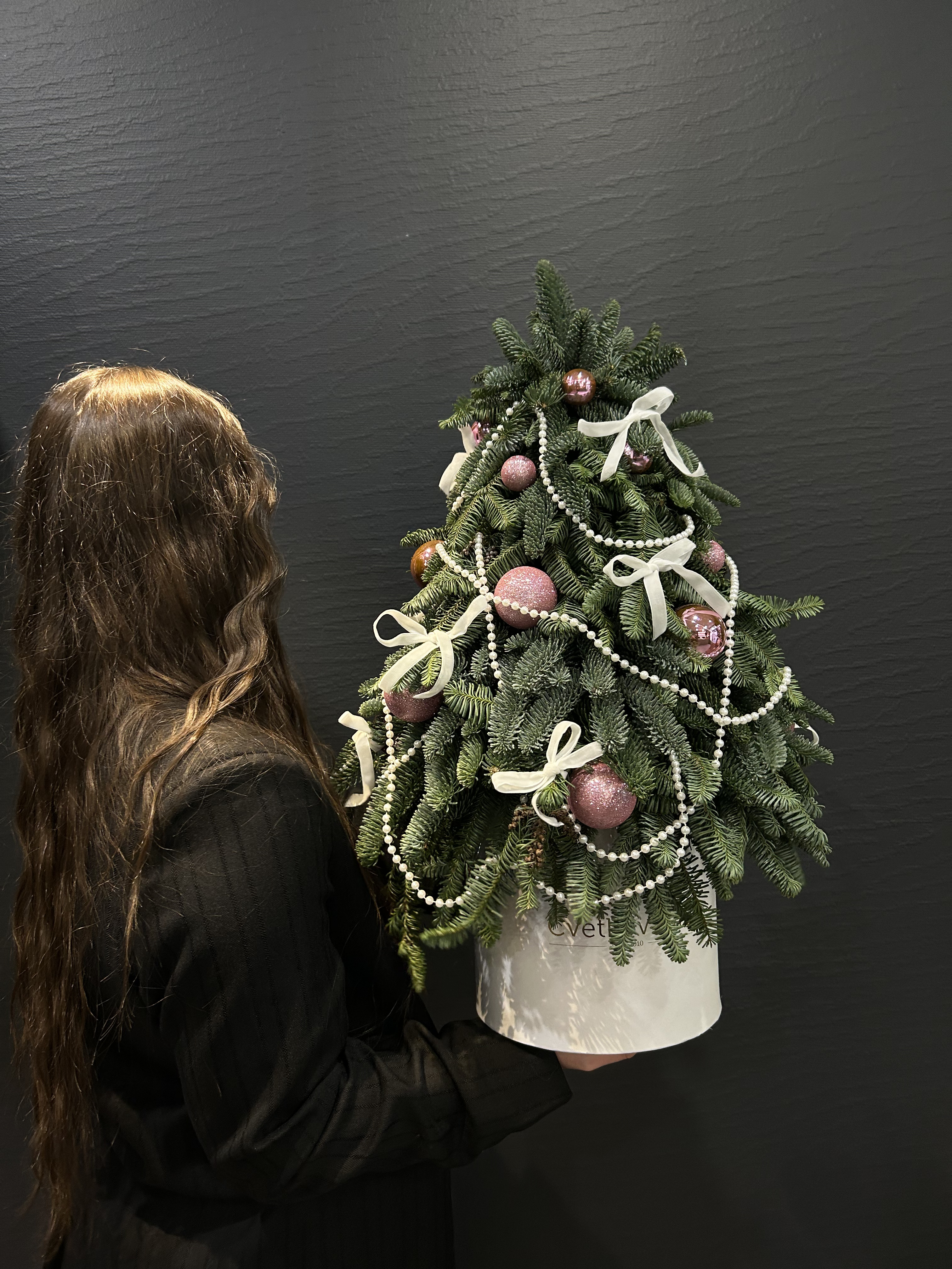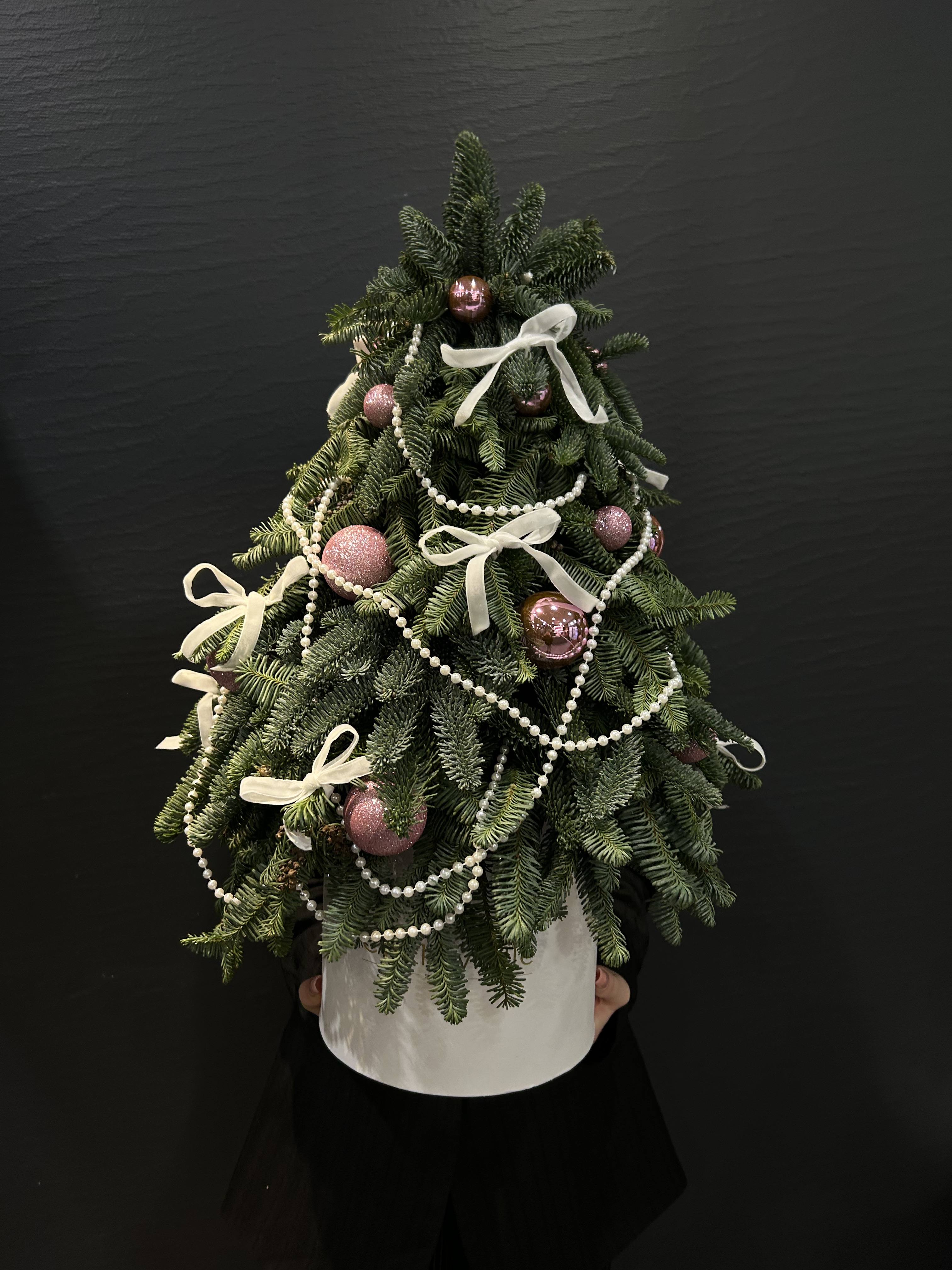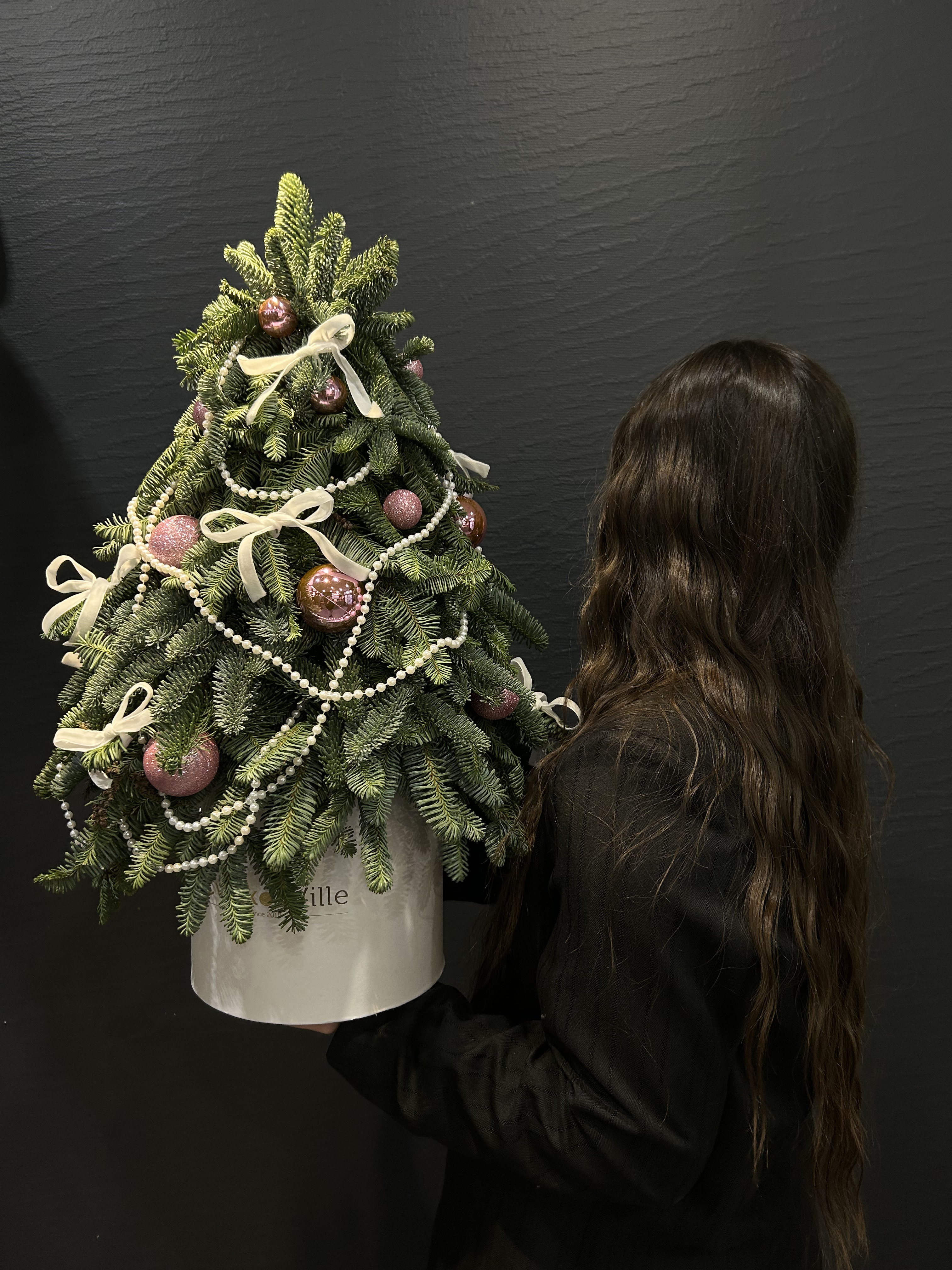 Погрузитесь в волшебство зимних праздников с эксклюзивной композицией из Нобилиса "Новогодняя сказка". Эта утончённая елочка, аккуратно уложенная в изысканную шляпную коробку, станет жемчужиной вашего интерьера. Каждая веточка нежно обвита белоснежными бантами, словно первый снег покрыл её волшебные лапы. Розовые шары, мерцающие среди зелени, добавляют изысканности и нежности, напоминая о радужных снах и детских мечтах.