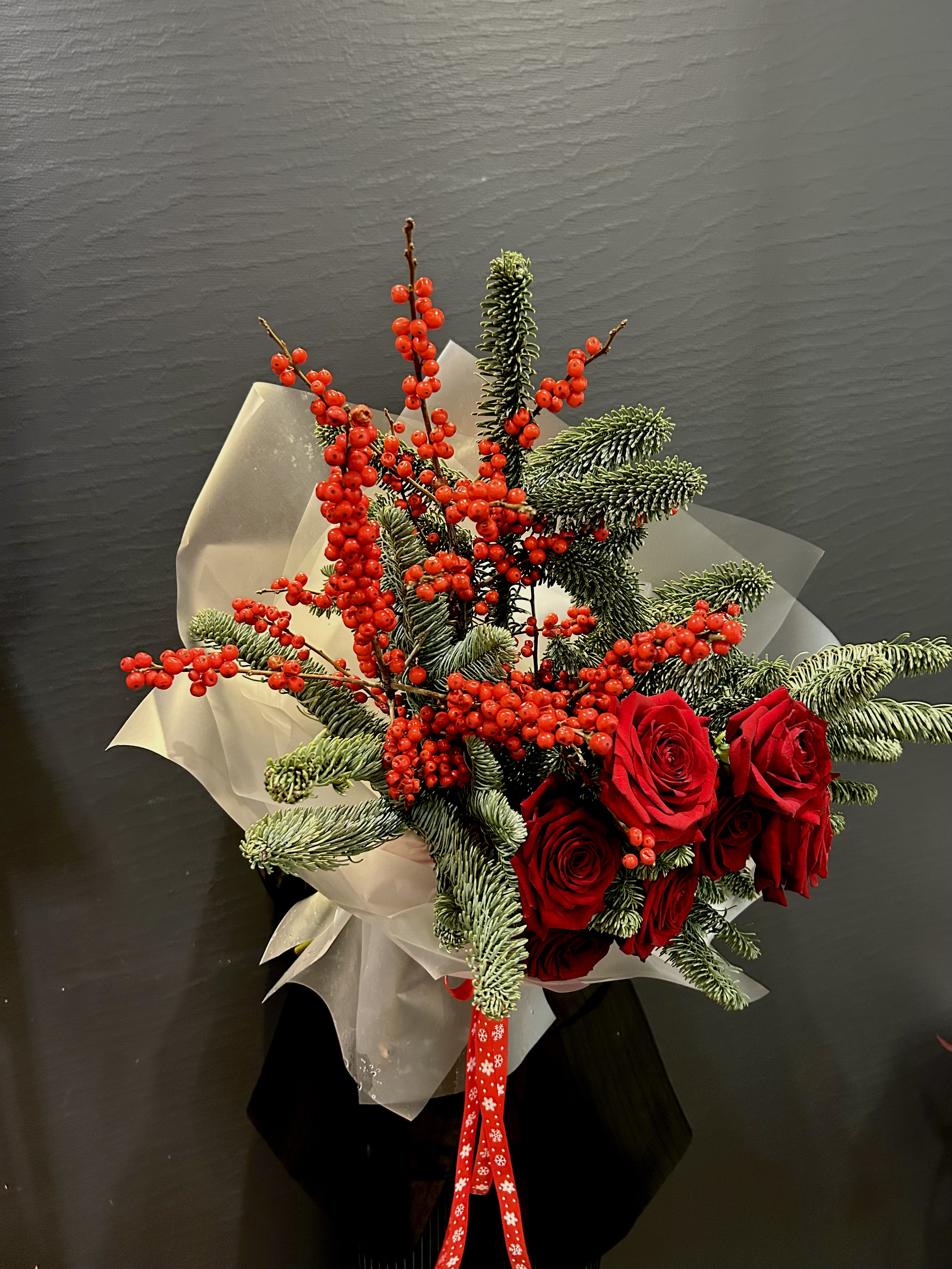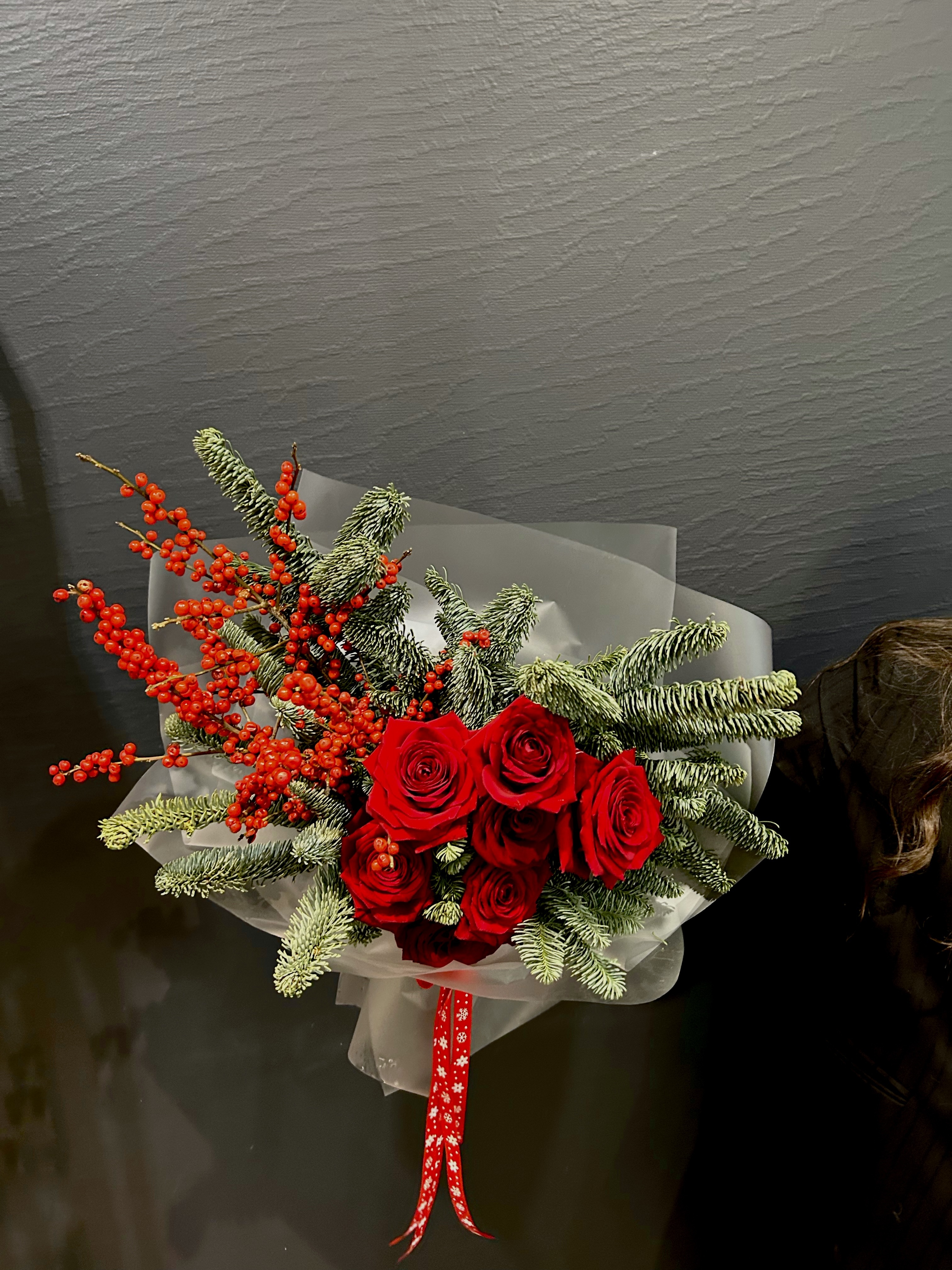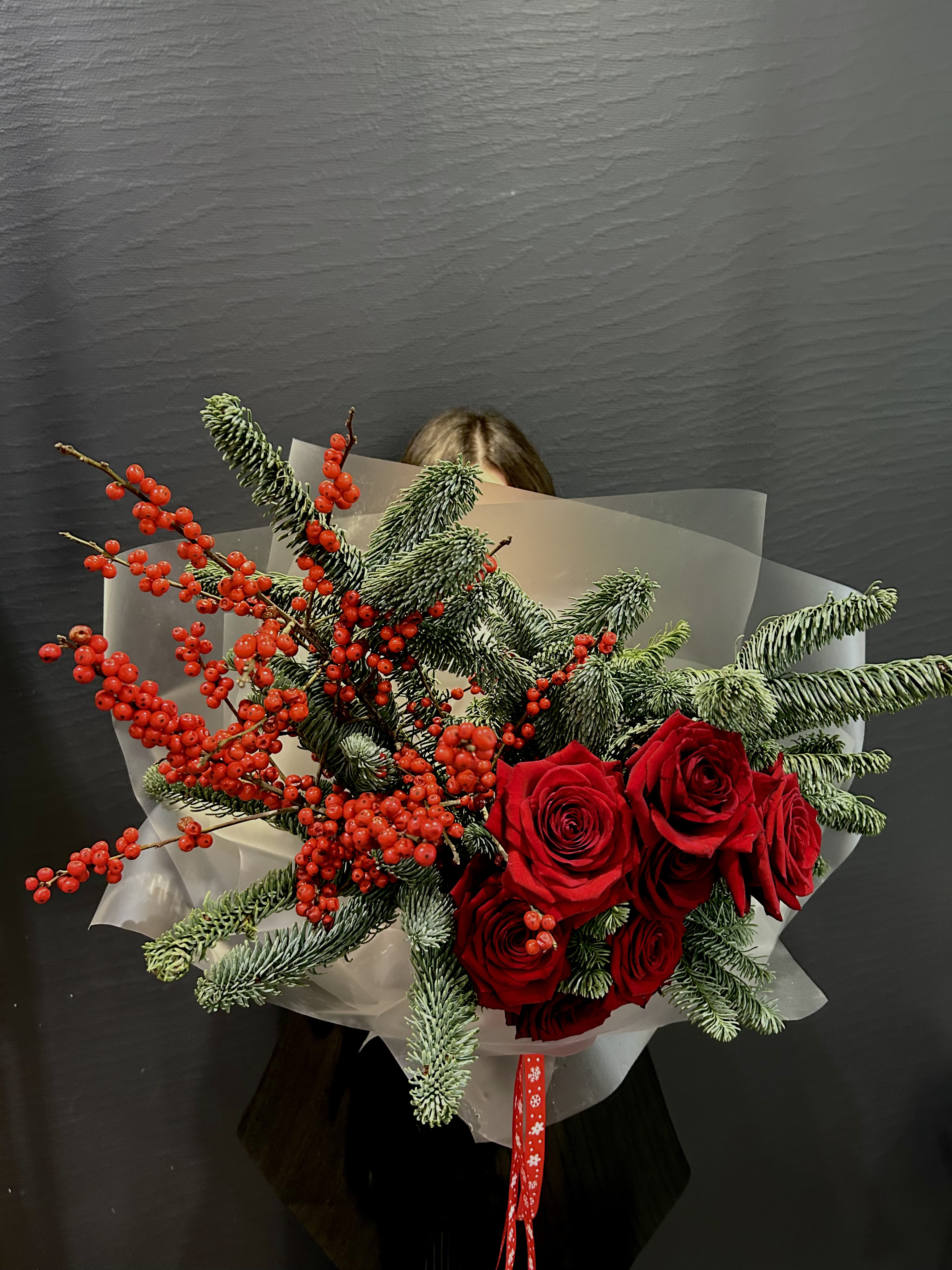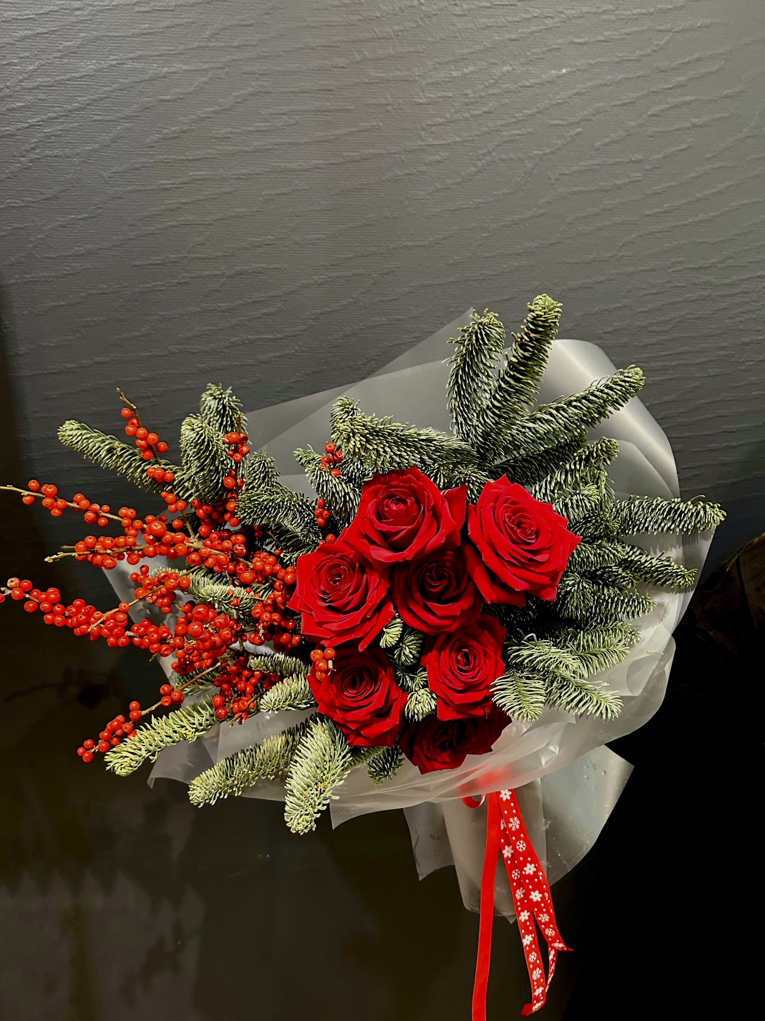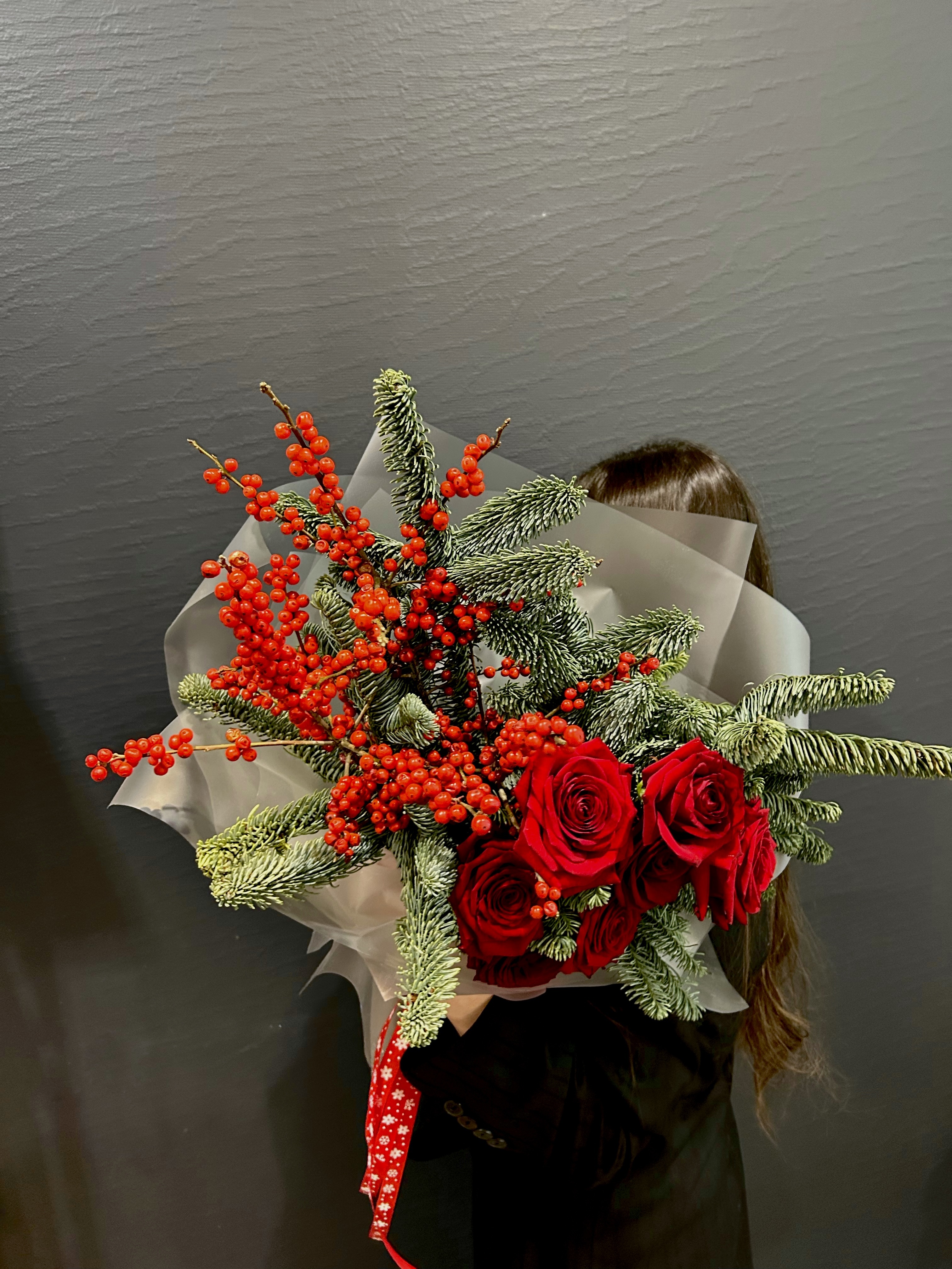 Воплощение зимнего великолепия и теплых чувств, букет "Пушистая зима" – это поэзия природы, заключенная в изысканном сочетании. В его сердце – пышные красные розы Рэд Наоми, словно капли роскошного вина, пробуждающие глубокие эмоции и страсть. Они окружены ветвями нобилиса, чьи мягкие, серебристо-зеленые иголки напоминают о вечнозеленых лесах, покрытых первым пушистым снегом. Контрастные ягоды красного илекса добавляют яркости и символизируют жизненную силу, несущуюся сквозь холодное время года.