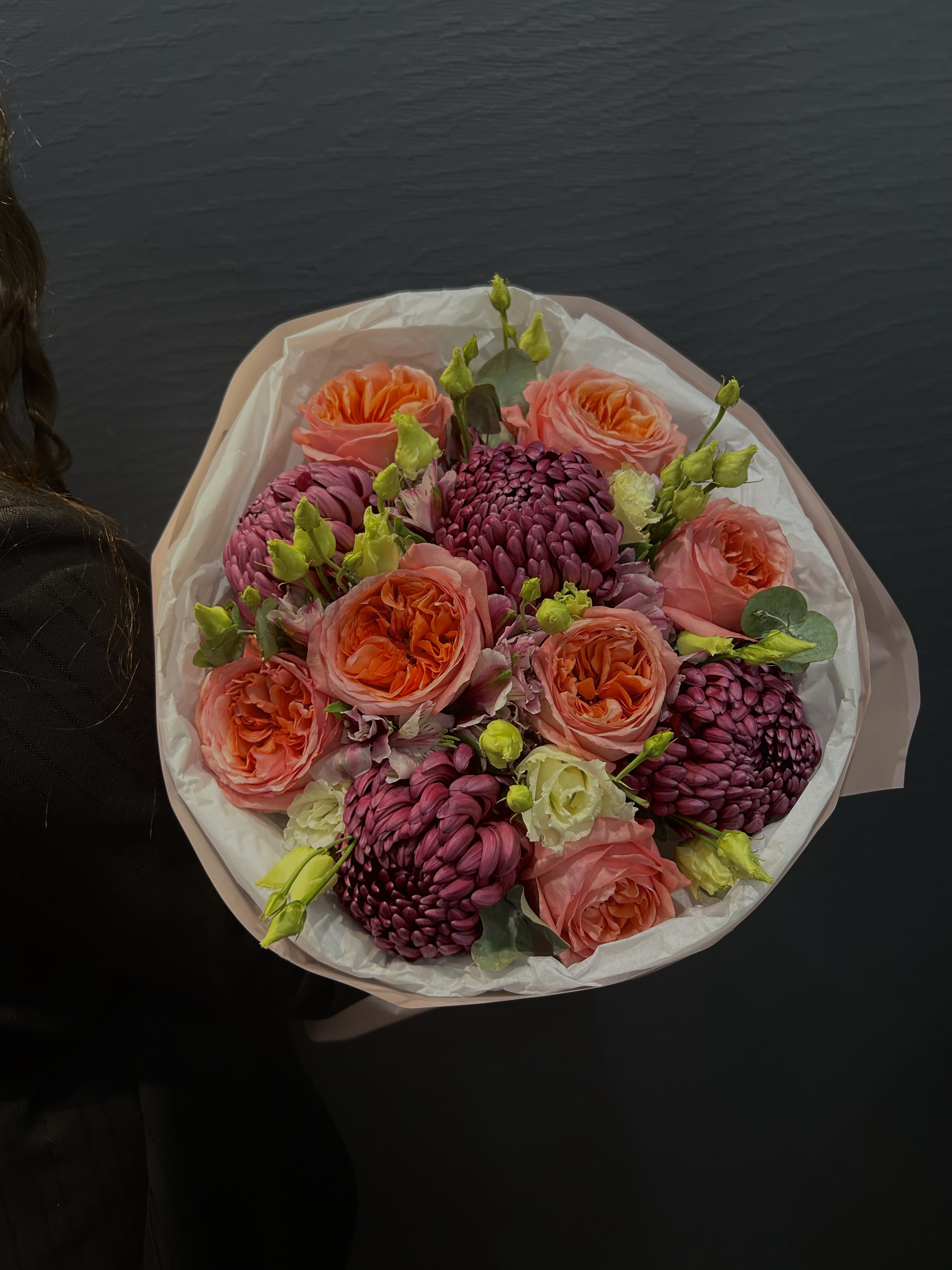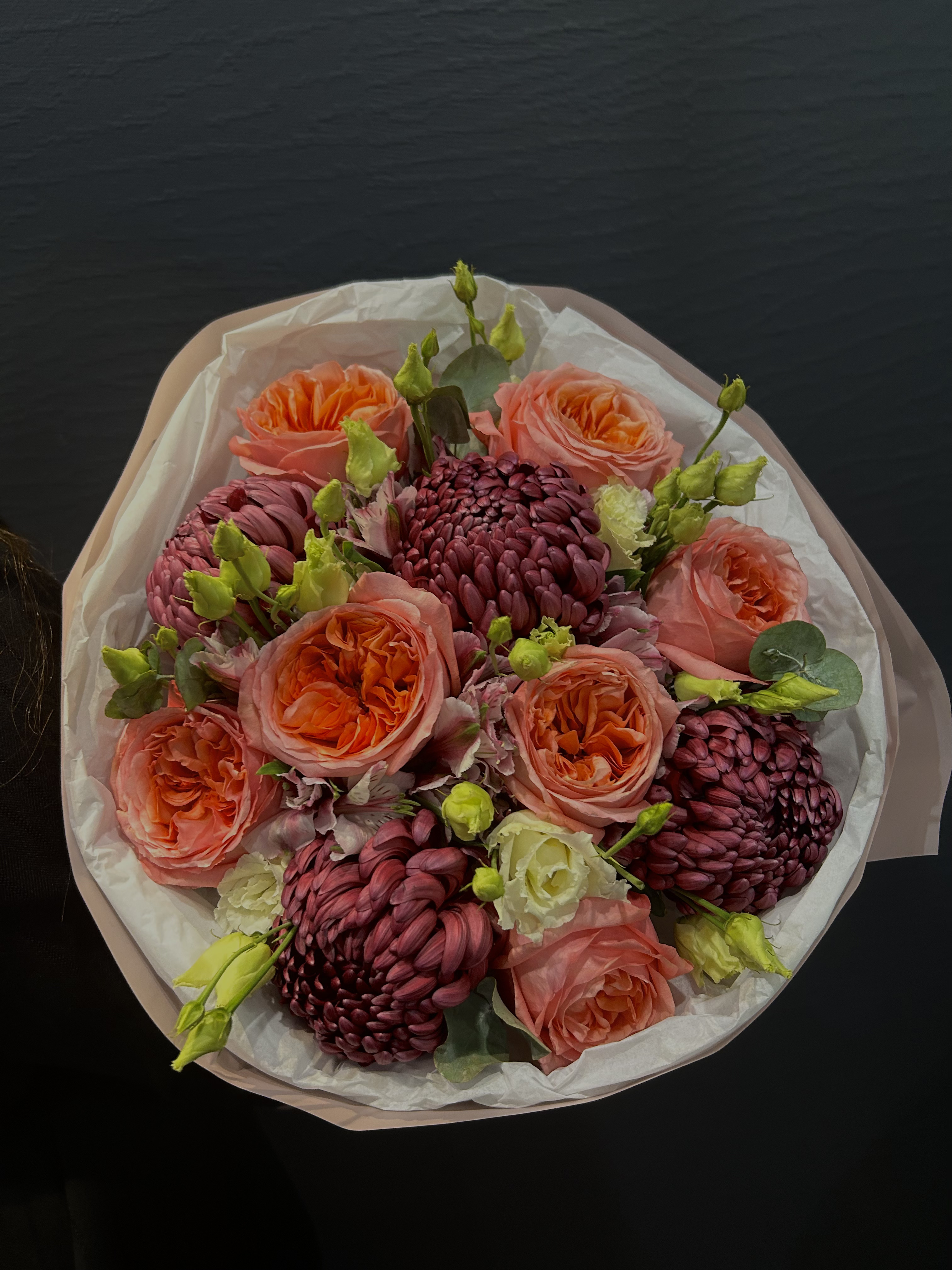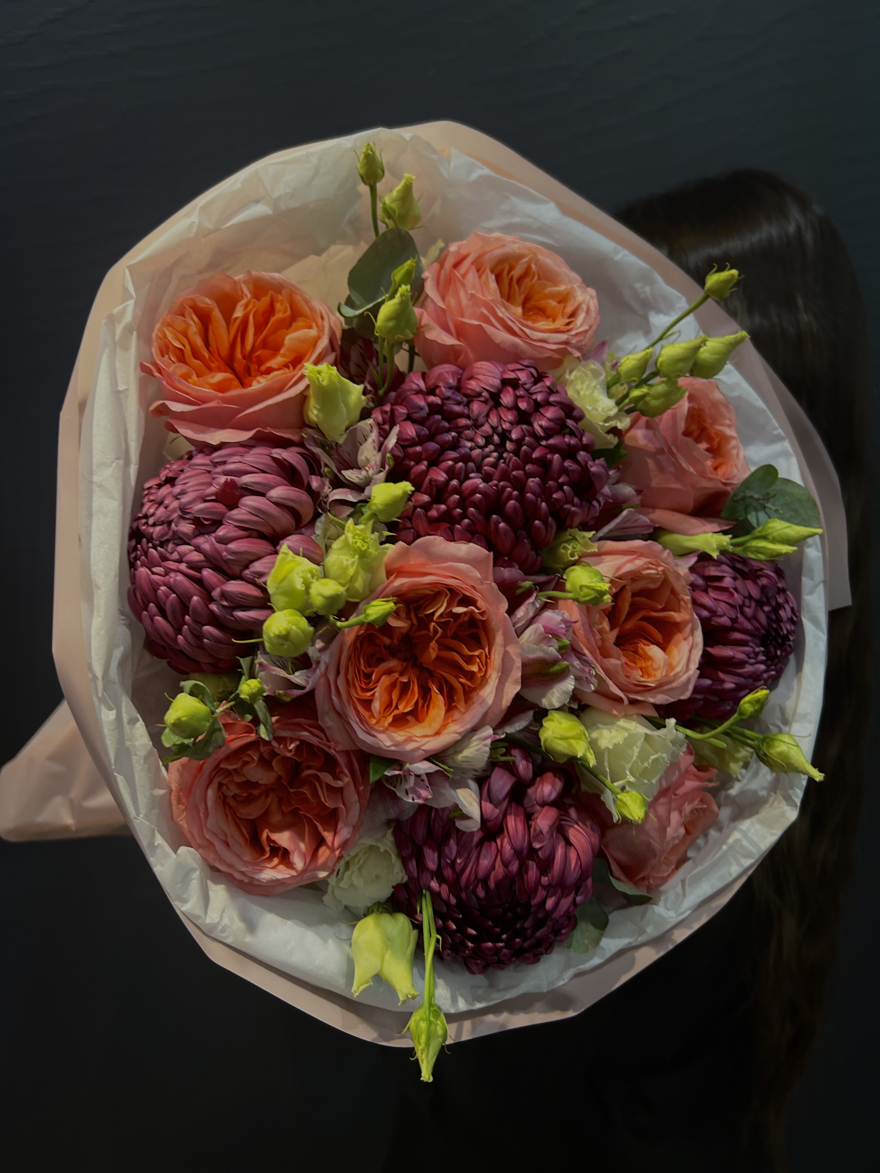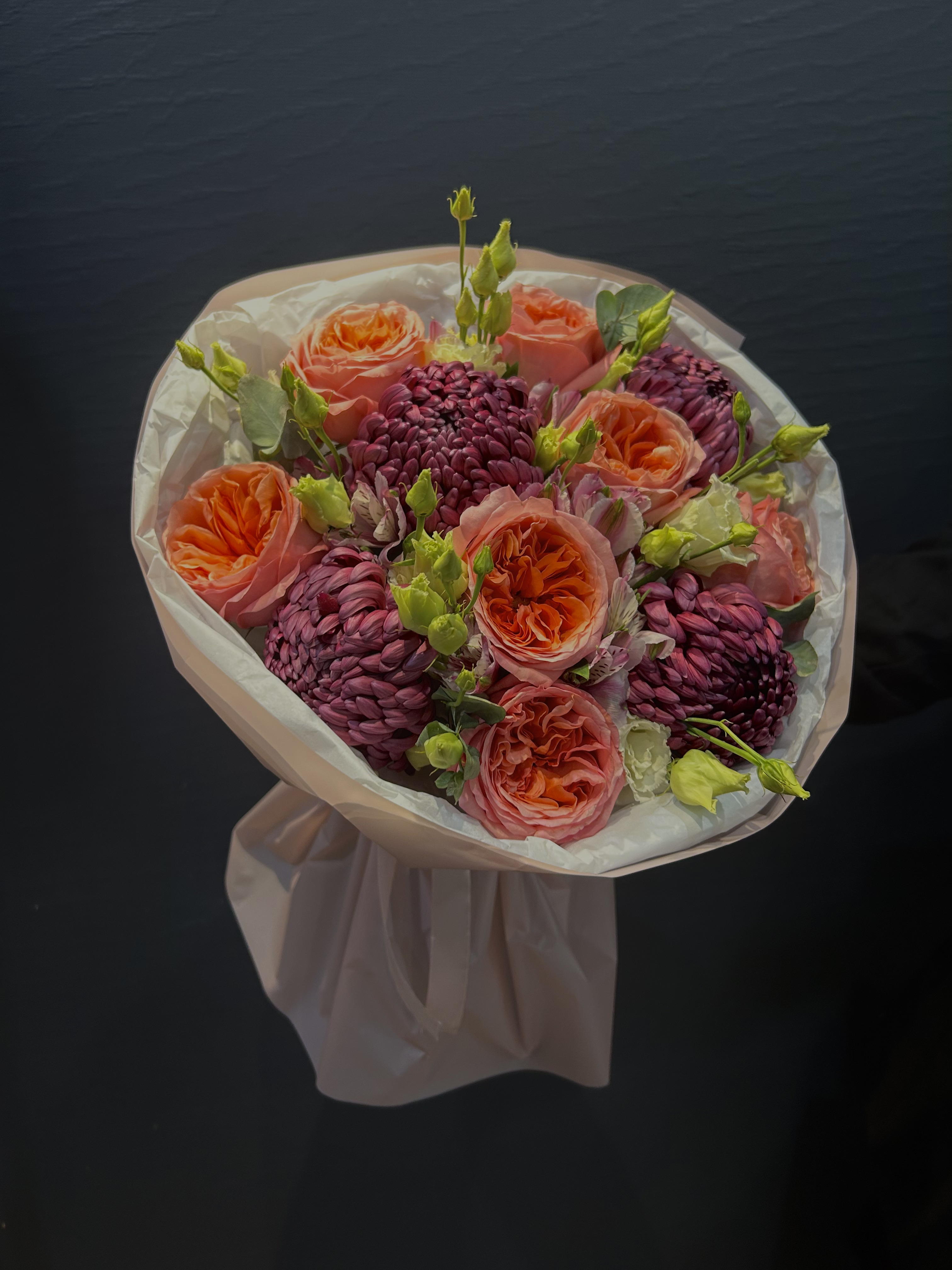 В его сердце – пионовидные розы Candy X-pression, чьи пышные, многолепестковые бутоны словно шепчут о страстной любви и сладких мечтах. Вокруг них вальсируют хризантемы Bigoudi, их изящные кудри напоминают о теплых объятиях и уютных вечерах.