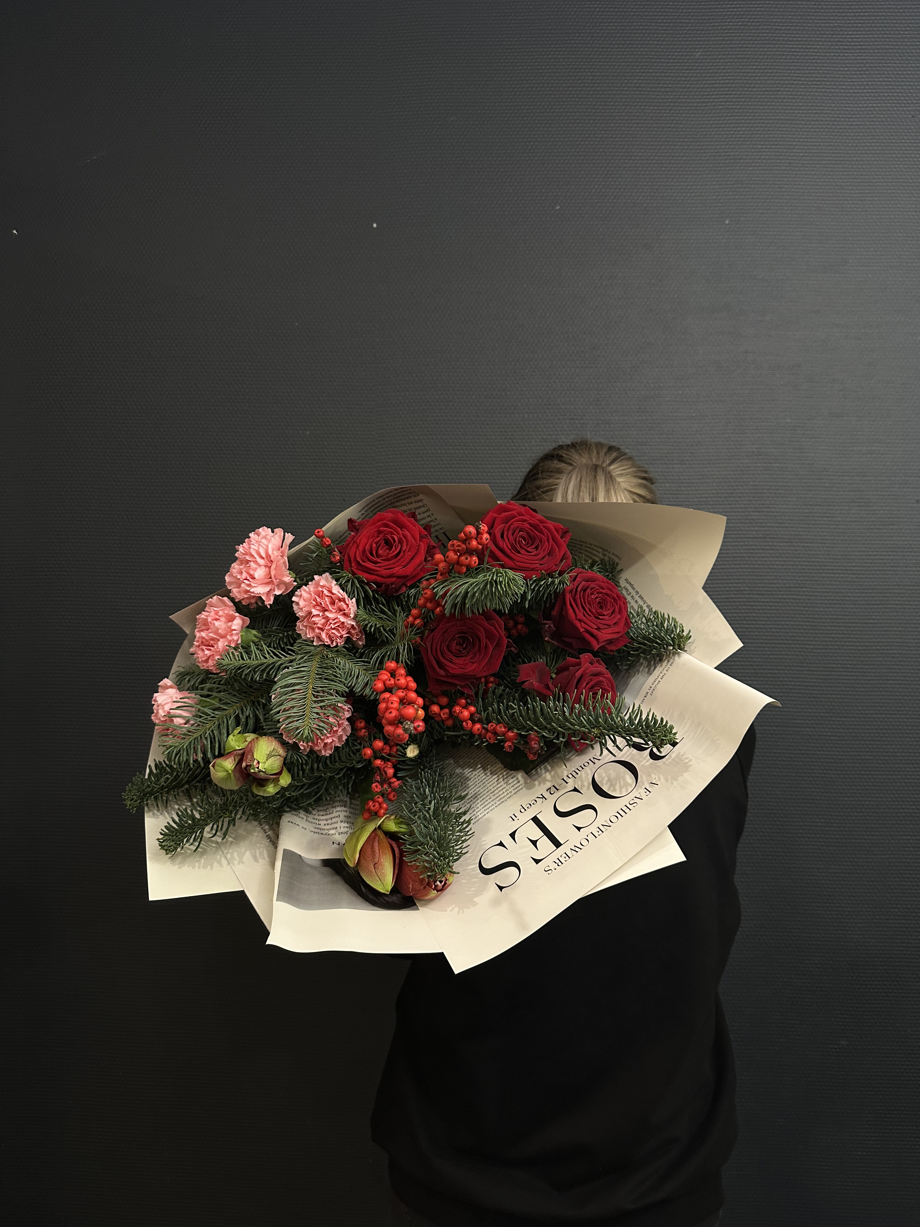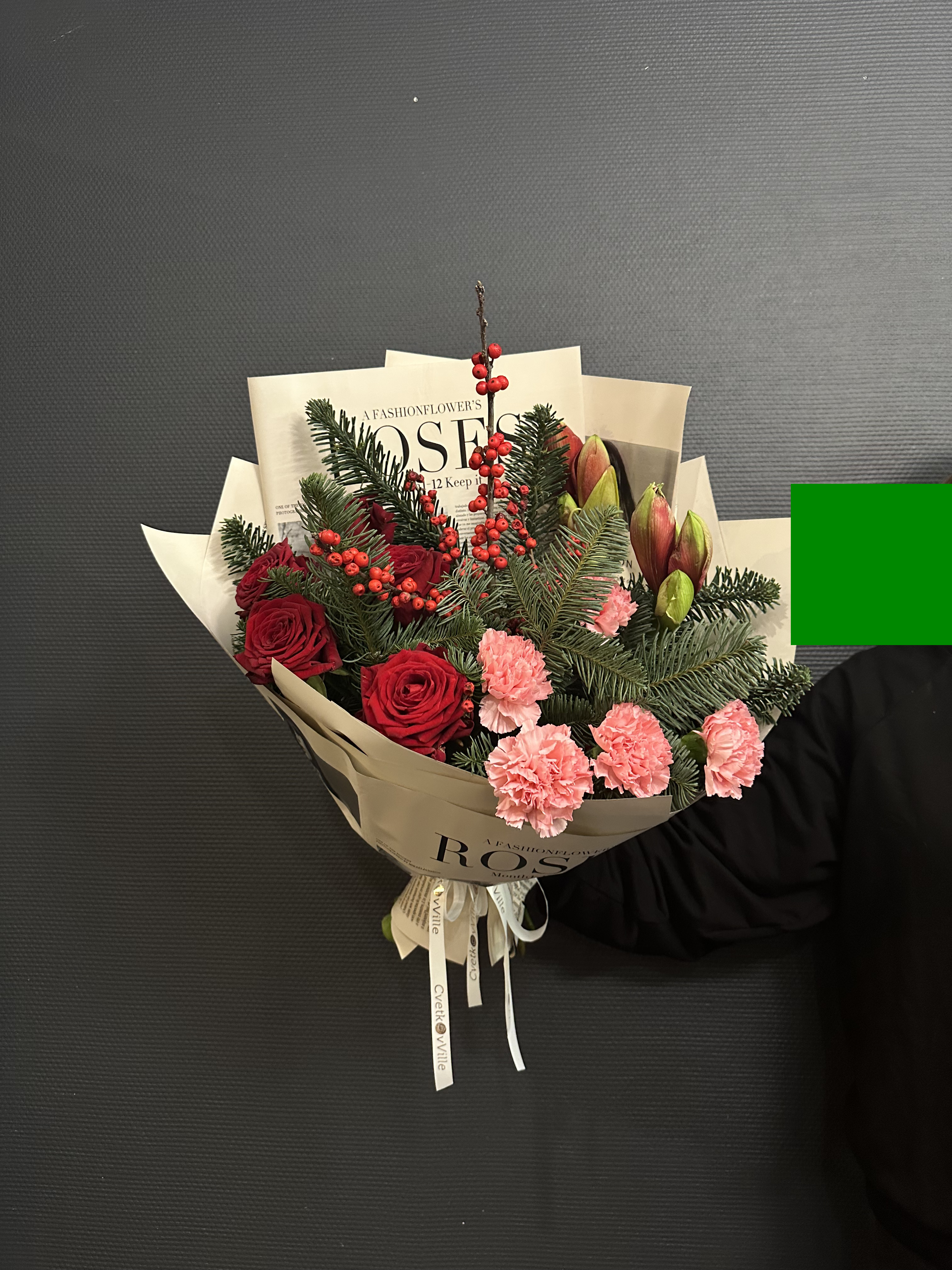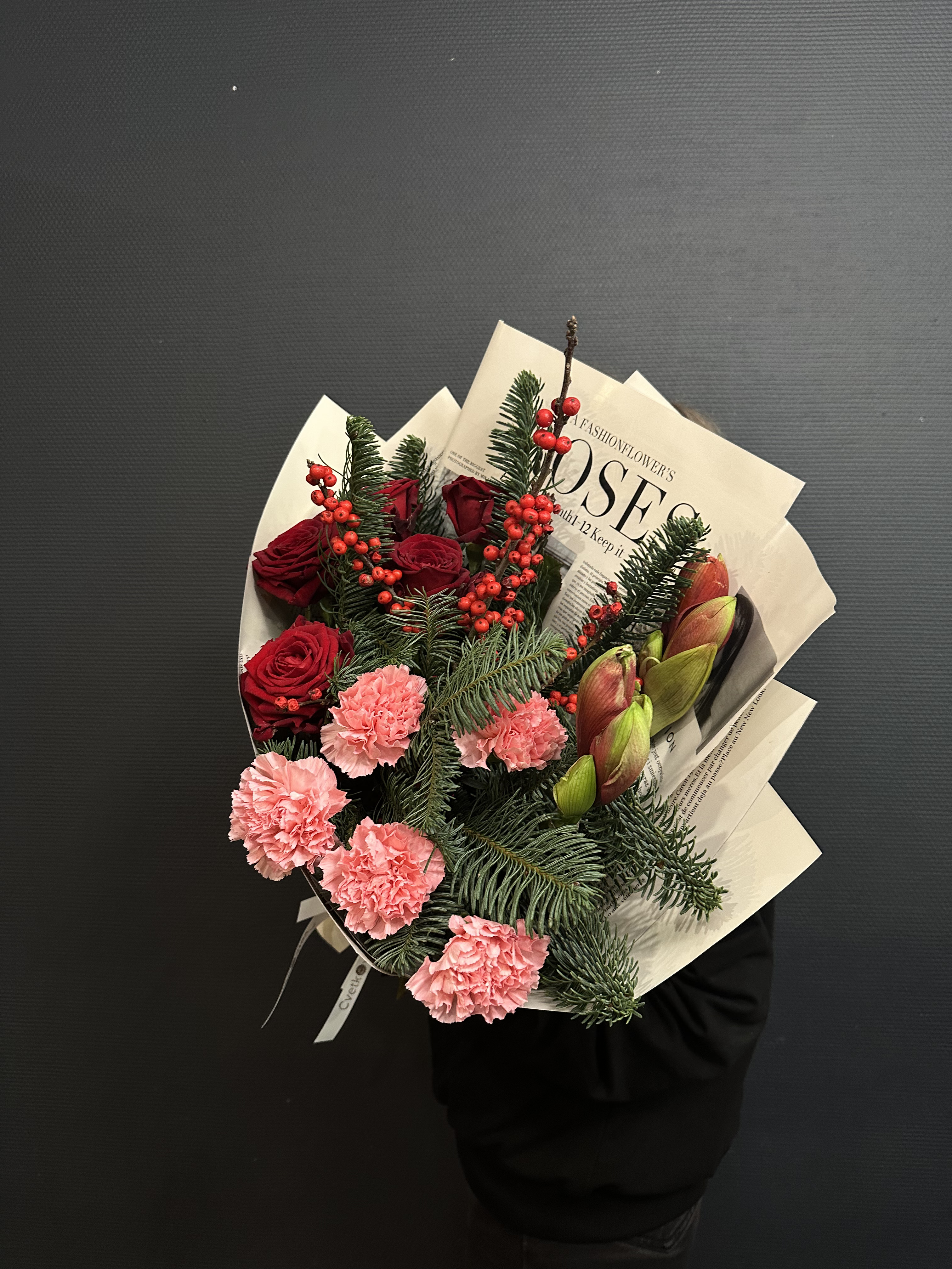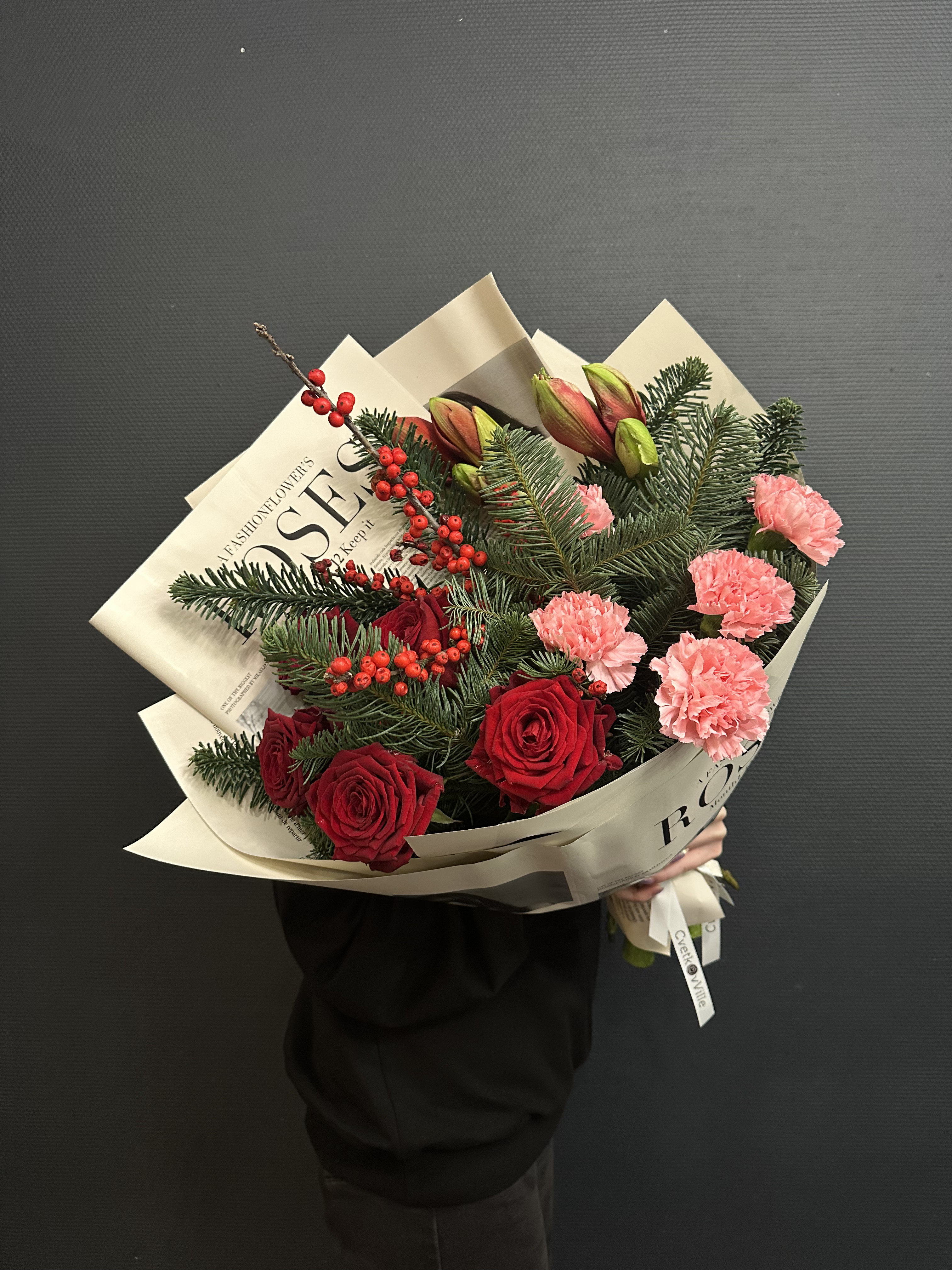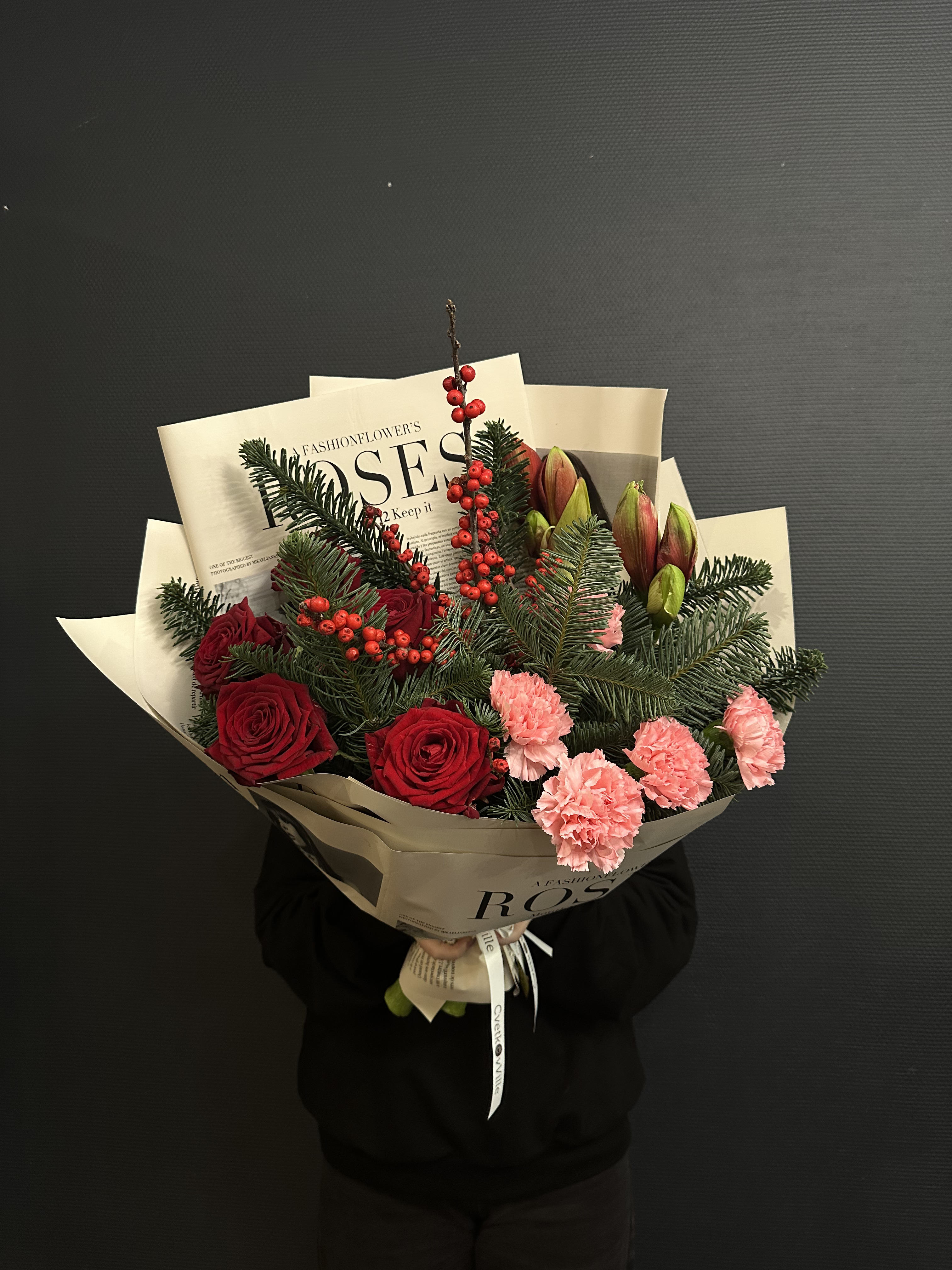 Погрузитесь в волшебство зимних праздников с "Новогодним ассорти" – эксклюзивным букетом, где каждый цветок словно взят из роскошной ёлочной гирлянды. Элегантный нобилис, вечнозелёный символ праздника, создаёт пышную основу, наполненную ароматом свежей хвои. Красные амарилисы, как рубиновые фонарики, вносят тепло и уют, а их бархатистые лепестки – это обещание новогоднего чуда. Илекс, с его яркими красными ягодами, добавляет букету нотку традиционного украшения, а розы Рэд Наоми, словно сотканные из самой ночи, придают композиции глубину и страсть. Розовые диантусы, мягкие и нежные, словно первый снег на розовых щеках зимы, вносят игривость и лёгкость. "Новогоднее ассорти" – это не просто букет, это ключ к сердцу зимней сказки, где каждый цветок – это слово в рассказе о волшебстве и ожидании чуда.