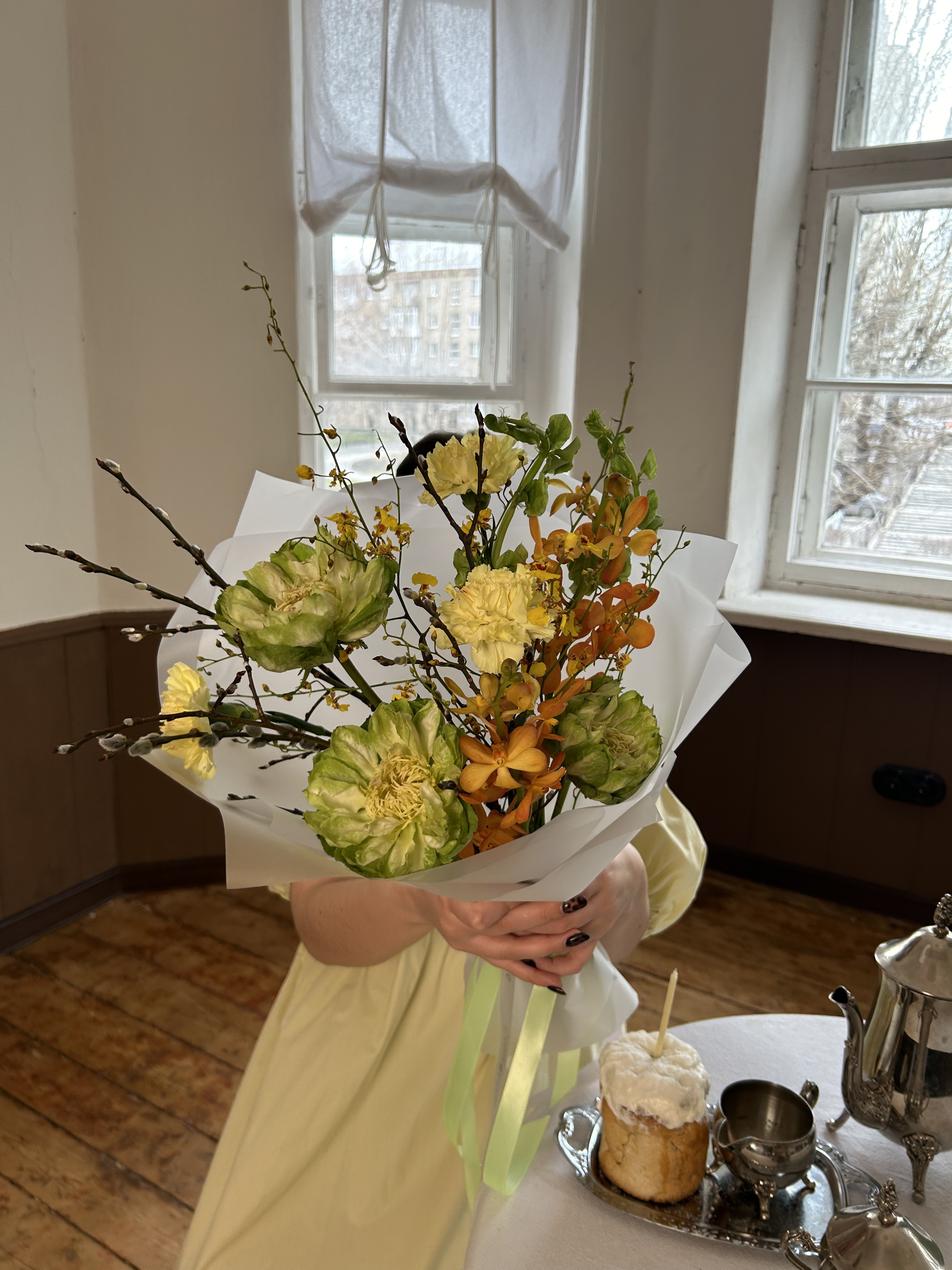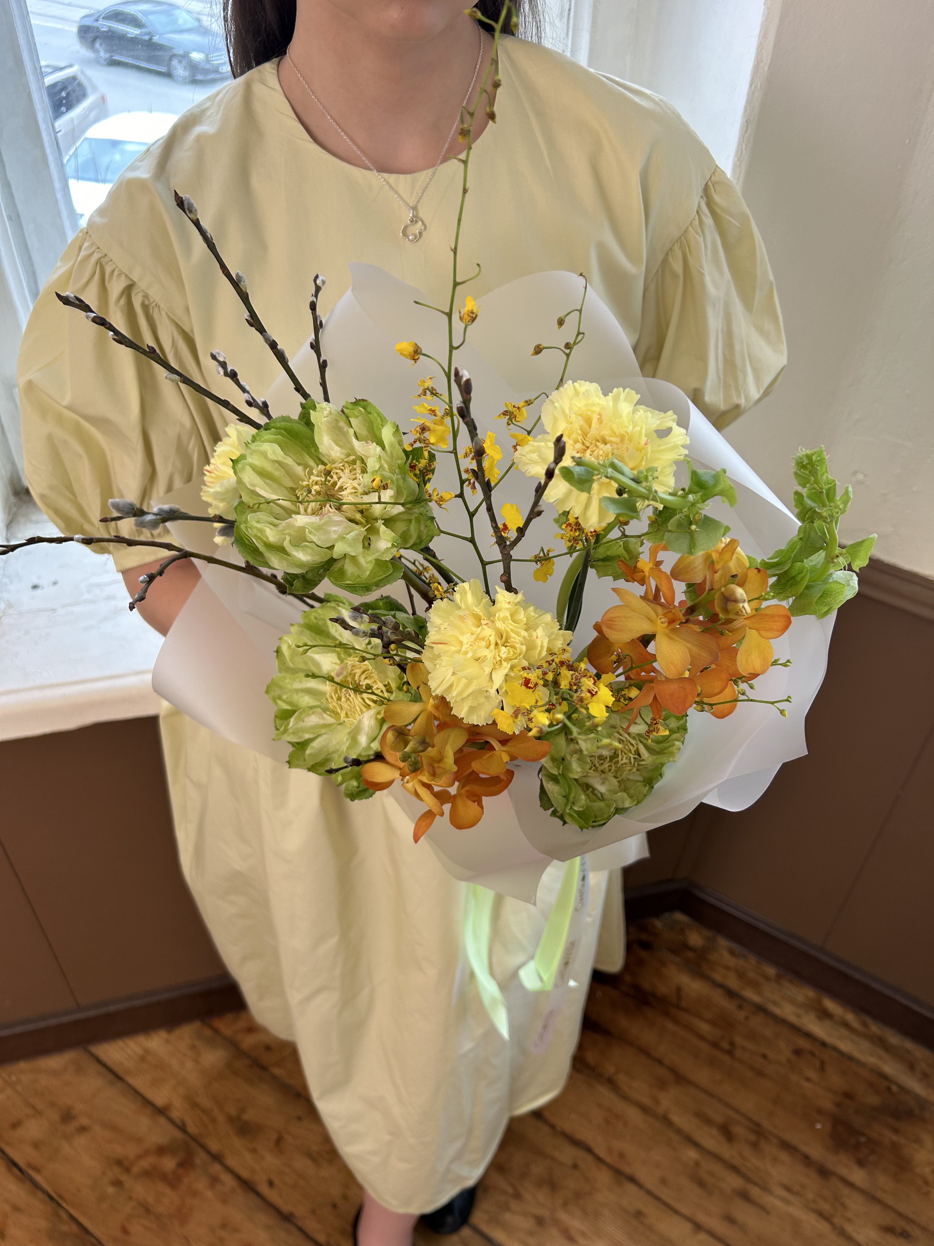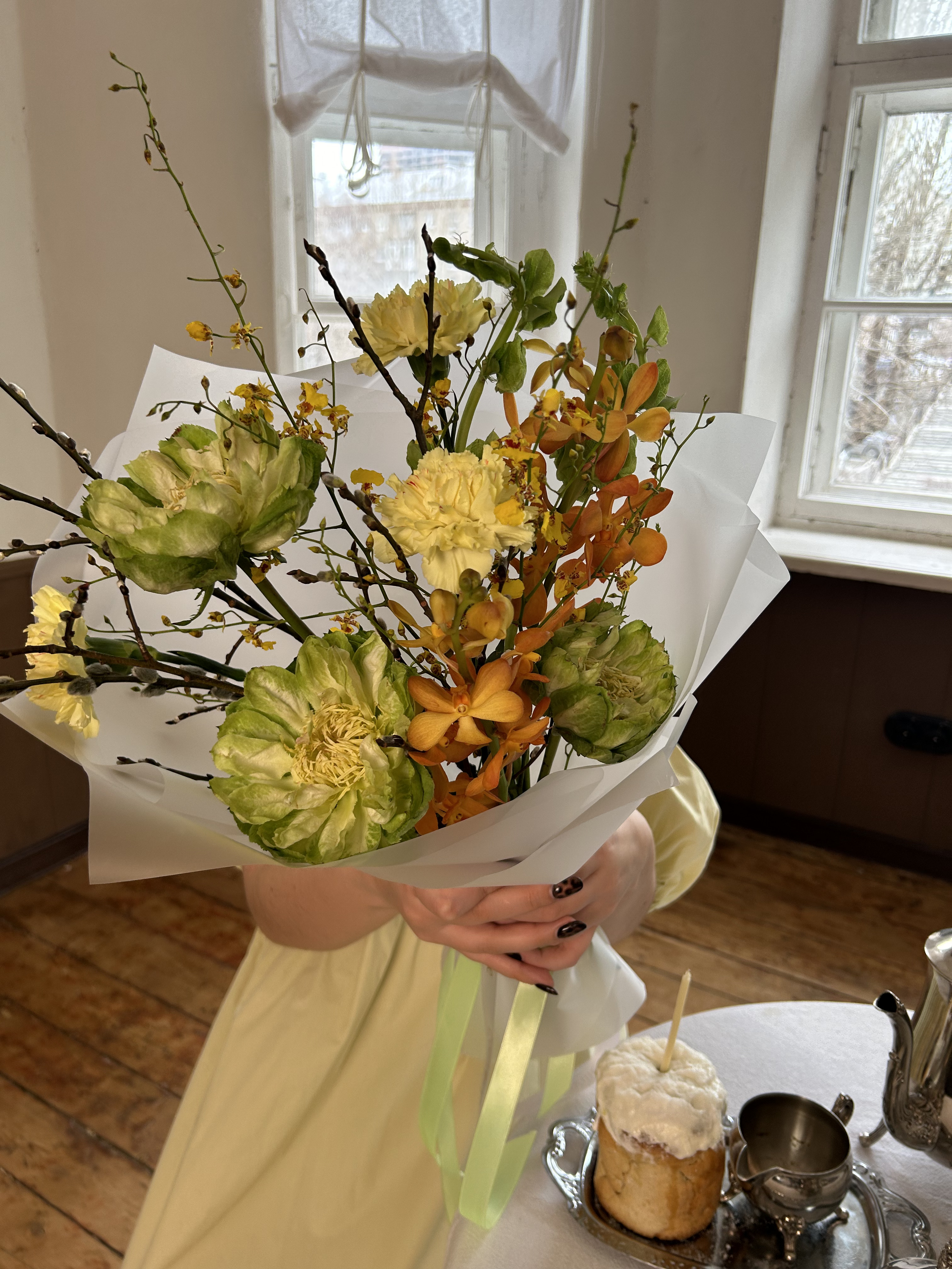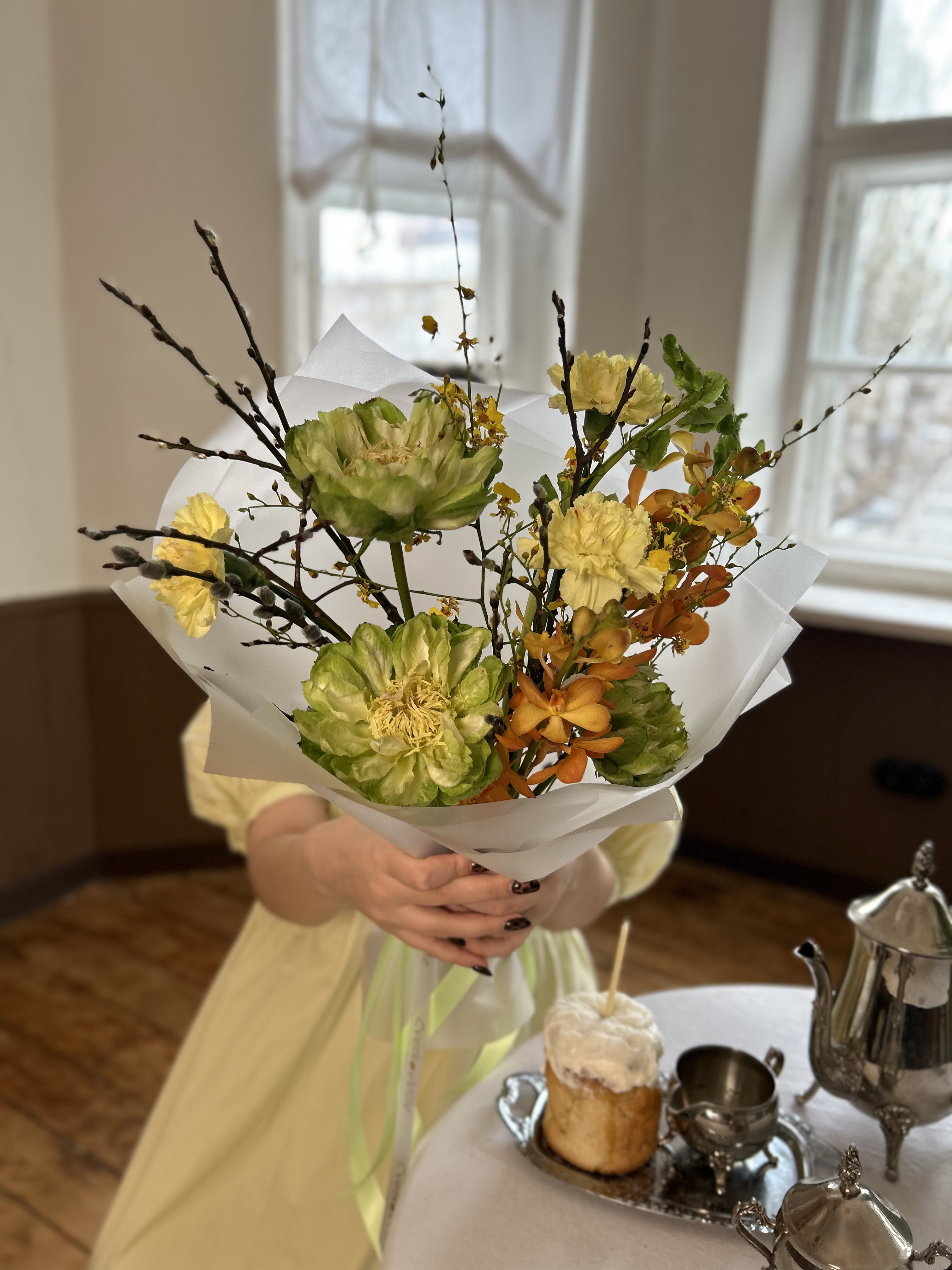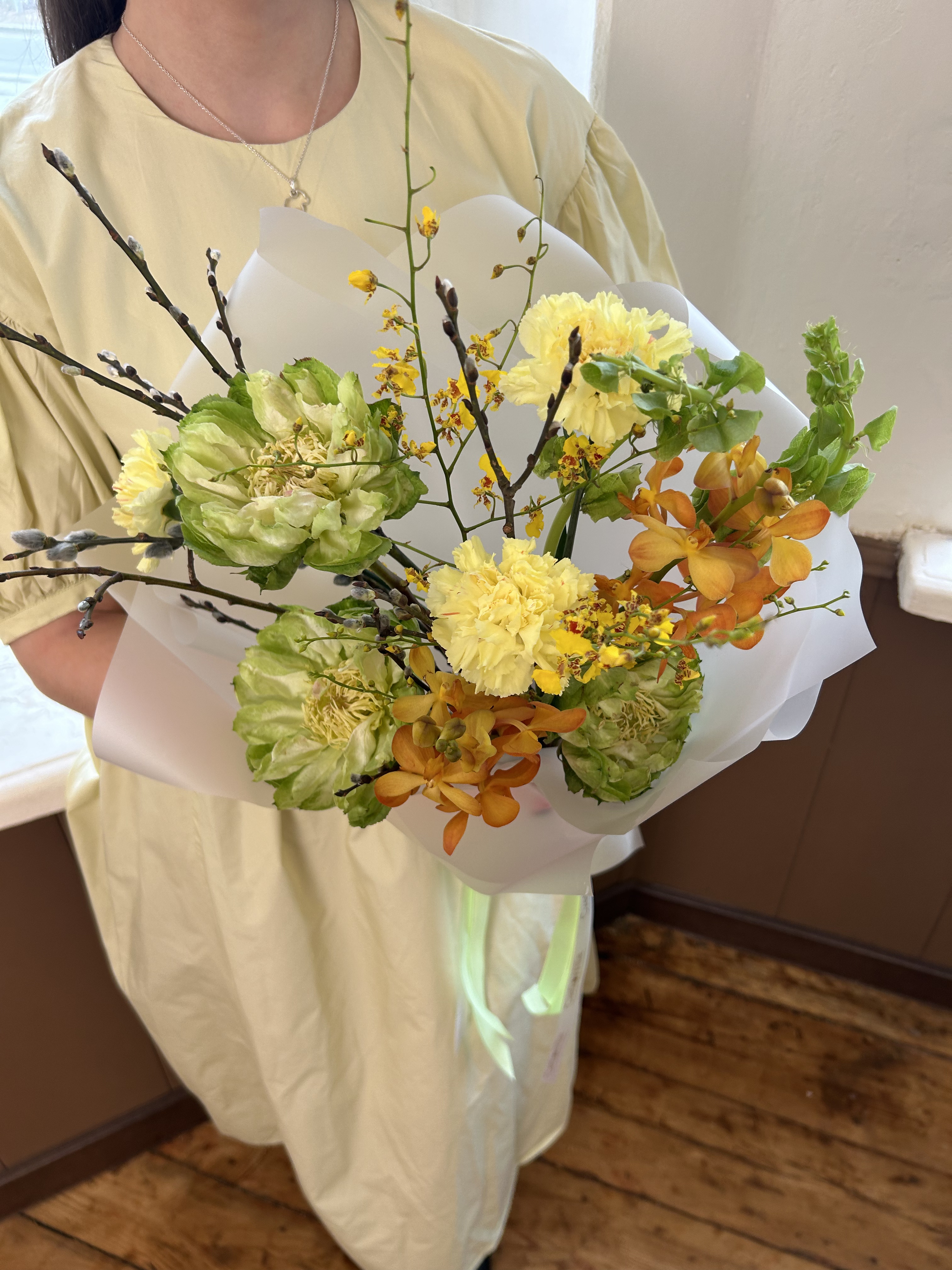 Верба — 4 шт., Орхидея онцидиум — 2 шт., Диантус цветной — 3 шт., Упаковка для цветов — 1 шт., Молюцелла — 2 шт., Роза Эквадор сорта Вегги (Veggie) — 3 шт., Лента атласная — 1 шт., орхидея мокара — 2 шт.