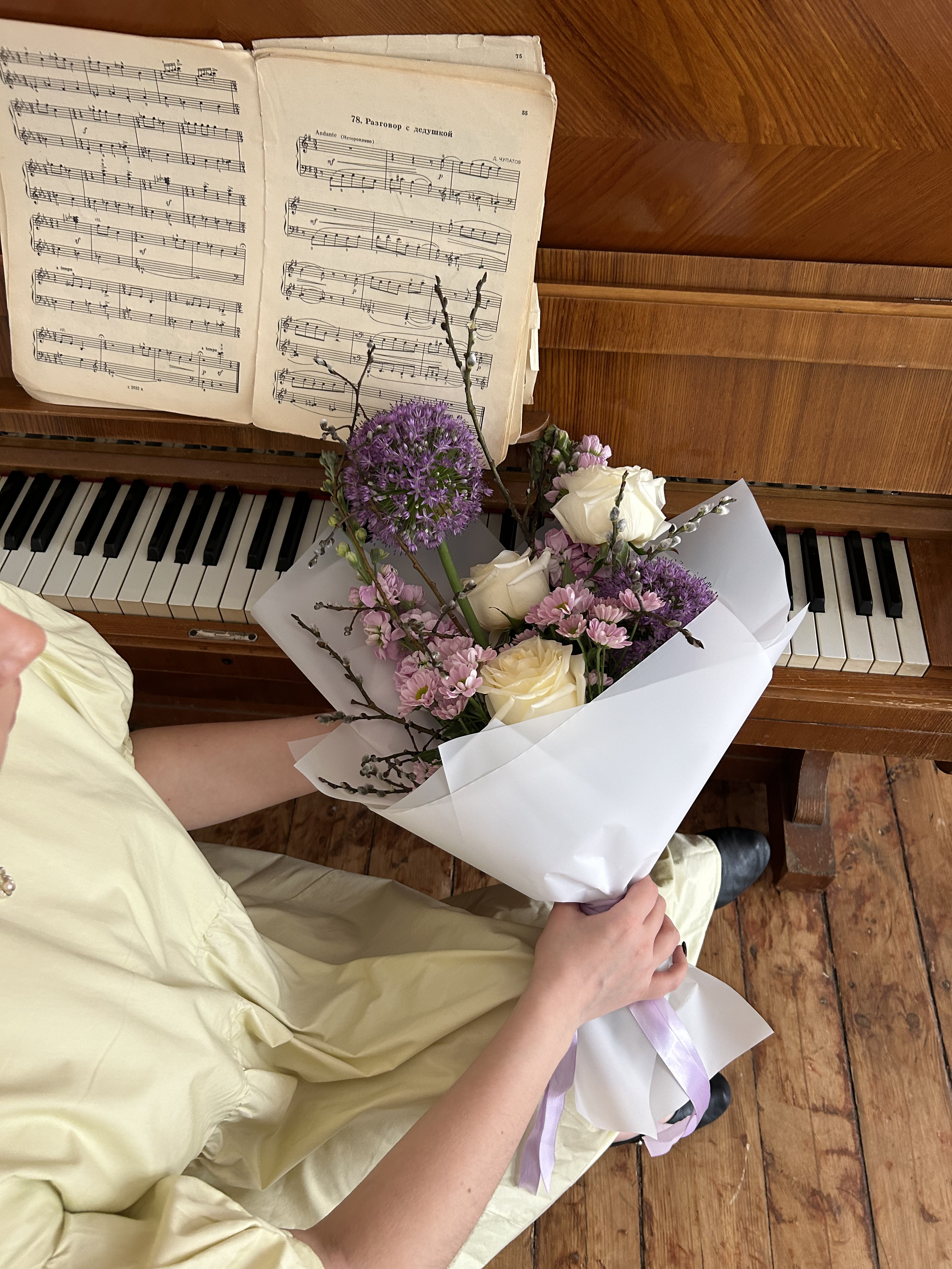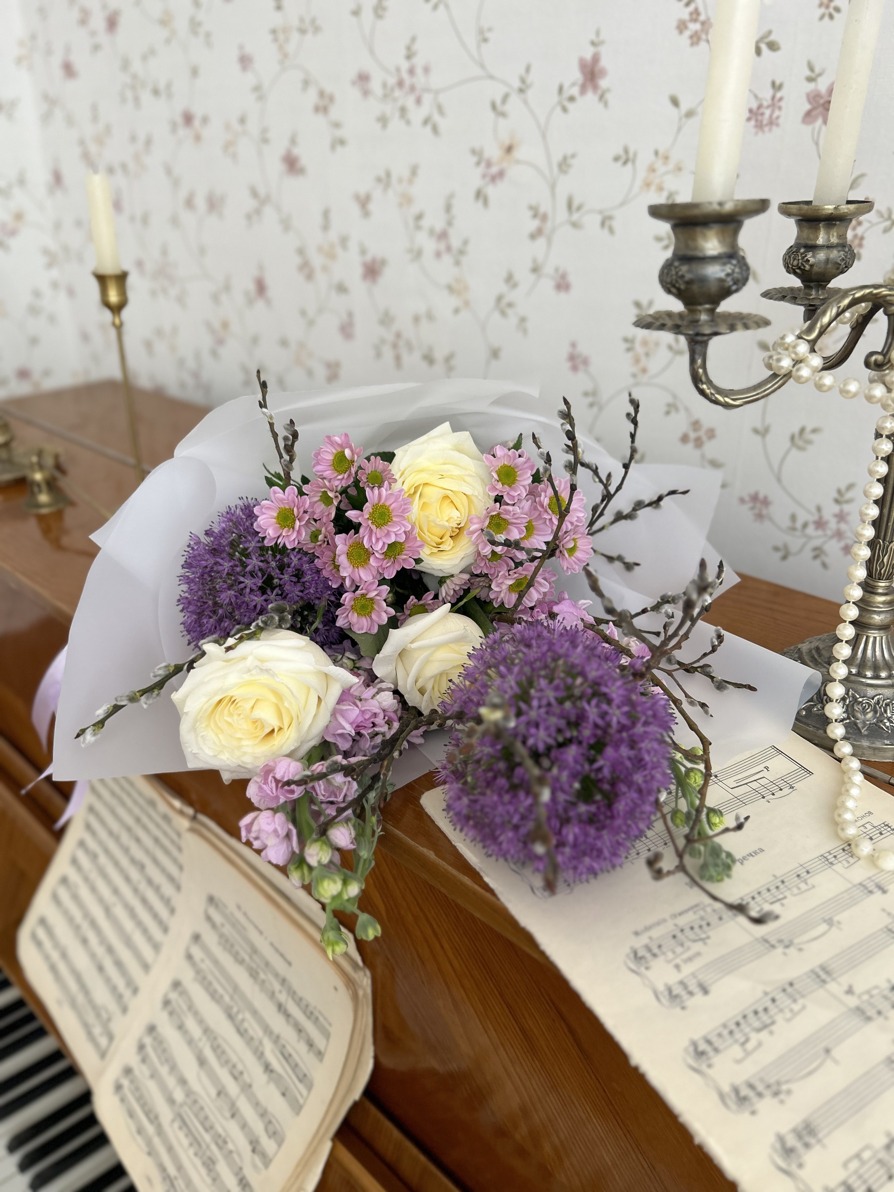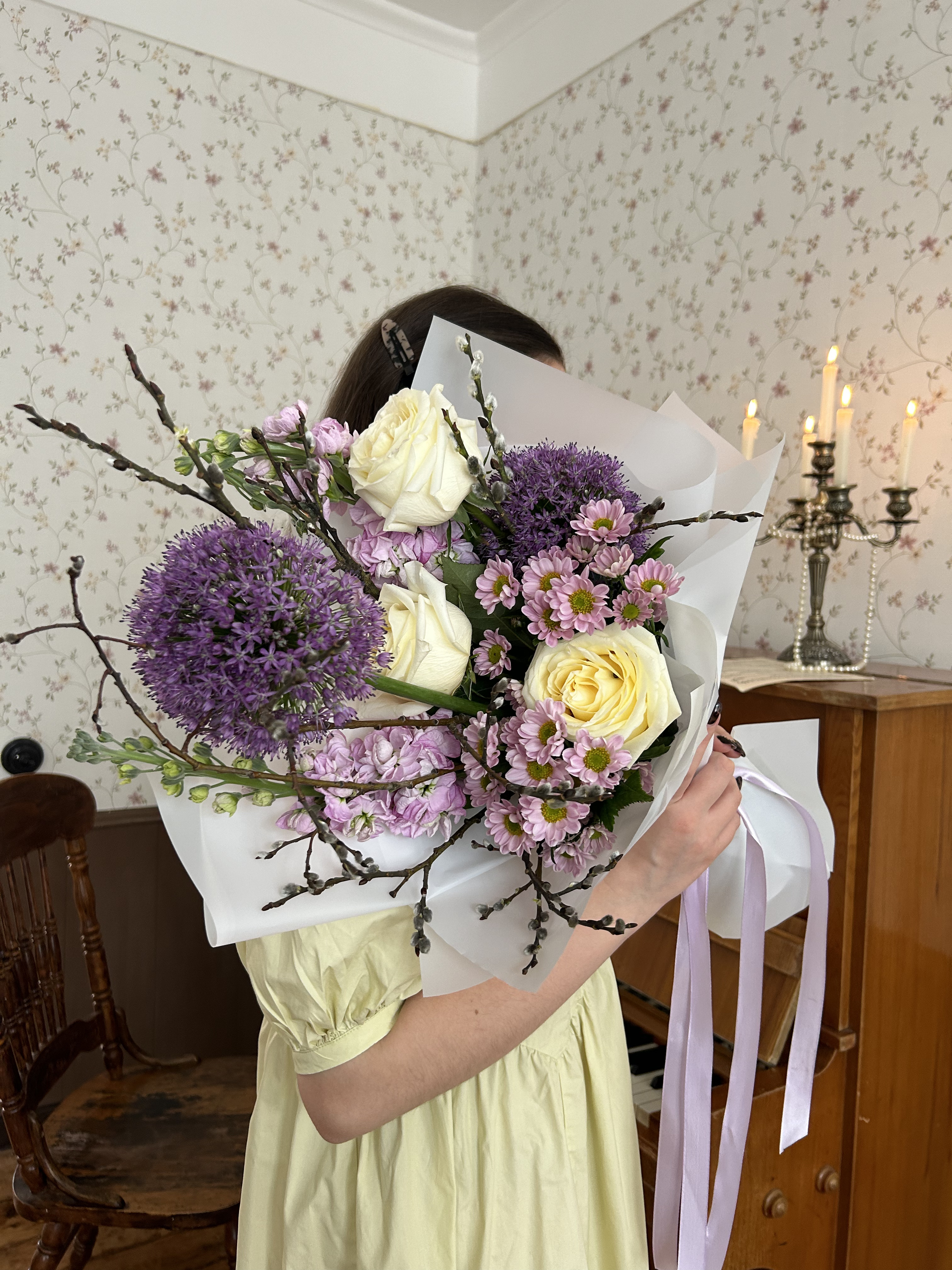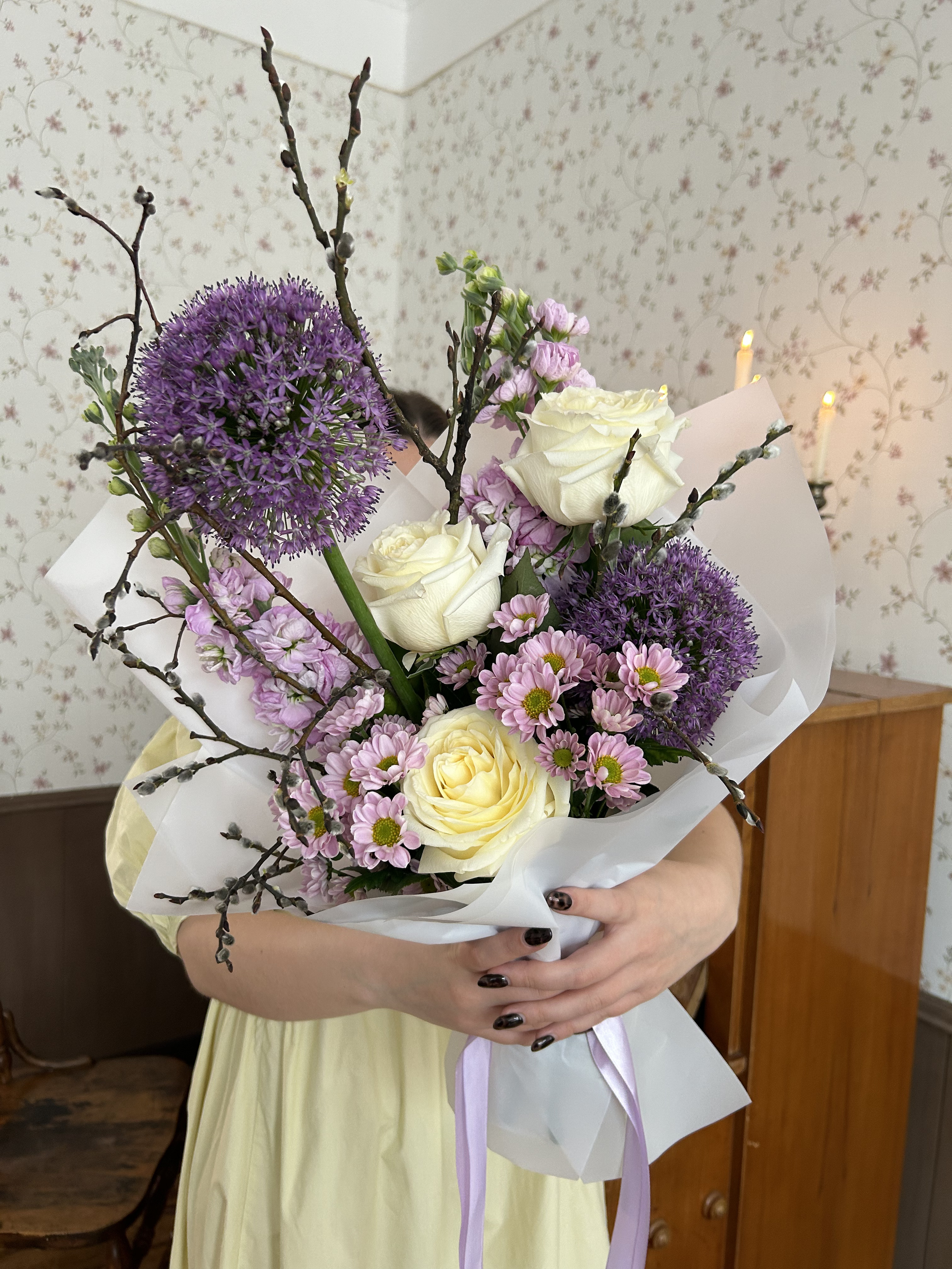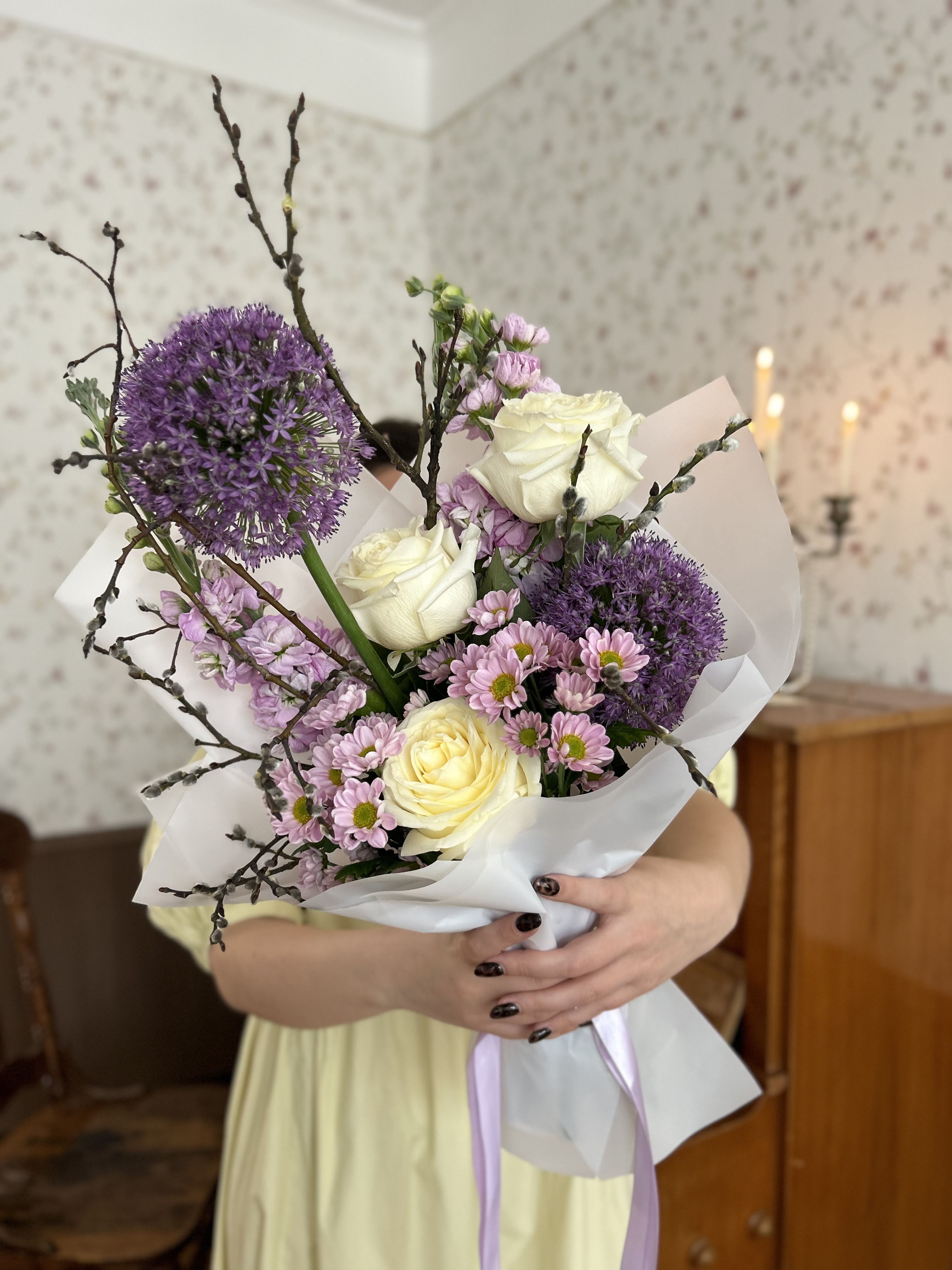 Верба — 5 шт., Роза Эквадор сорта Кэндллайт(Candlelight) 50см — 3 шт., Упаковка для цветов — 1 шт., Лента атласная — 2 шт., Матиола — 2 шт., Аллиум — 2 шт., Хризантема сорта Сантини(Santini) — 2 шт.