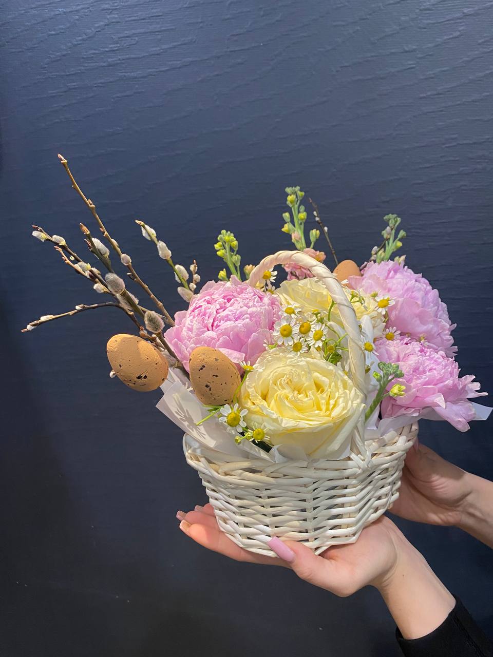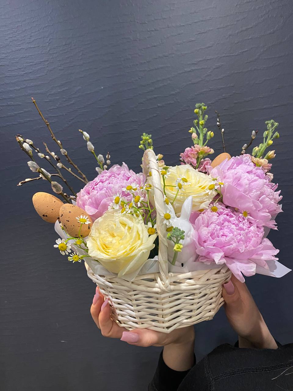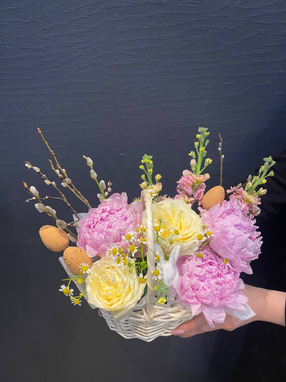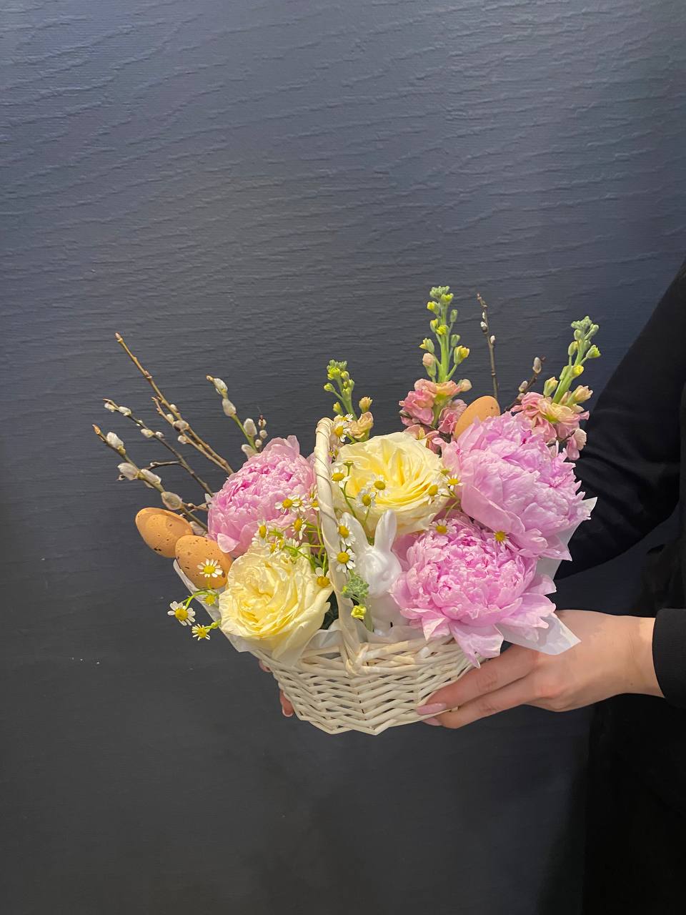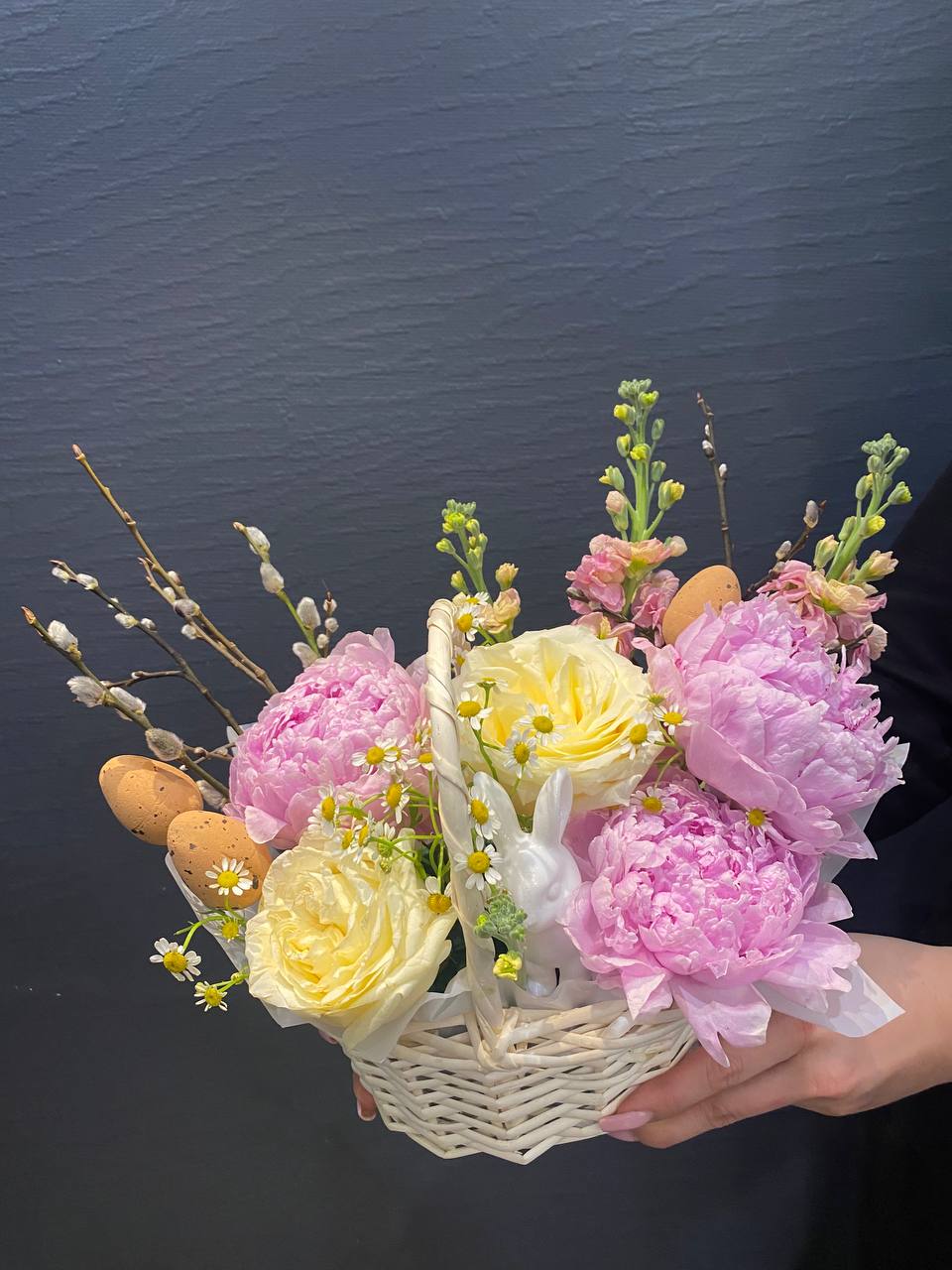 "Пасхальная композиция в корзинке 'Пасхальный кролик'" — это очаровательное воплощение весеннего тепла и пасхальной радости. В мягкой корзинке собраны пышные пионы, свои яркостью и объемом символизирующие любовь и обновление, а нежные полевые ромашки добавляют нотки простоты и искренней красоты природы. Маттиола придает композиции изысканность, а веточки вербы — традиционную пасхальную символику, олицетворяющую пробуждение жизни. Всё вместе создает милое и радостное настроение, идеально подходящее для праздничного настроя или отличного подарка. Эта композиция — словно милый пасхальный кролик, уютный и веселый, наполняющий дом светом, теплом и добротой. Она напомнит о важности весеннего пробуждения и любит вас своими яркими красками и трогательной душевностью.